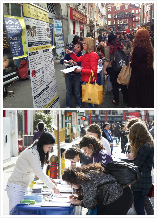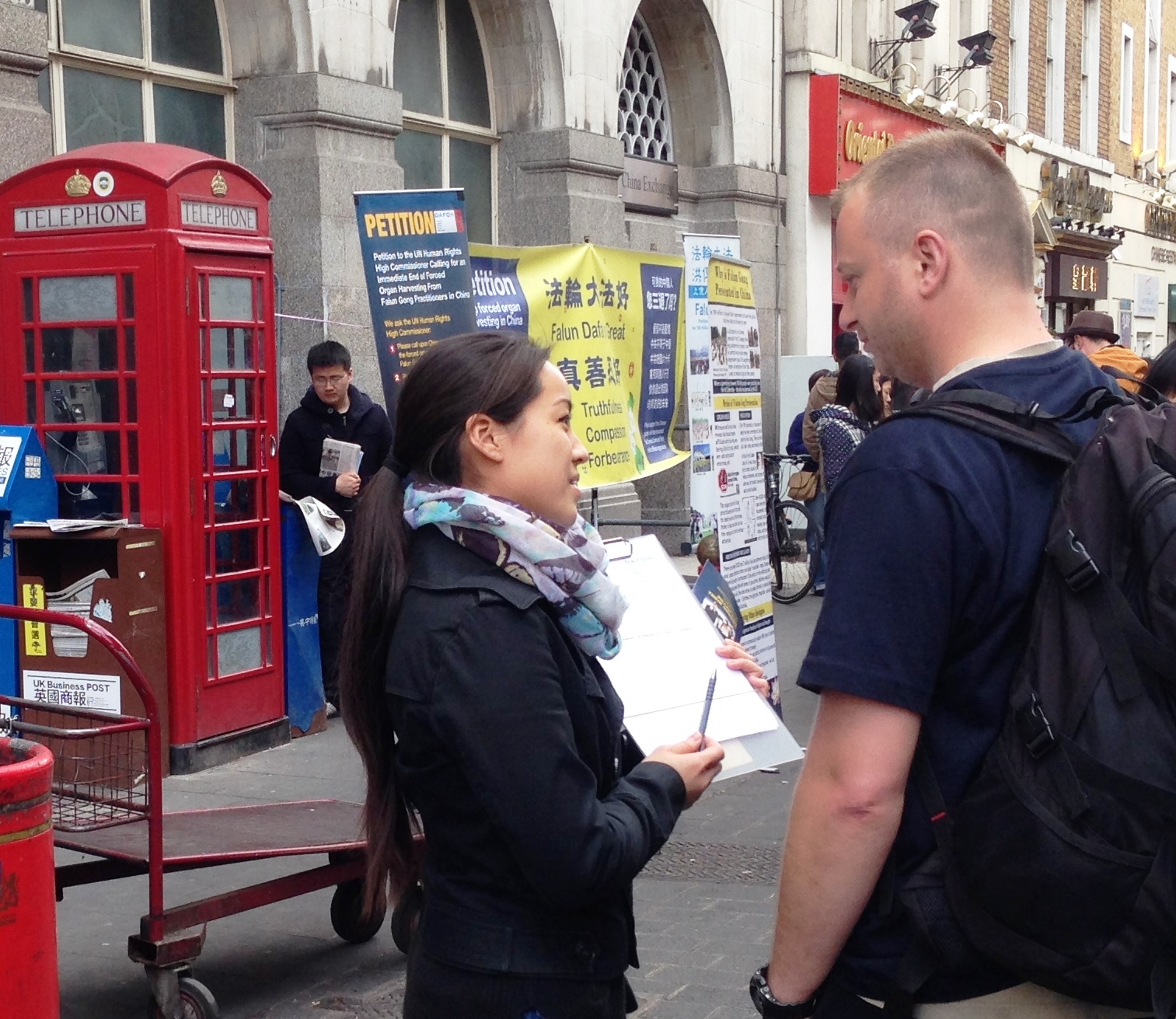 在妈妈的鼓励下,郝丽拿起反迫害征签板,开始尝试着向唐人街上来来往往的英国民众和国际游客讲真相,一会功夫就签了七、八个。问她是否知道“四•二五”的意义,郝丽谦虚地表示她是个新学员,只知道是个重要的纪念日,但她认为法轮功学员坚持讲真相很重要, 因为“需要让每一个人了解这个(中共的)丑闻”。虽然有点紧张,但看到人们签名要求制止活摘器官罪恶,她感到高兴。