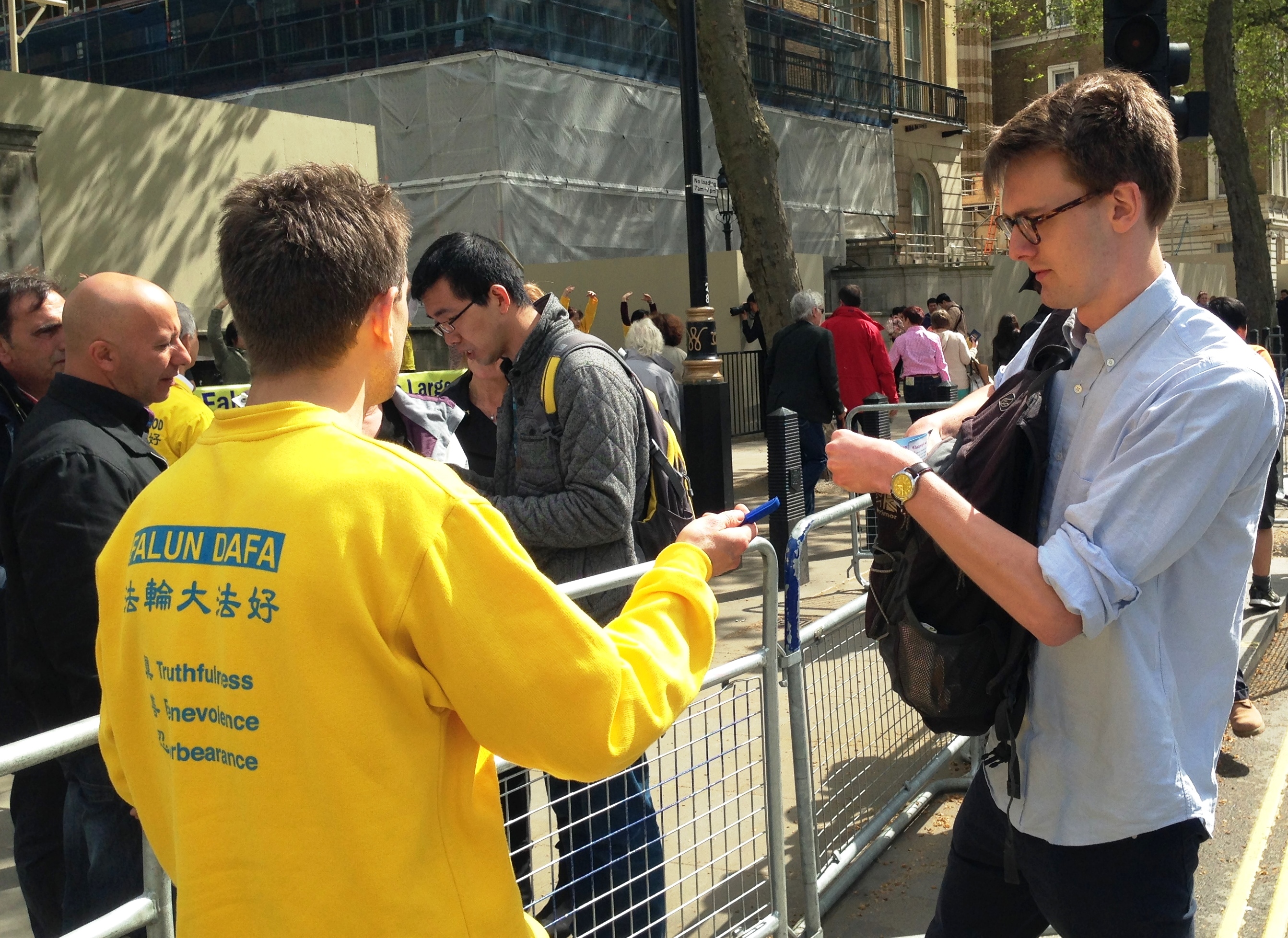 ![]() 图9:来自伯明翰的学心理的大学生理查德路过首相府,驻足了解法轮功真相后,在征签表上签字并表示感谢 |