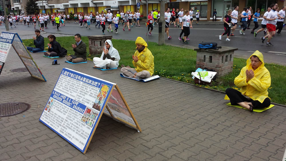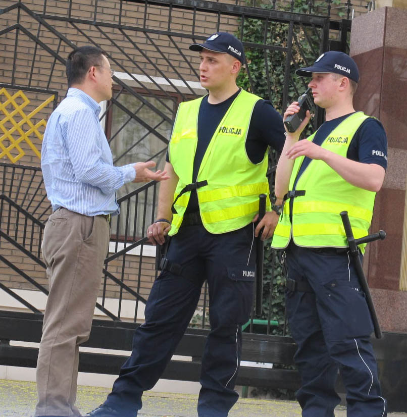 二十六日上午,当法轮功学员冒雨来到中使馆门前时,正逢华沙举办十公里马拉松竞赛,警察在封禁的路口破例放行法轮功运送展板的车辆。这万人马拉松也成为了法轮功学员中使馆门前静坐的历史见证人。