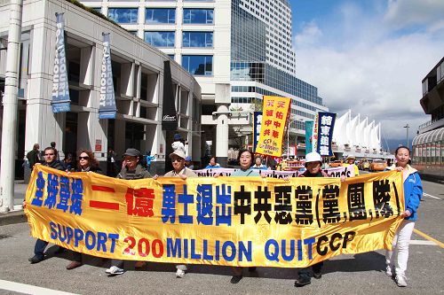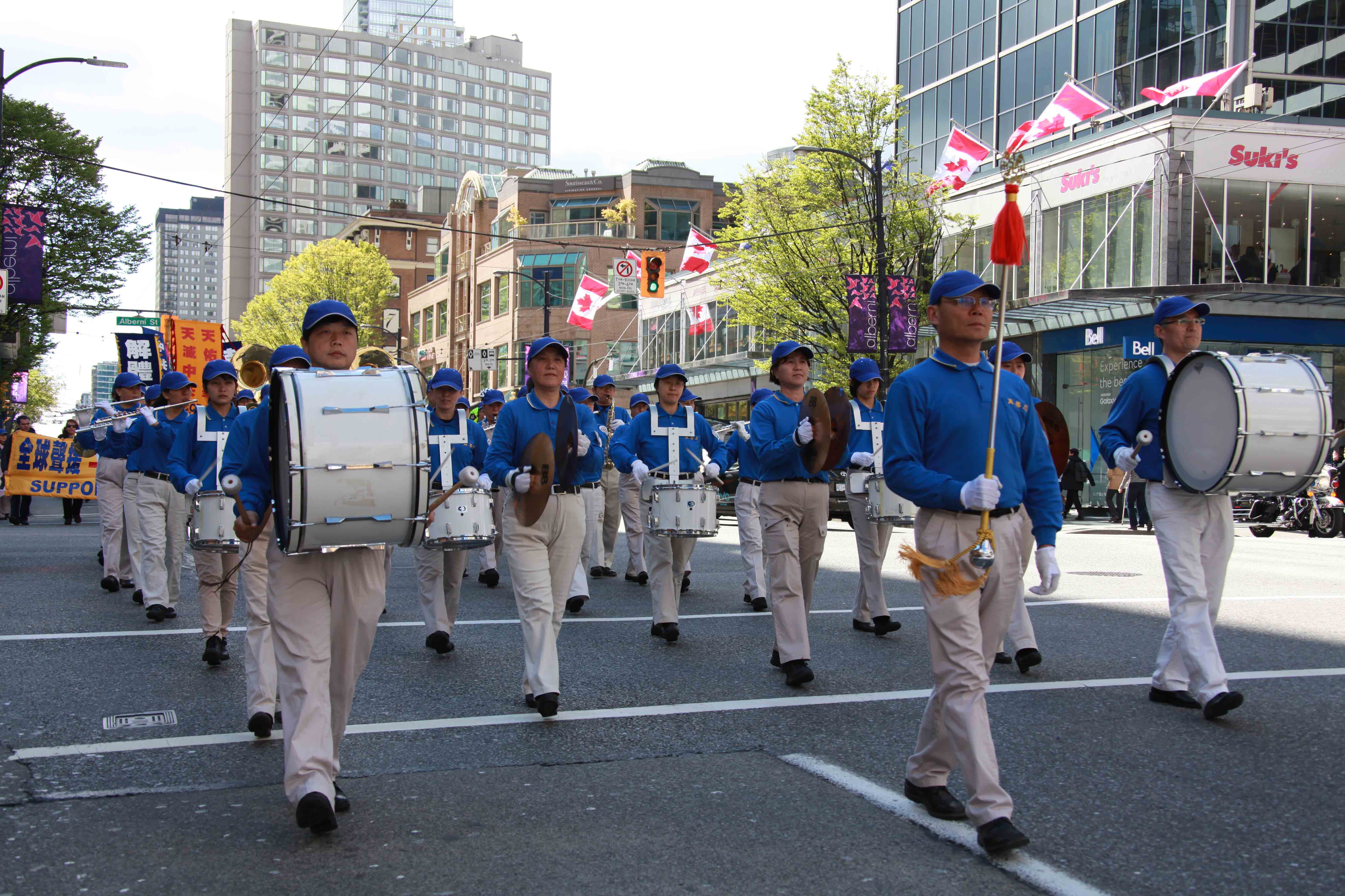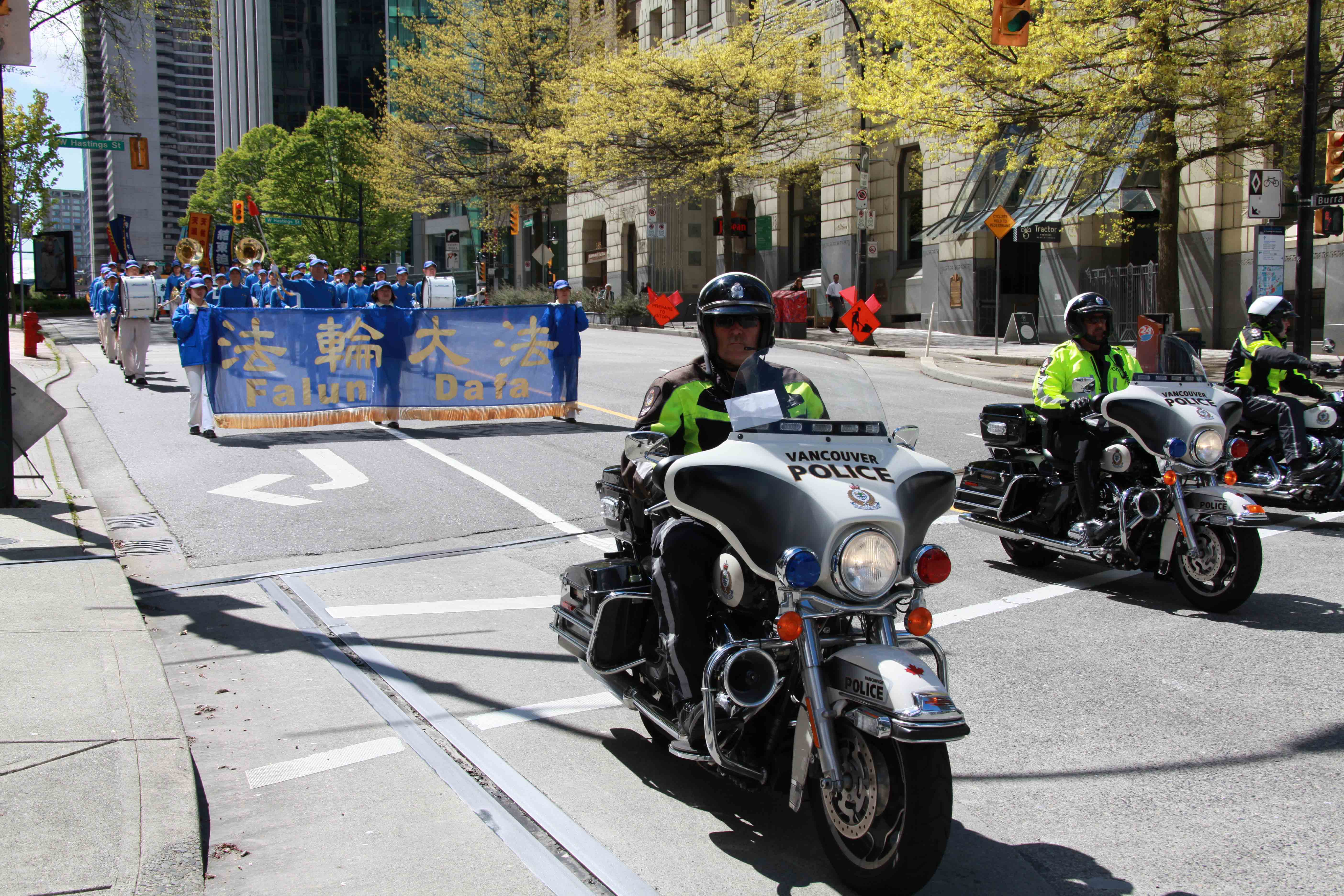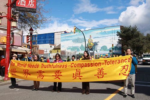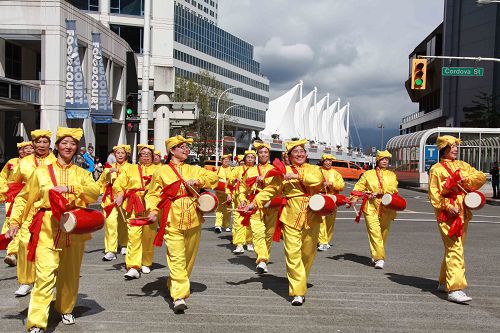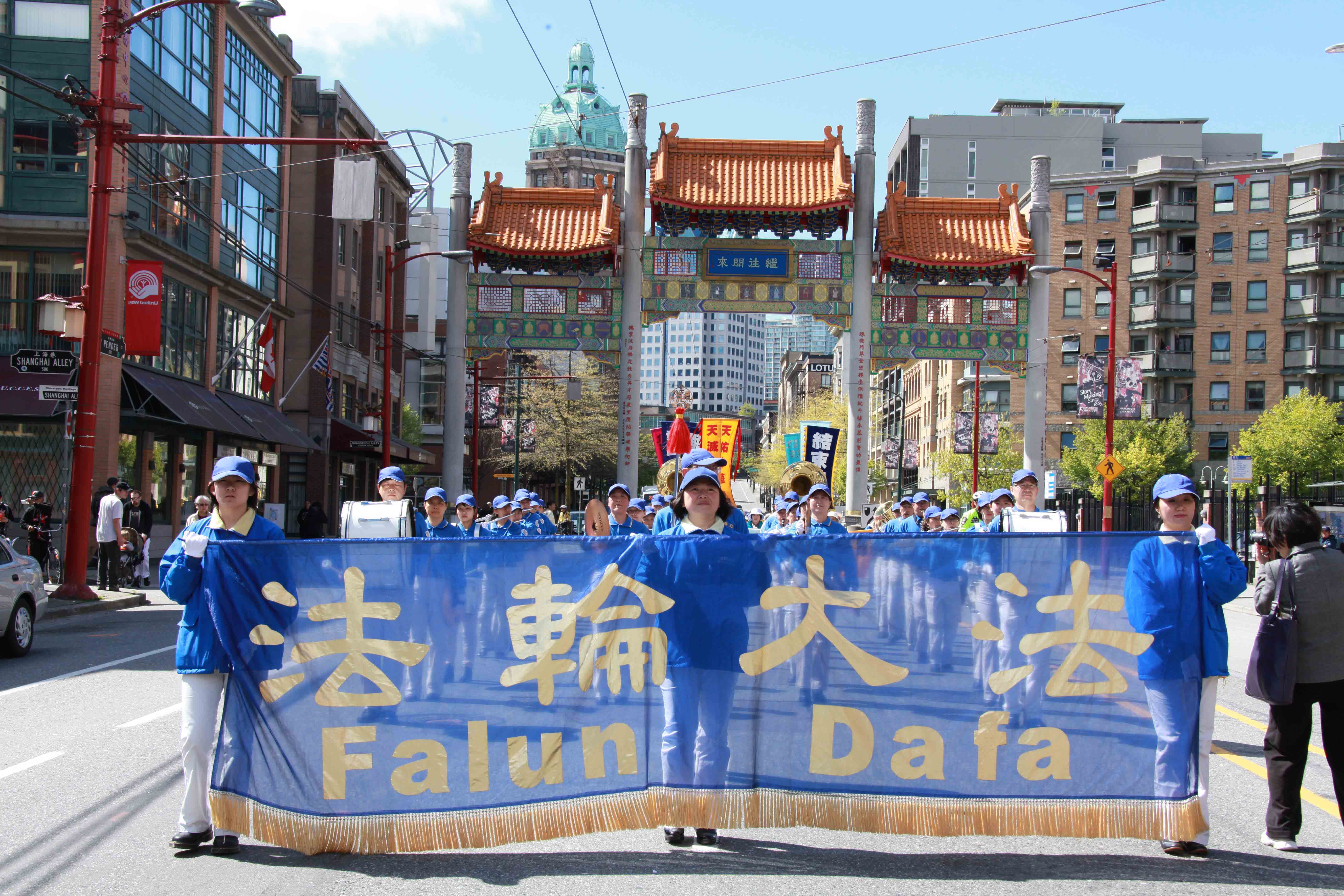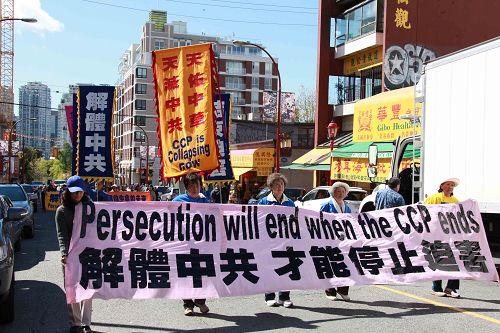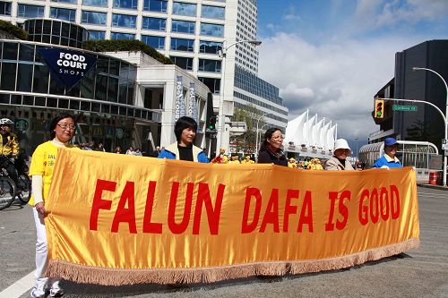 -)。集会后,法轮功学员从温哥华市中心开始游行,途经市中心著名景点五帆酒店,然后继续游行走到唐人街,一路引来行人观看和拍摄。