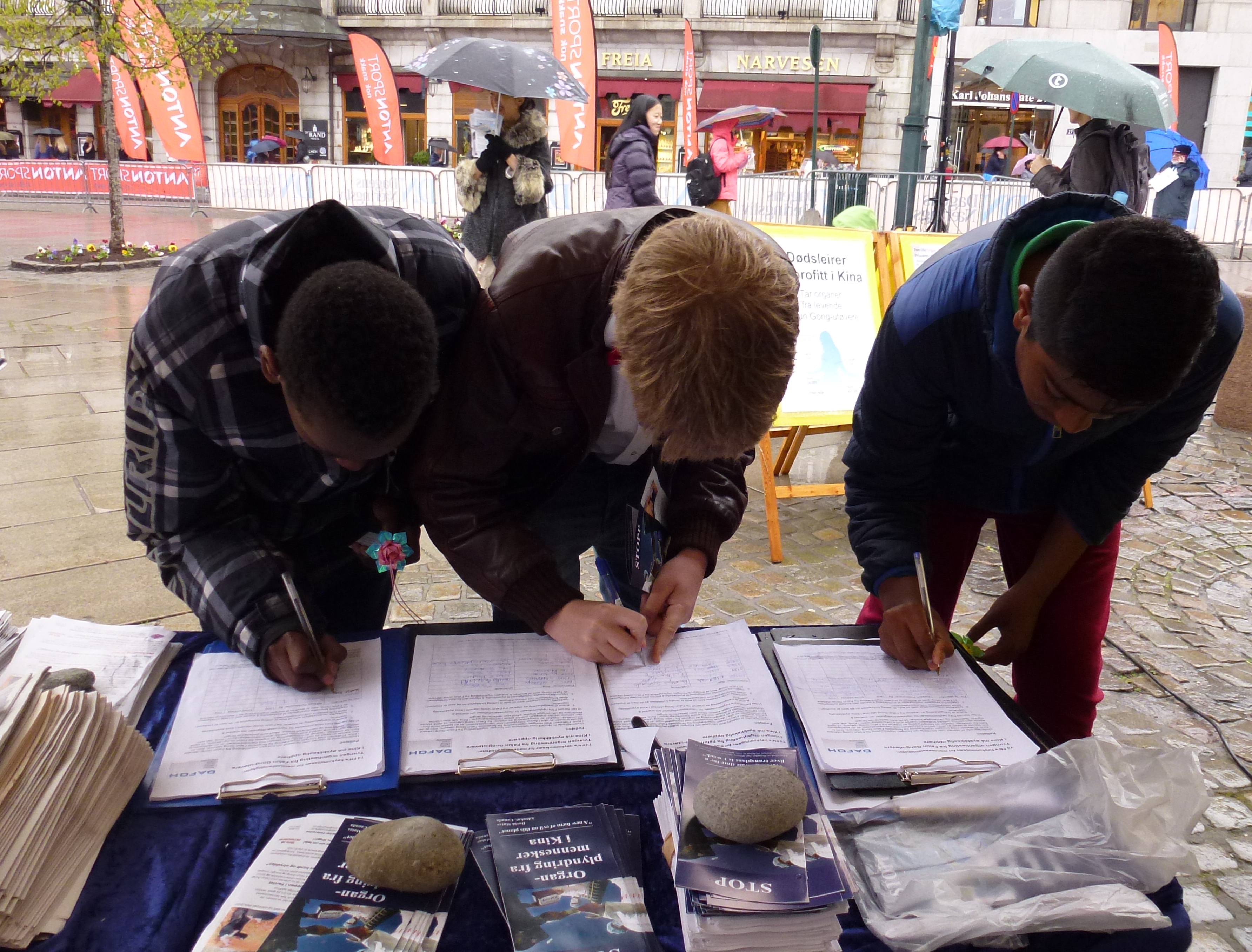 翰德里克(Hendrick)和他的两个同伴玛泰欧(Matteo)和塔如桑(Tharusan)是挪威一所学校的中学生,他们经过法轮功学员的活动地点时停下了脚步。