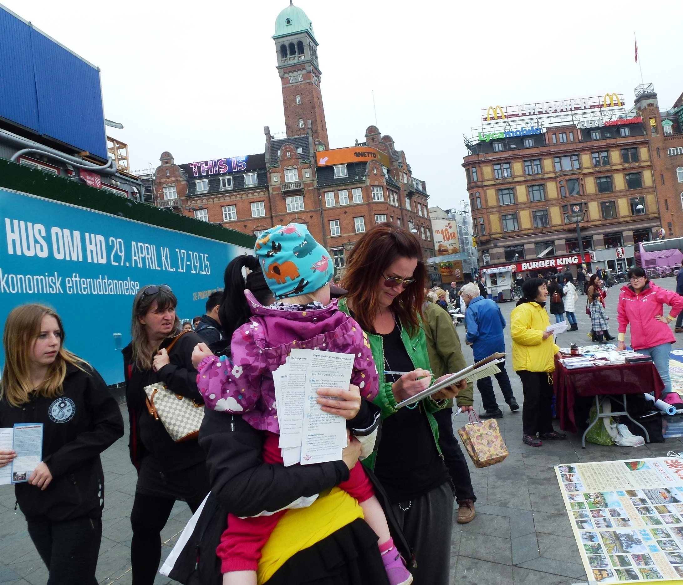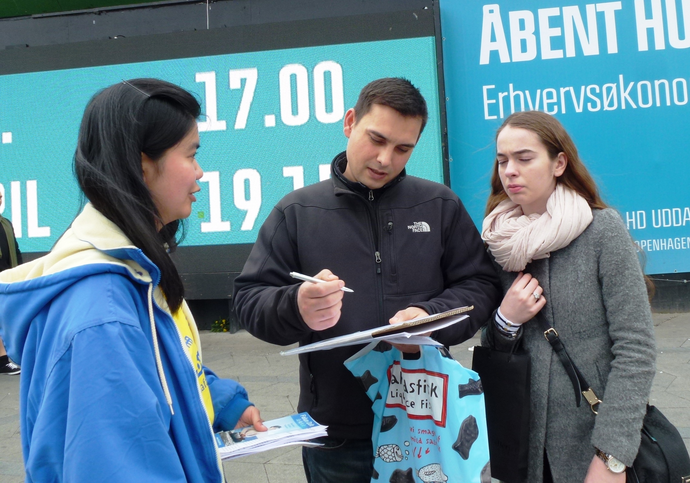 一对丹麦夫妇走过来,主动和学员说话:“我们以前看过法轮功的资料,而且在网上搜索了解更多的资讯,感觉很好,就跟着录像炼功。而这么和平的功法,中共却迫害法轮功,甚至活摘法轮功学员器官,太恐怖了!”他们郑重签下自己的名字。