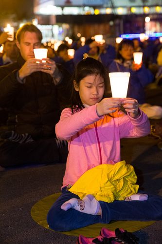 点点烛光在夜色中分外温暖,蜡烛燃烧着自己,照亮了别人。法轮功学员手举着烛光,希望更多的人能明白真相,走向光明的未来。