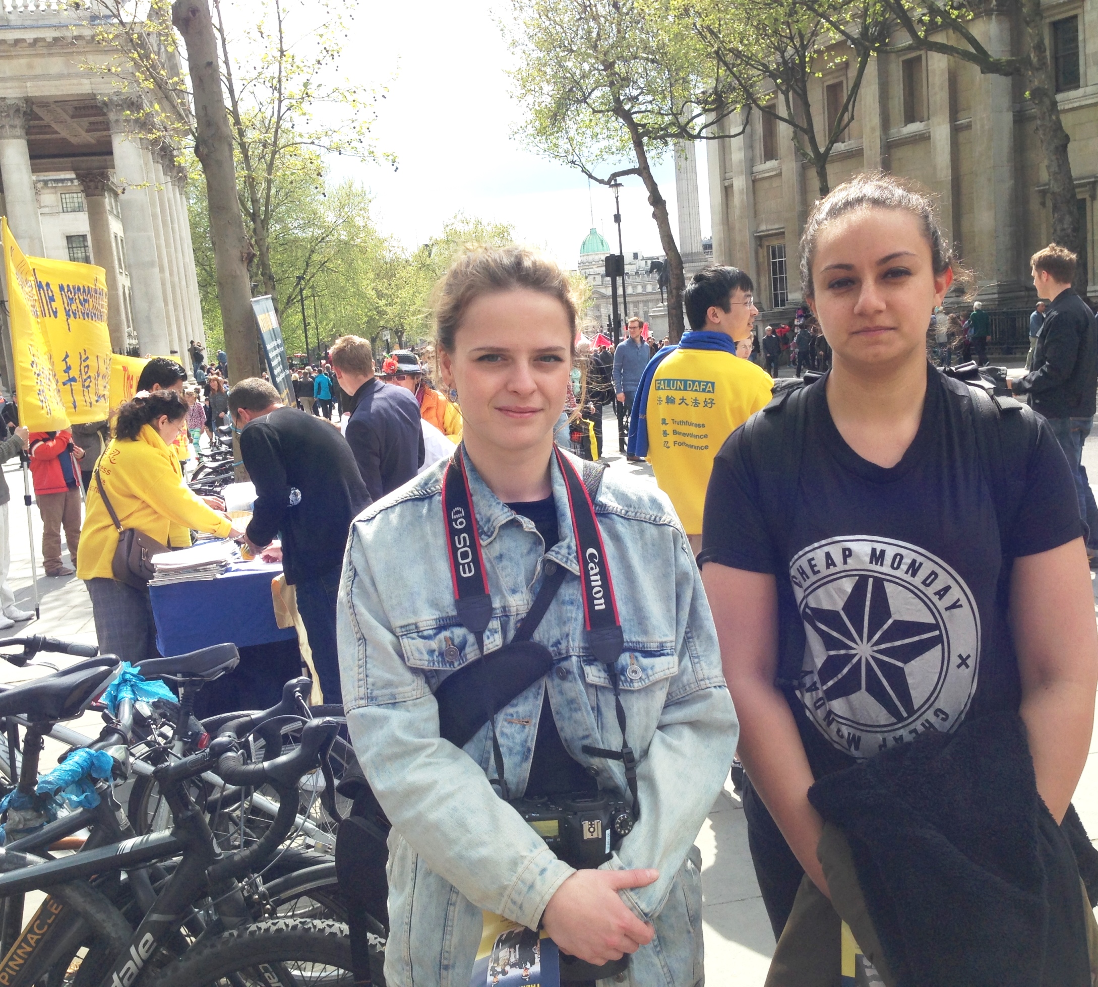 罗兹玛丽和卡莎(Rosemary and Kasha) 是两位在伦敦做兼职工作的大学生,当天途经圣马丁广场时被法轮功学员纪念“四•二五”和平上访十六周年的活动所吸引,停下脚步认真观看学员的功法展示,并阅读真相传单,然后就主动来到桌前签名谴责中共活摘法轮功学员器官的暴行。她们表示这是第一次听说中共活摘法轮功学员器官牟利暴行,感到震惊,认为这样邪恶的罪行令人难以置信,认为“这(中共活摘法轮功学员器官暴行)太糟糕了!” “太卑劣了!” “人怎么可以去杀害同类?人们应该从战争、从纳粹大屠杀的历史中得到教训。”