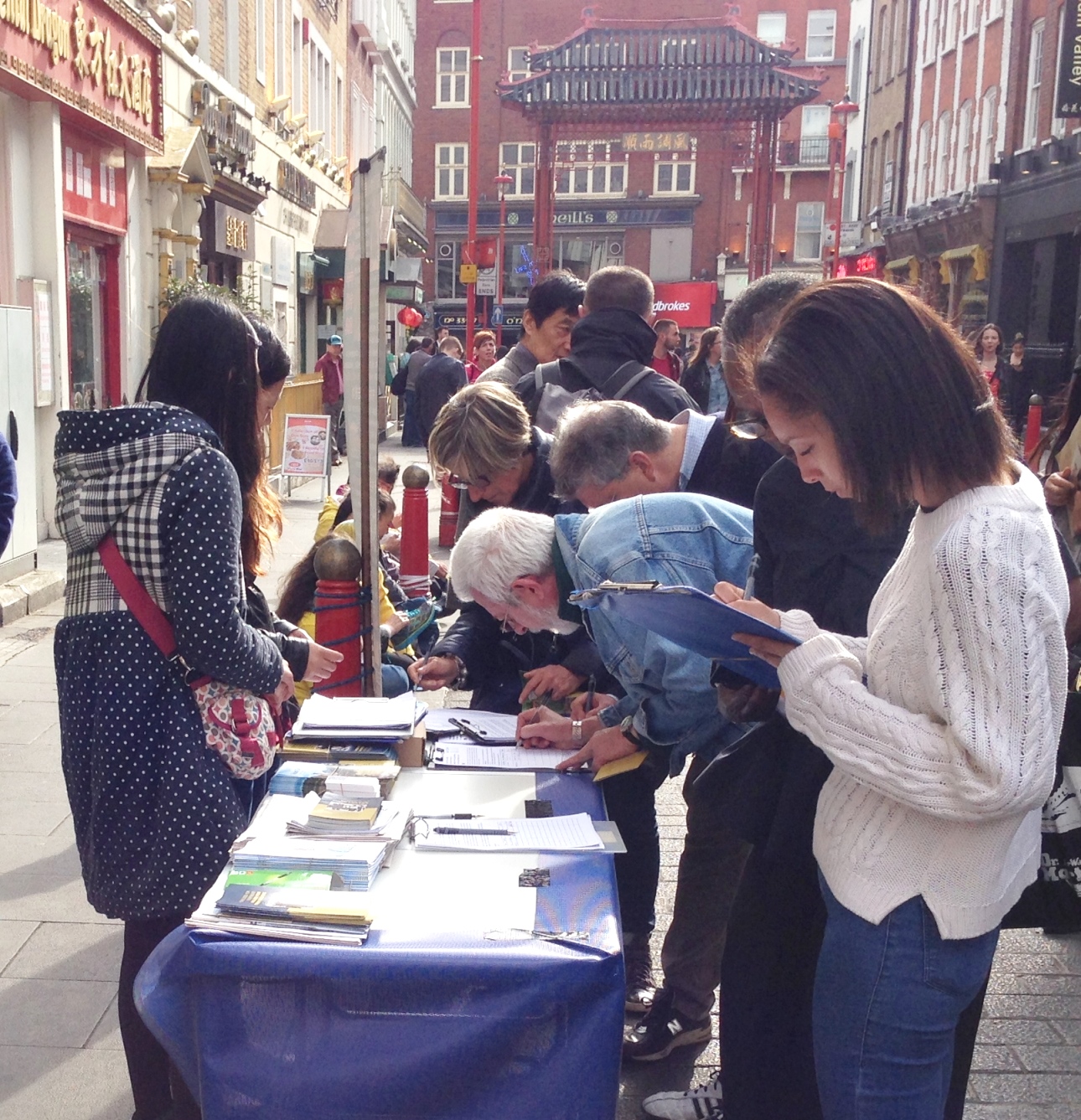 ![]() 图2:二零一五年四月二十五日,家住伦敦的心理医疗师琼斯(Jones)和她还在读中学的女儿米琳(Millen)在伦敦唐人街看到法轮功真相,图为米琳(右一)正在签名 |