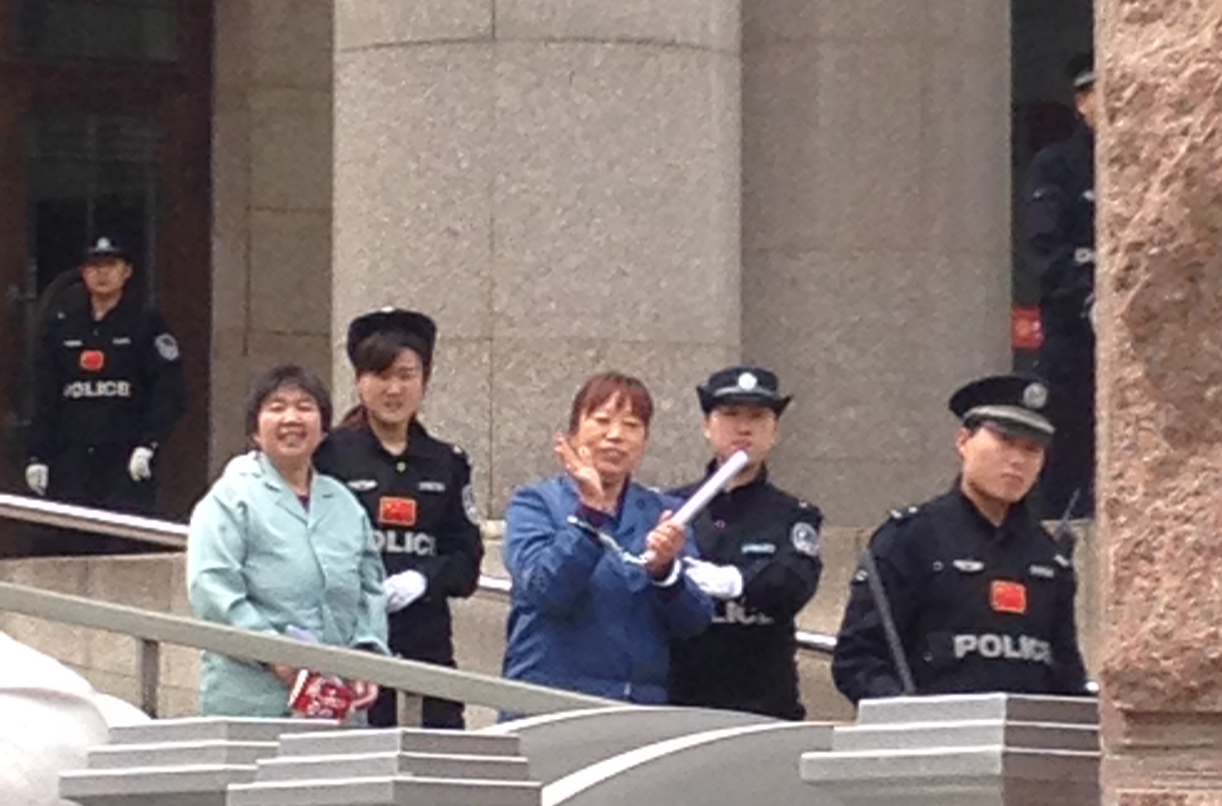 ![]() 两名法轮功学员被戴了手铐、脚镣,在法院门口她们微笑着向亲人致意 |