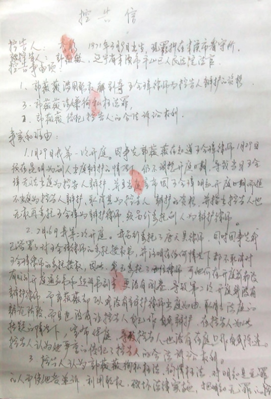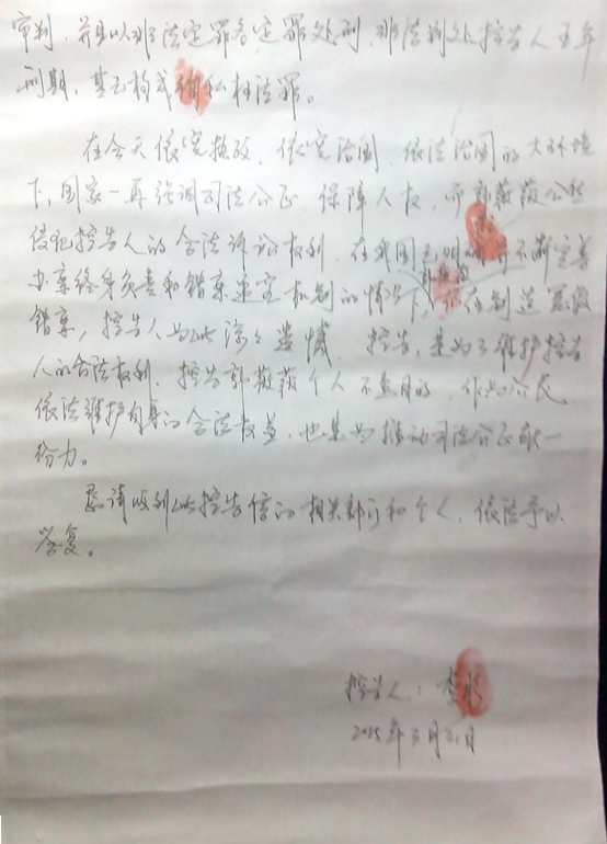 二零一五年三月三十一日,李彤在看守所冰冷的会见室亲笔一封“控告信”,正式控告平山区法院法官郭薇薇徇私枉法罪,非法剥夺当事人聘请律师的权利。
