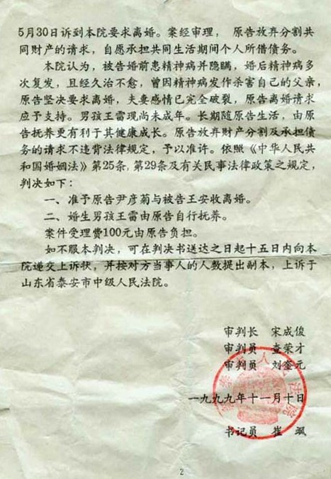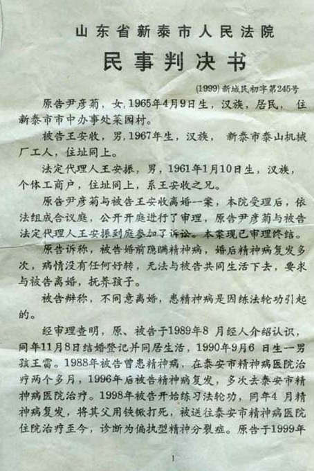 事实上,新泰市泰山机械厂工人王安收,是一个精神病患者,因精神病发作将其父亲用铁锨打死。这一点,在当地法院判决王与妻子尹彦菊离婚的判决书上写得非常明白。新泰市法院(1999)新城民初字第245号民事判决书指出:“本院认为,被告(王安收)婚前患精神病并隐瞒,婚后精神病多次复发,且经久治不愈,曾因精神病发作杀害自己的父亲,原告(尹彦菊)坚决要求离婚,夫妻感情已完全破裂,原告离婚请求予以支持。”可是这个案例经泰安邪*党-官员、文痞篡改后,被中共江氏集团收进 “1400例”,栽赃到法轮功头上,欺骗毒害了许多人。