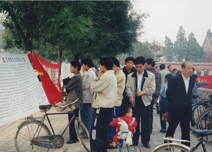 岱庙居于泰安古城的中心,南门的花园广场上,游人歇客颇多,法轮功学员把这里当成了炼功弘法的重要场所。一到周六上午,就有上千名学员在这里展示法轮大法五套功法。场地四周的树干上挂满了介绍法轮功的图片、资料,吸引了众多路人观看,很多人也因此走进大法修炼。