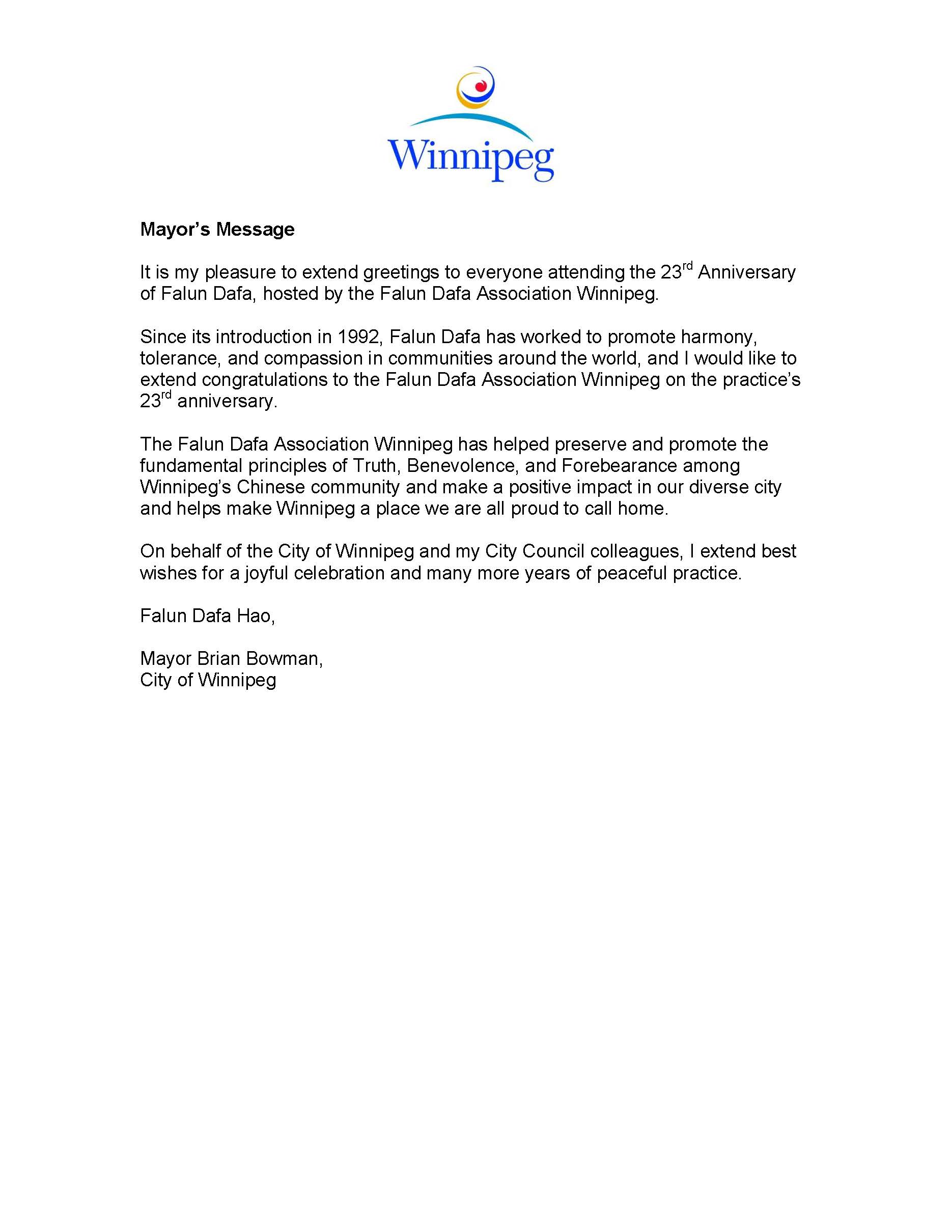 今日,加拿大温尼伯市市长布莱恩•褒曼致信法轮大法协会,祝贺洪传法轮大法二十三周年,并称赞法轮大法“带给我们这个多元城市的积极影响”。