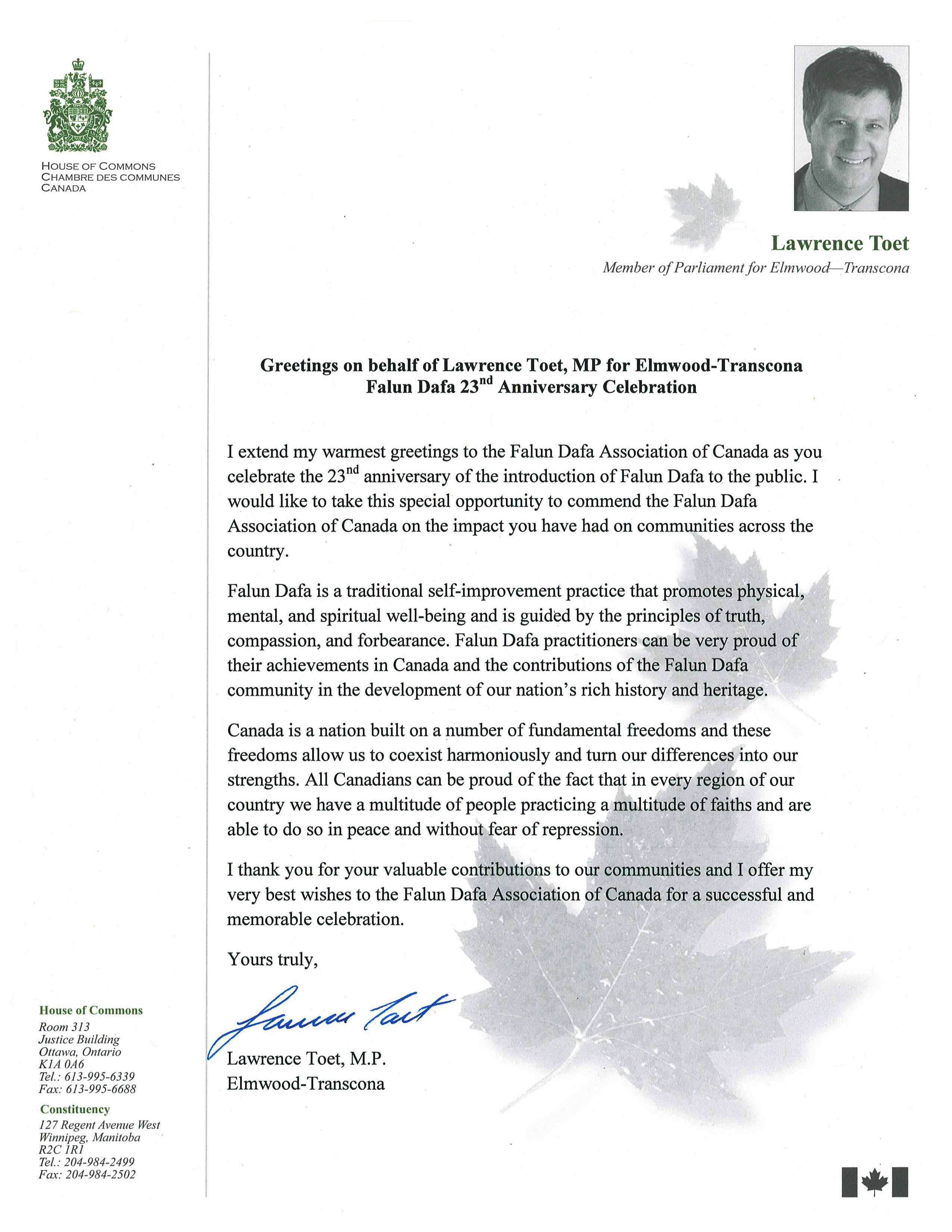 加拿大国会议员Lawrence Toet致信法轮大法协会,祝贺法轮大法洪传二十三周年,并表示“他们为我们国家丰富的历史传统的发展所做出的贡献和成就感到非常自豪。”