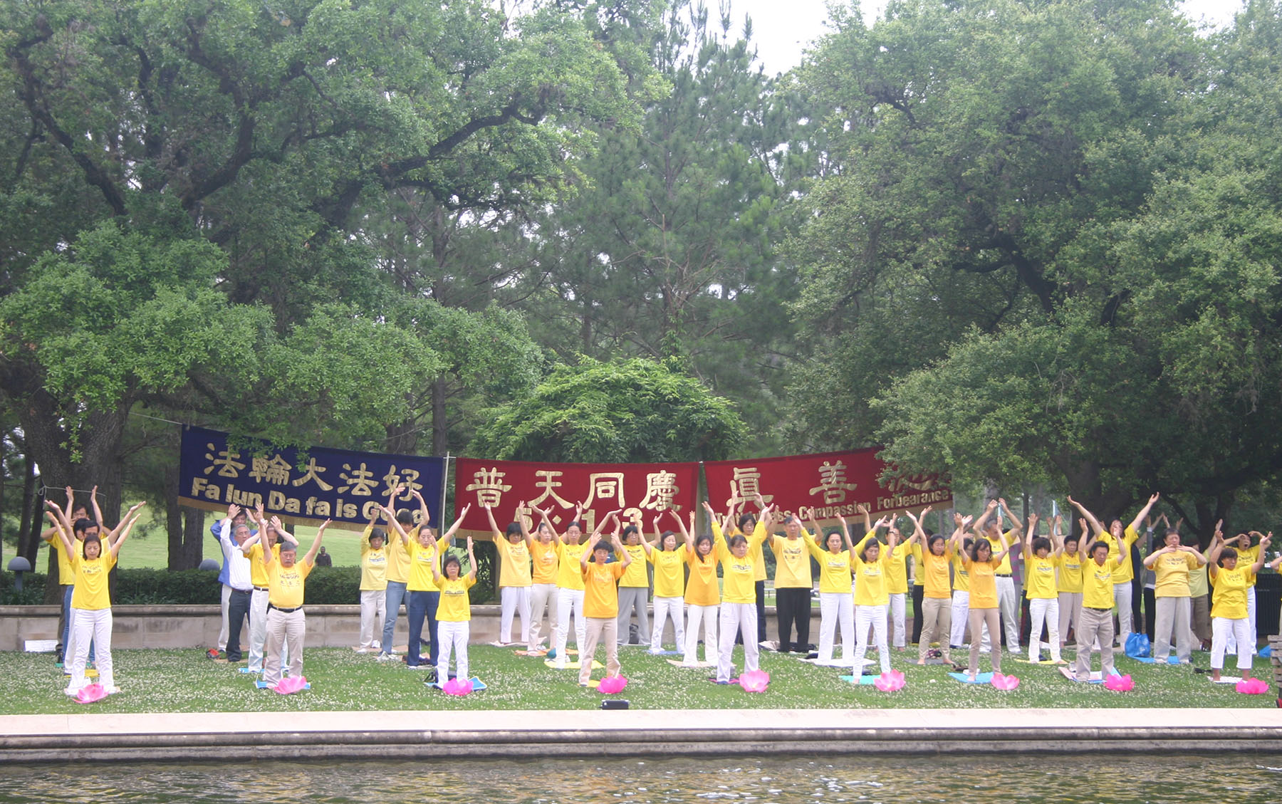 几个横幅挂在树上 “法轮大法好”、 “普天同庆” 、“真善忍”,格外引人注目,法轮功学员身穿黄色的炼功服,在柔和悦耳的炼功音乐中,展示缓慢优美的功法,平静祥和,充满能量。