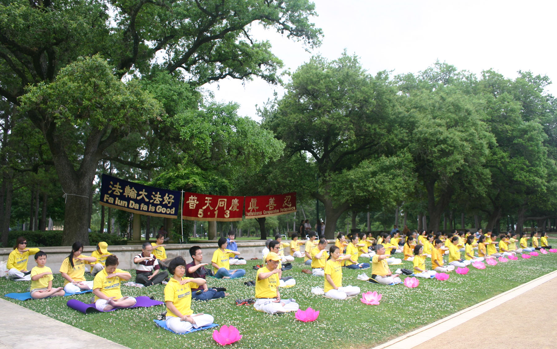 ![]() 休士顿法轮功学员在市中心著名荷门公园(HermannPark)炼功,庆祝法轮大法洪传二十三周年 |