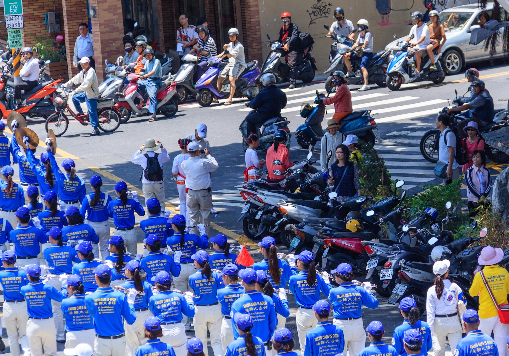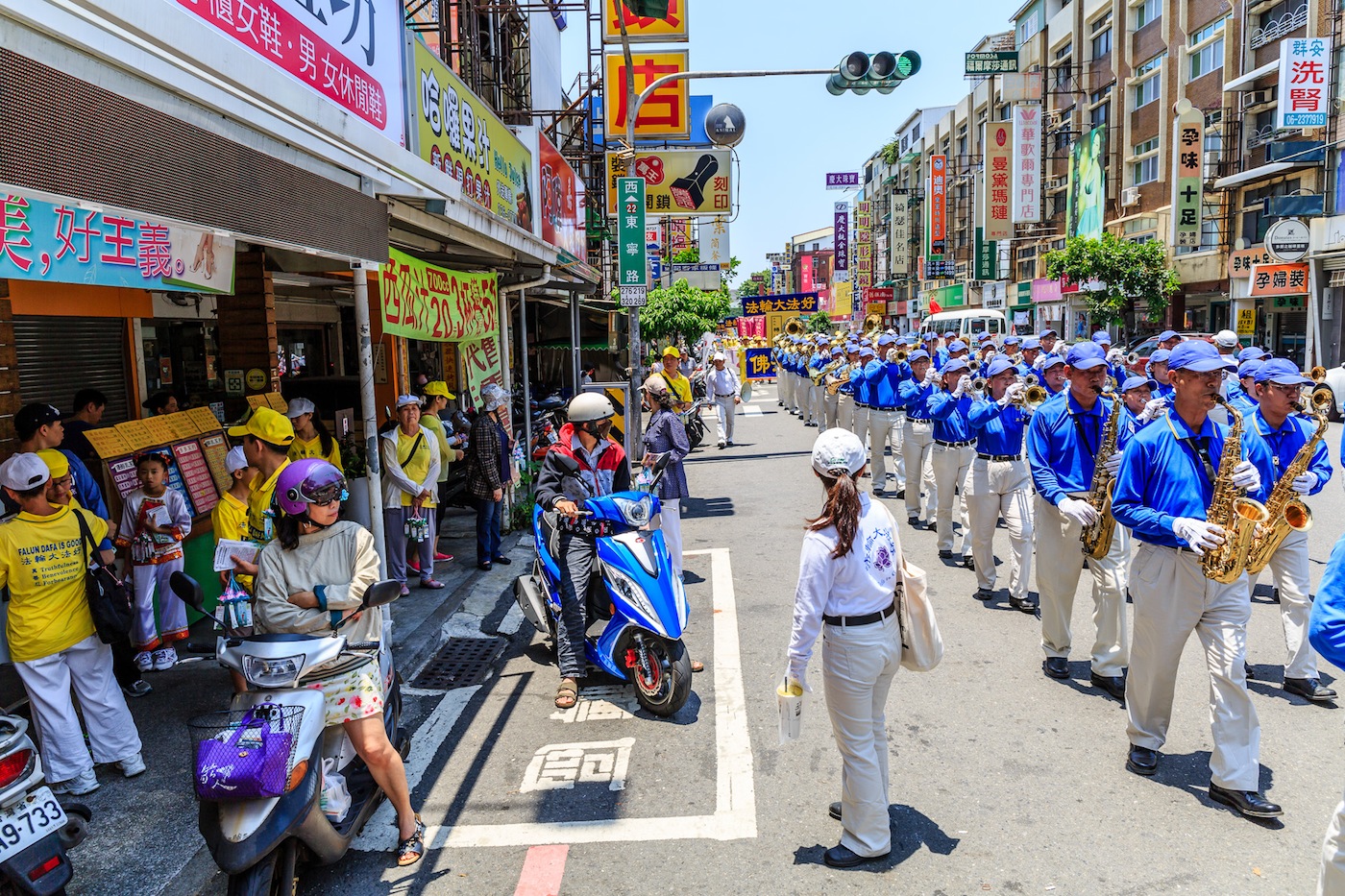 沿途有很多路人驻足照相,店家老板和客人都跑出来看热闹,也有在二楼打开窗户拿相机照相的,今天适逢假日,好多小朋友都跑出来看游行,有一位爸爸载两位可爱小女孩骑车一直跟着遊行路线走,每处树荫下都站好多民众观赏关注,好多民众听到天国乐团的鼓号声都跑出来了,连一处天主教堂的教友也在门口列队观赏,林森路路口机车更占满车道迎接队伍。