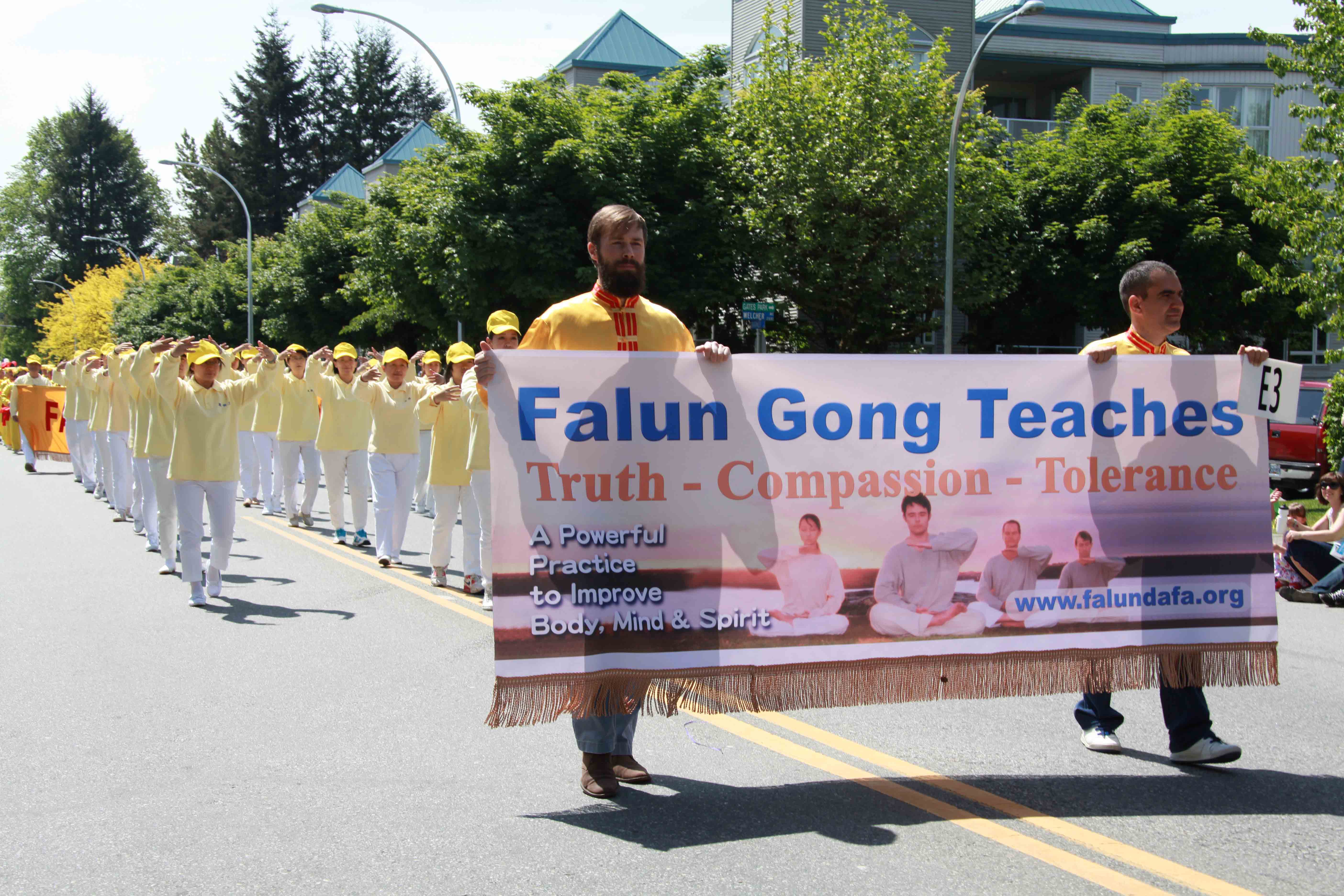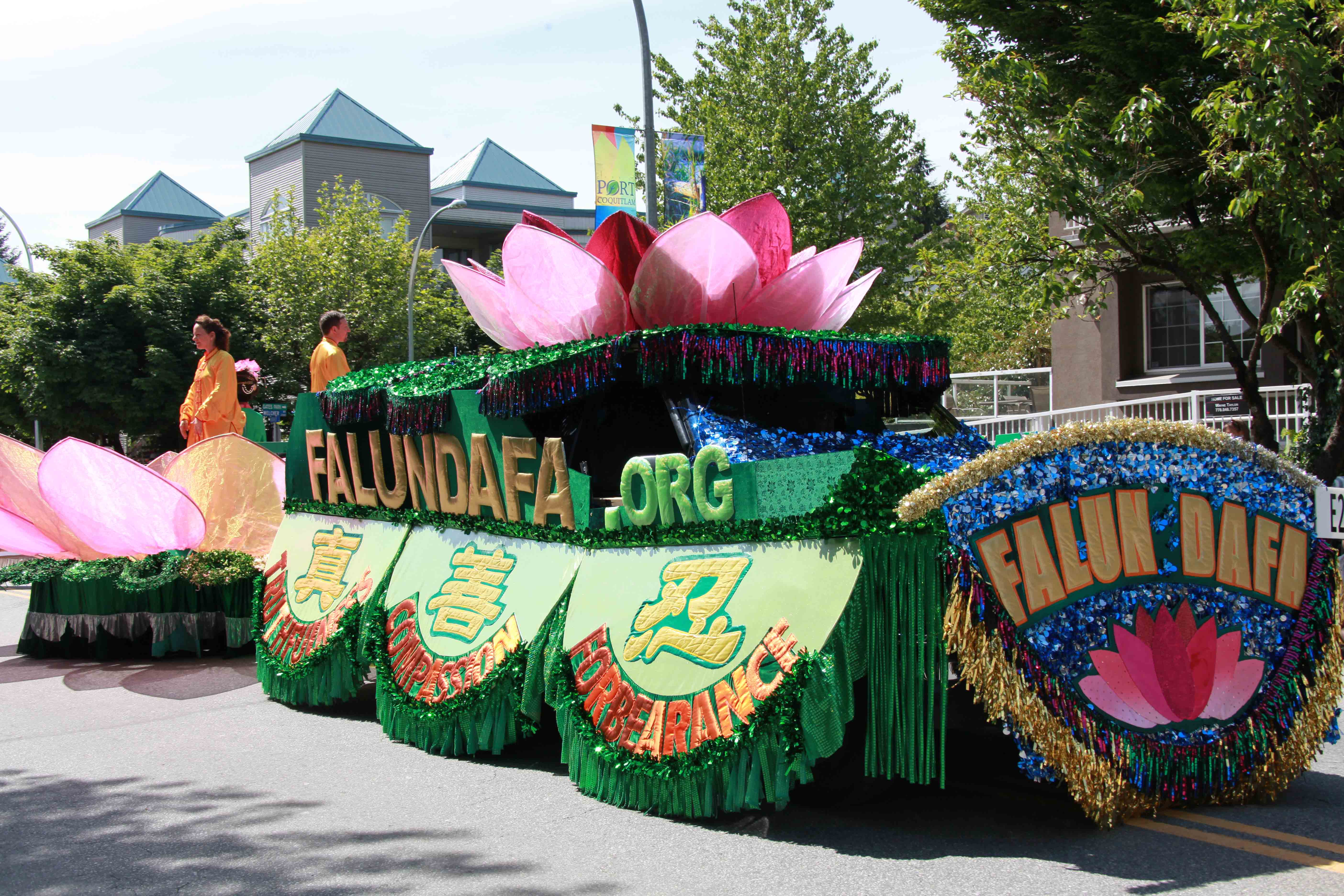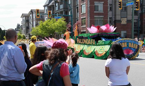 法轮功游行队伍包括天国乐团、“真善忍”花车、法轮功功法演示队和腰鼓队。一路走来,赢得市民们的热情欢呼,很多观众拿了法轮功真相资料在路边阅读,还有很多市民表示要把资料带回家仔细阅读。