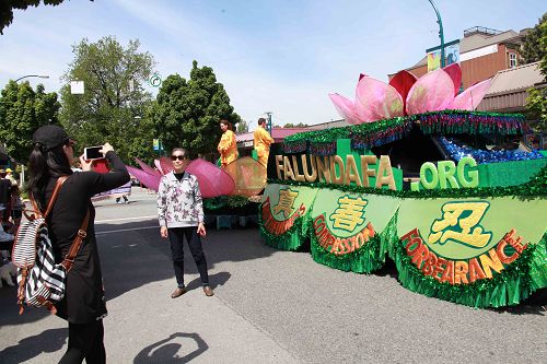 很多在路边观看的华人,兴奋地说:“法轮功来了,真漂亮!”很多华人用手机拍摄法轮功游行队伍,还有华人高兴地与法轮功游行队伍合影。
