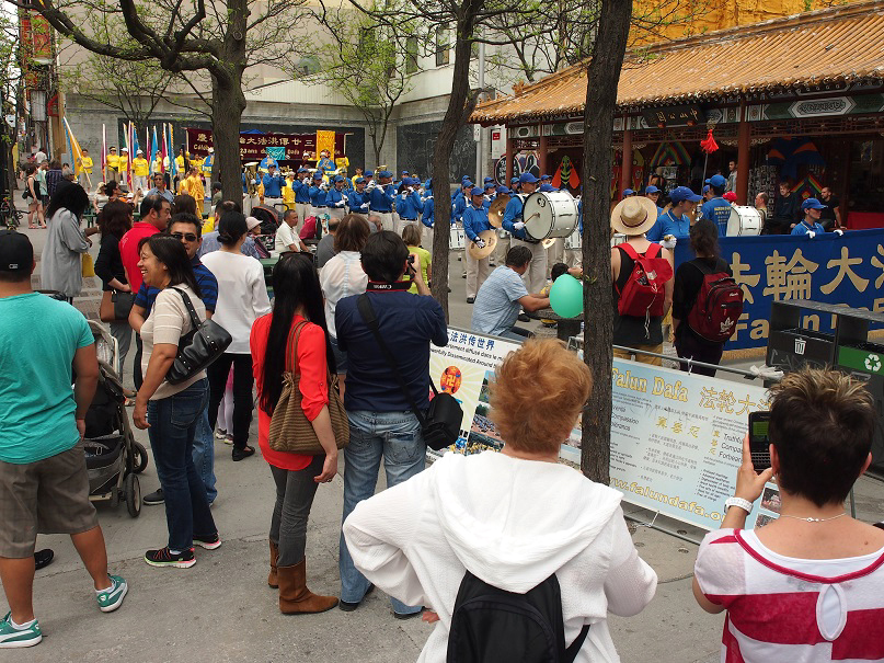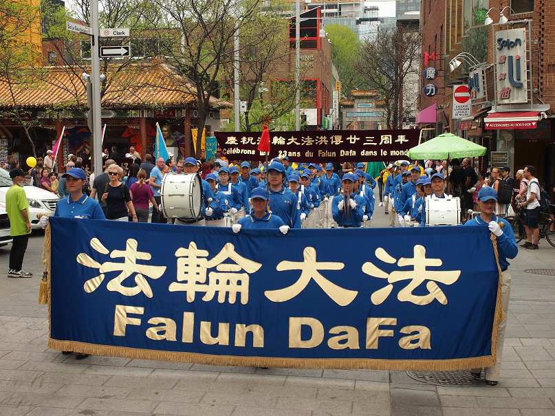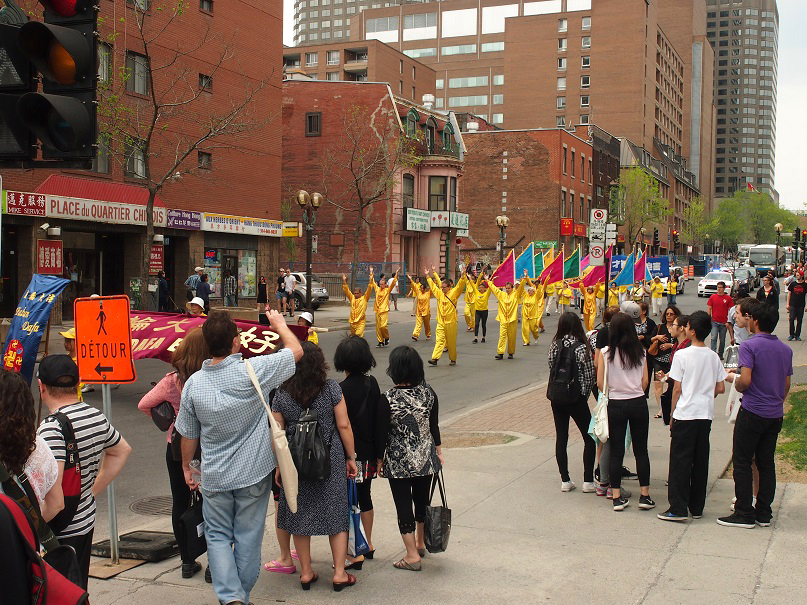 法轮功学员随后举行了游行,向民众展示法轮大法的美好。游行队伍由三个方阵组成,第一个方阵是身着蓝色服装的天国乐团,随后是展示五套功法的方阵,最后是“法轮大法好”方阵。壮观的游行队伍穿过唐人街最热闹的步行街,再经过著名旅游老港的部分街区以及繁华的圣劳伦大街。天国乐团演奏的《法轮大法好》、《法正乾坤》、《送宝》等曲目吸引了沿途的民众,人们被游行气氛所吸引、所震撼,纷纷举起手机拍照,有人竖起大拇指,有人鼓掌欢呼,有人高声叫好。
