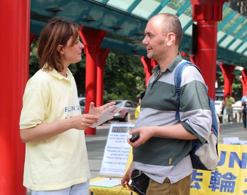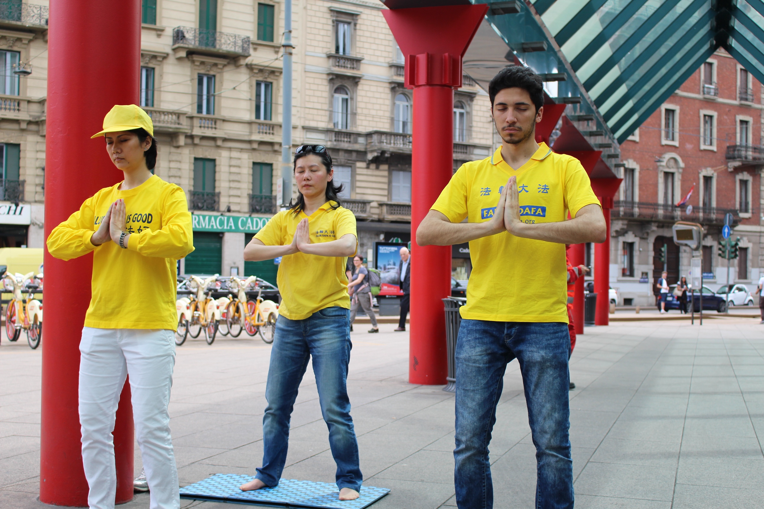 ![]() 图1:法轮功学员在米兰市中心街头炼功,向人们介绍功法,庆祝世界法轮大法日 |