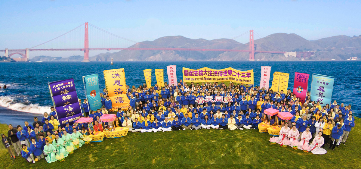 星期天上午,法轮功学员首先来到旧金山金门大桥附近的Marina Green公园,集体合影,恭敬合十,齐声念颂:“恭祝师父生日快乐!”“法轮大法好!”“真、善、忍好!”表达法轮功学员对师父的崇敬和感恩。