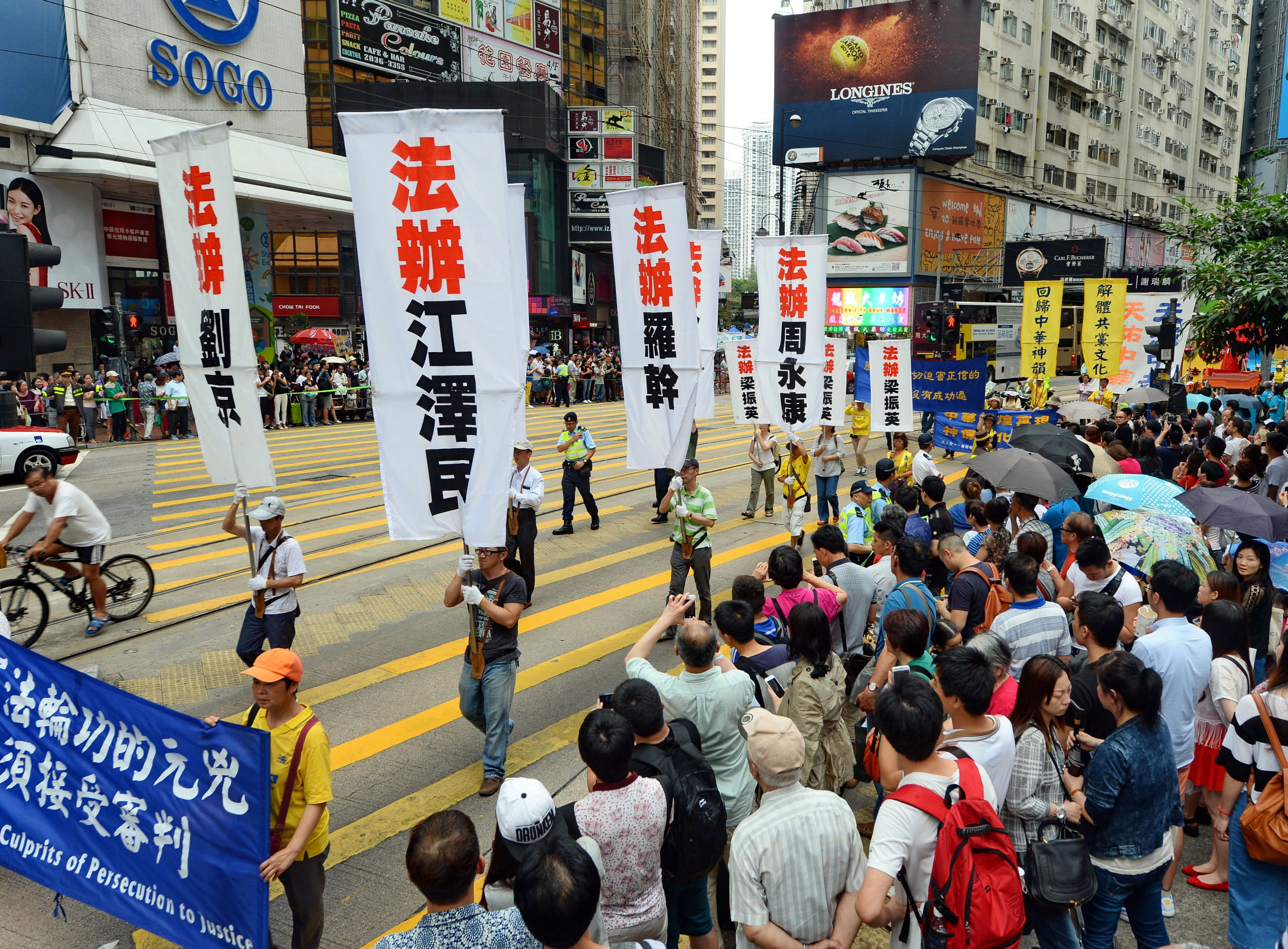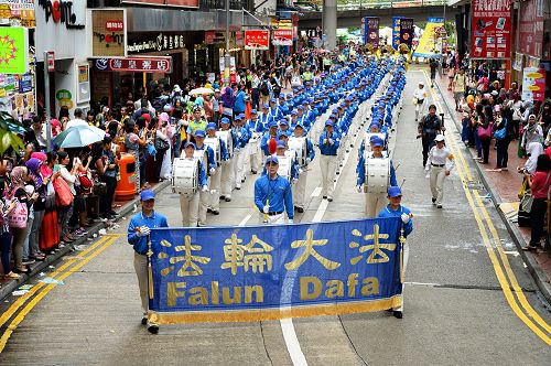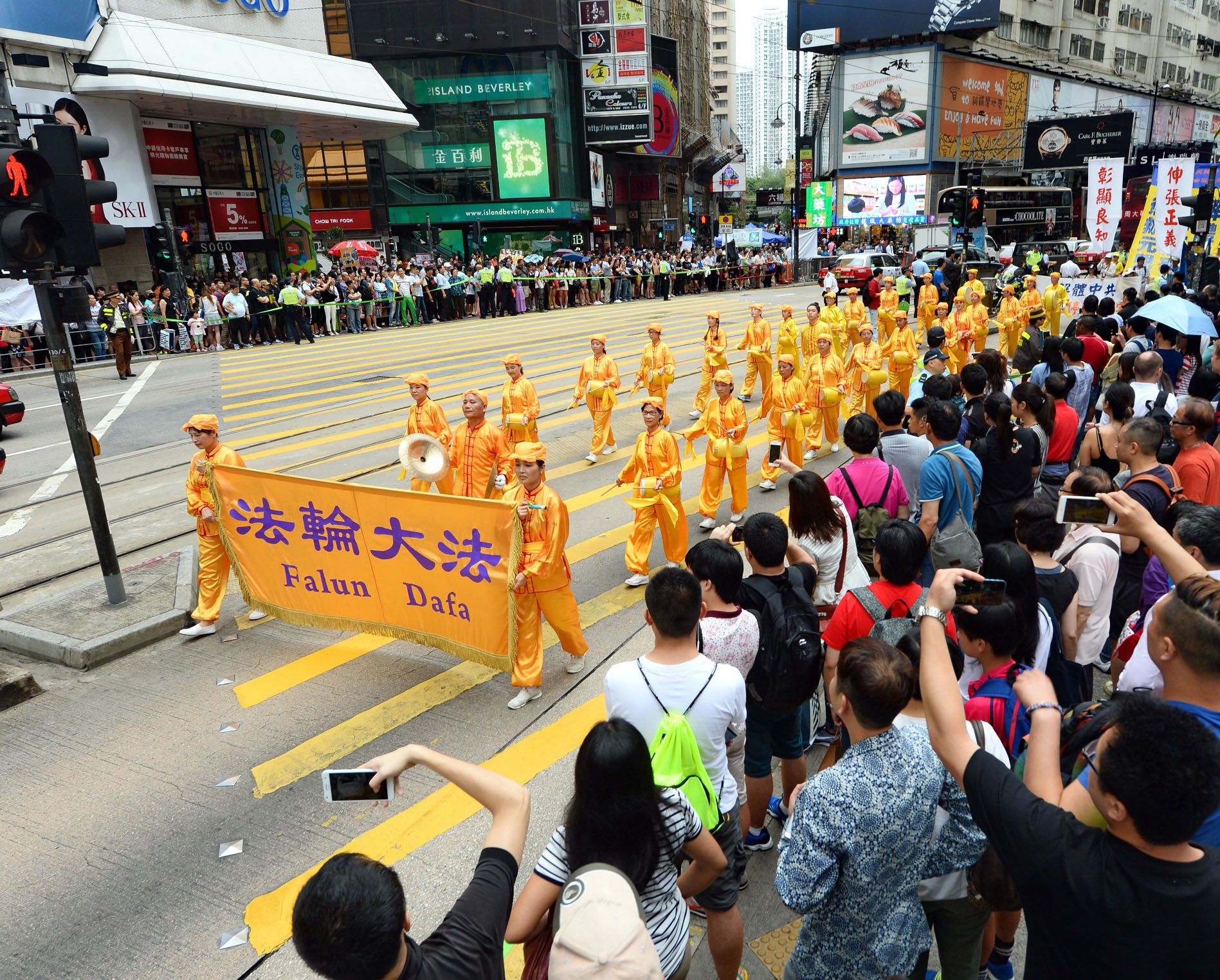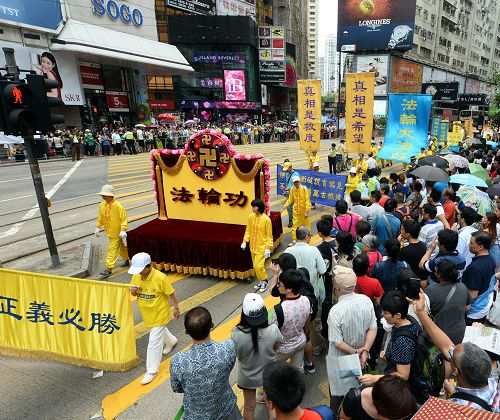 在中环爱丁堡广场的庆祝活动于中午前结束。下午二时,游行队伍在天国乐团吹奏“法轮大法好”、“法轮圣王”等多首雄威动人的音乐引领下,从维多利亚公园出发,途经铜锣湾、湾仔、中环等闹市,前往终点:上环中山纪念公园。沿途吸引许多市民和大陆游客驻足观看,纷纷举起手机、相机拍下画面。