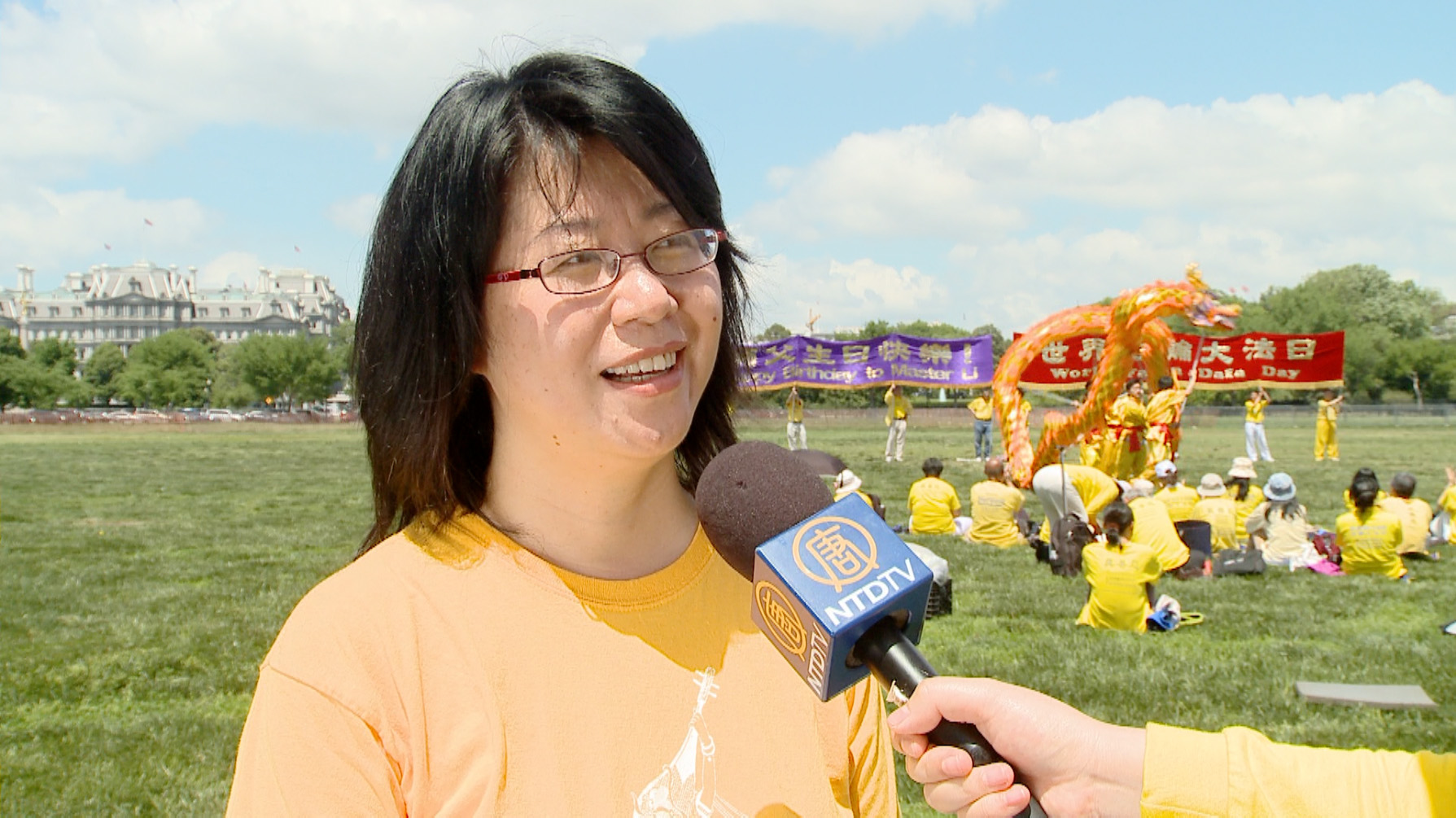 刚刚从中国大陆来到美国的法轮功学员于女士和她的女儿,当天也特意来参加庆祝活动。于女士此前在大陆是中石油天然气管道局下属一幼儿园的副园长,但她曾经生活得非常不快乐,甚至产生过轻生的念头,是修炼法轮功让她彻底打消了这种想法,“我修炼法轮功之前有严重的神经衰弱,每天都必须吃安眠药才能入睡,生活质量非常差,觉得活着没有意思,甚至想过要轻生。”“但有一天我在街上跑步,看到大街上法轮大法的横幅上写着‘真、善、忍’,我当时心里一震,就觉得如果人人都能按这三个字做,社会将变得多好啊。”