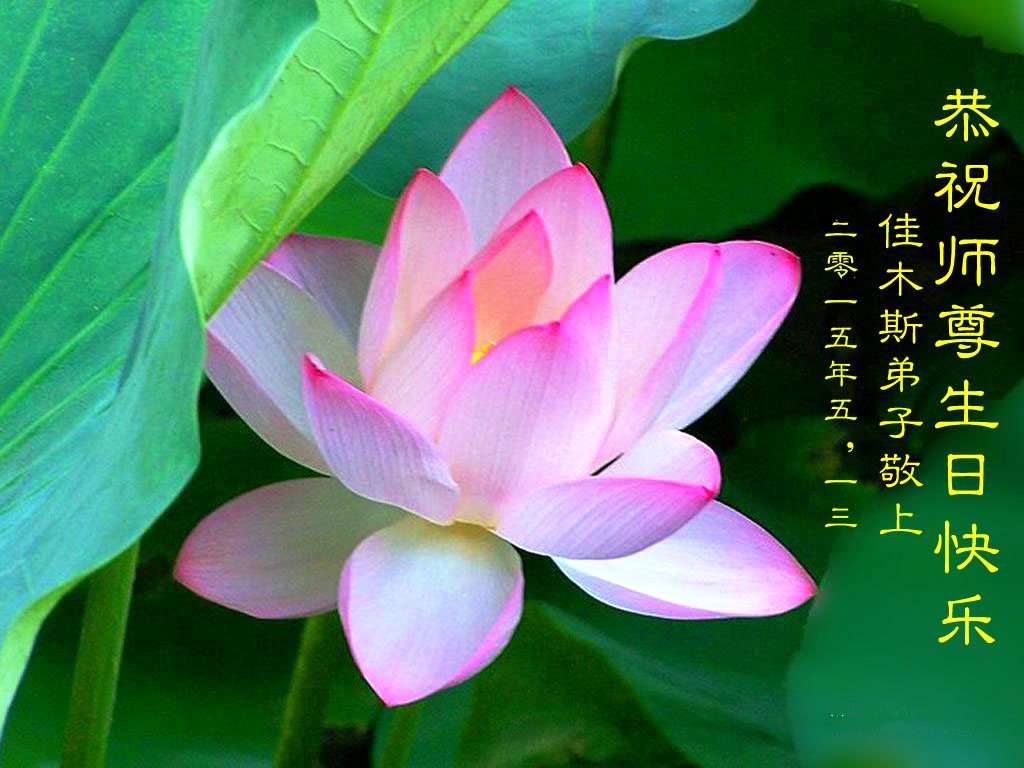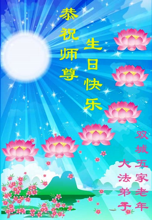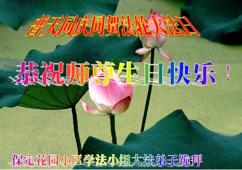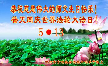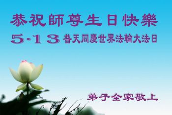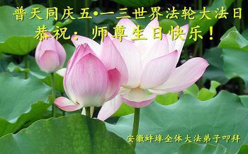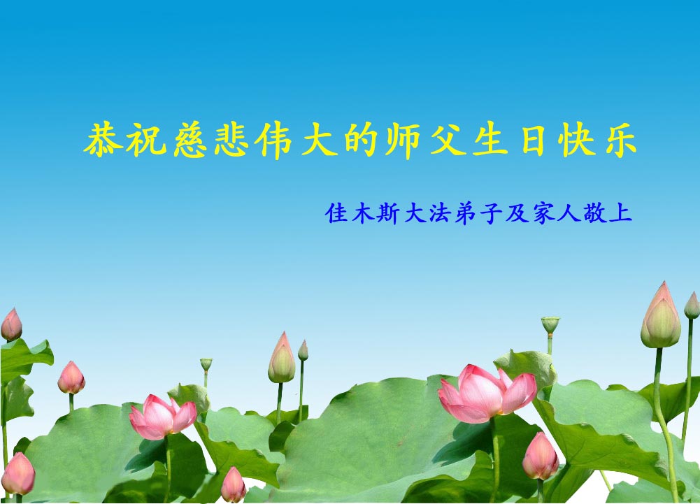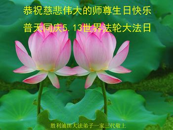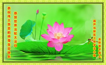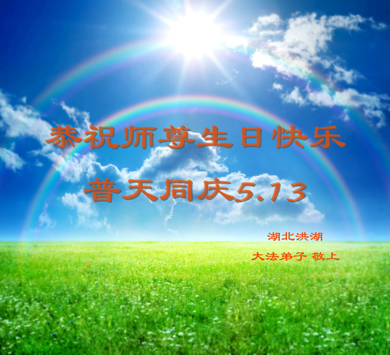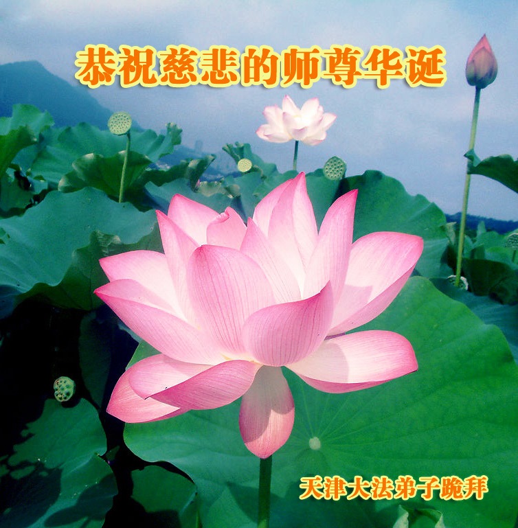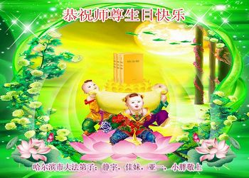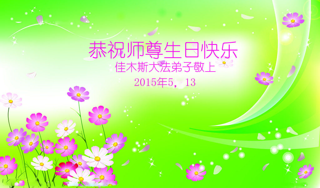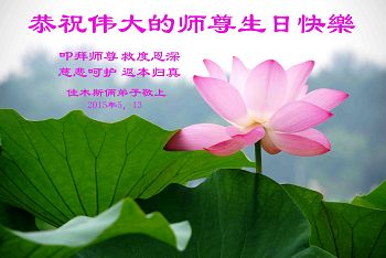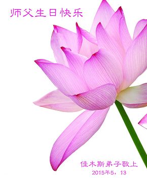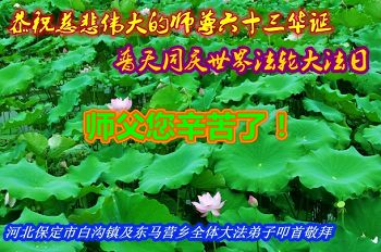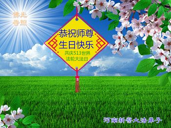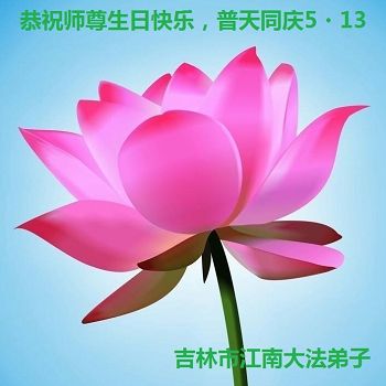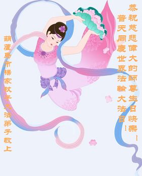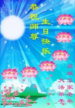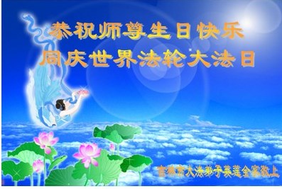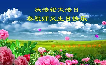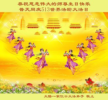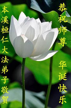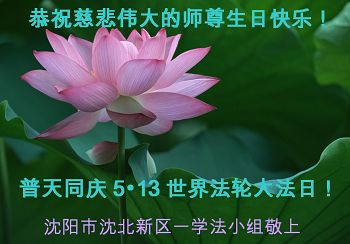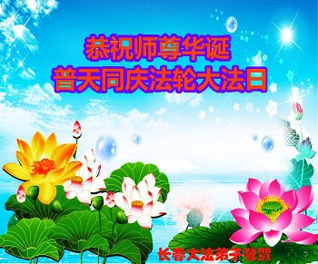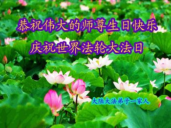 在这普天同庆的日子里,我代表法轮大法新学员及全体大法弟子及家属叩拜师尊华诞!我们将永远践行师尊的教导,按“真、善、忍”的标准做一个比好人更好的人,努力做好三件事,精進实修,救度更多众生!