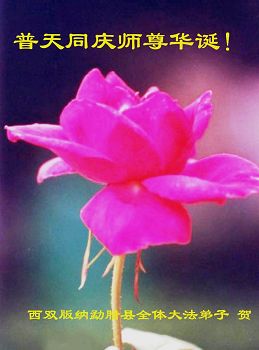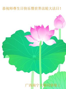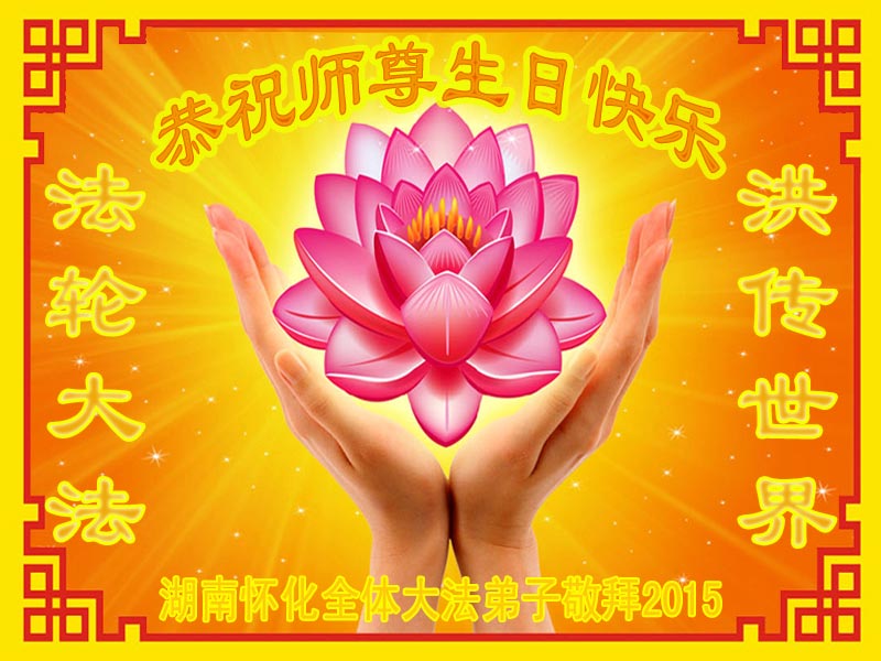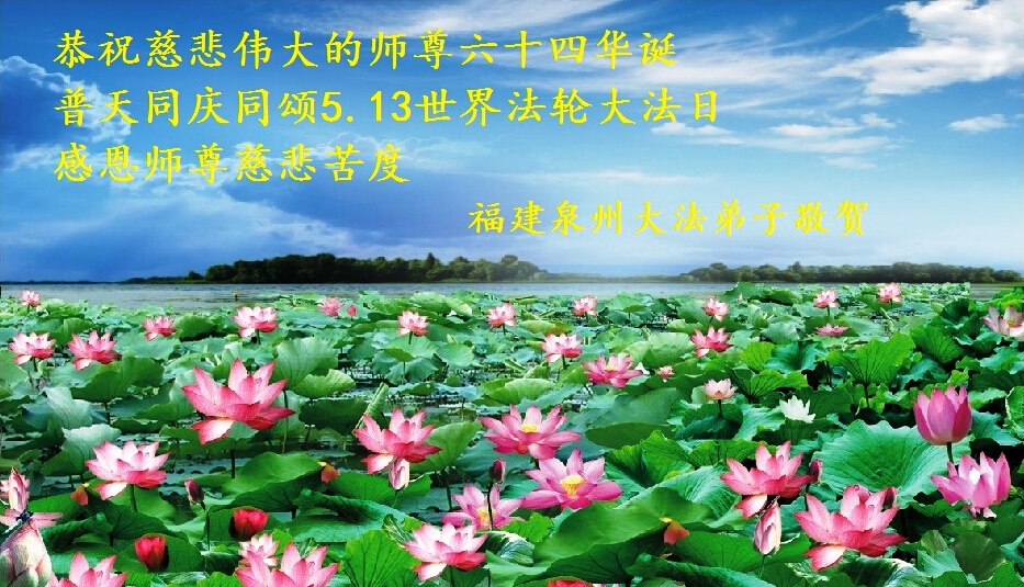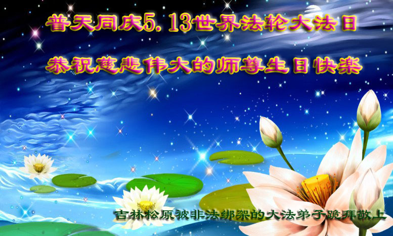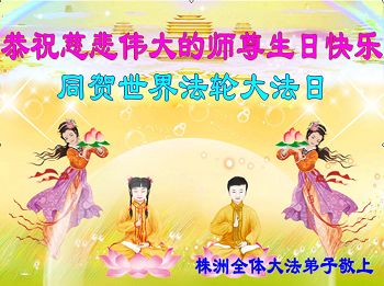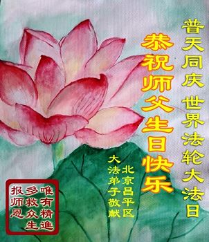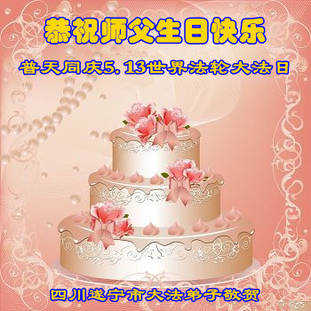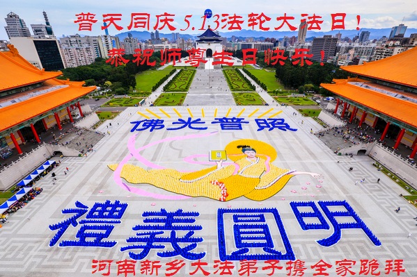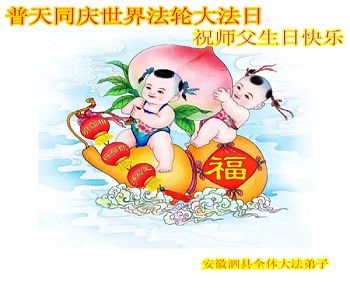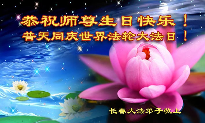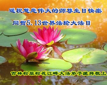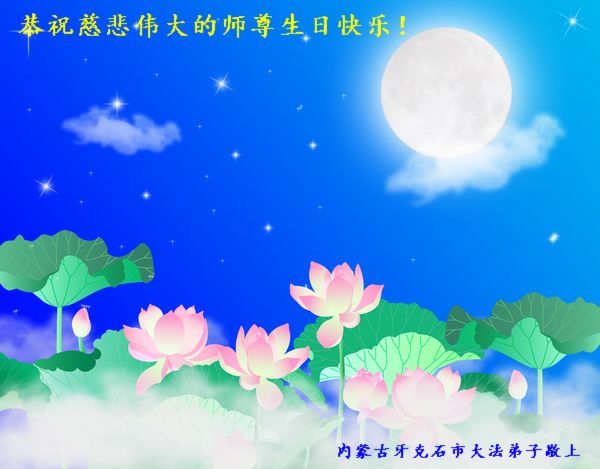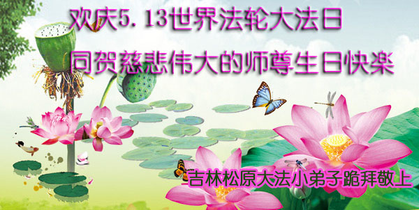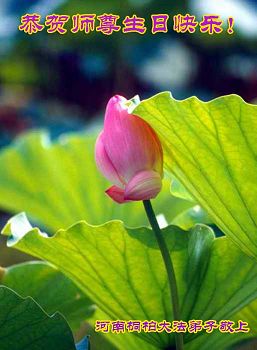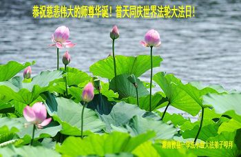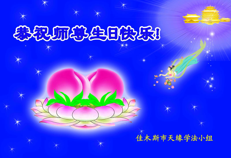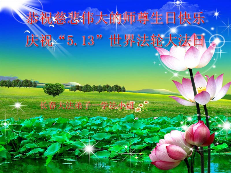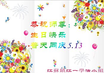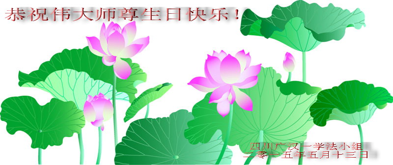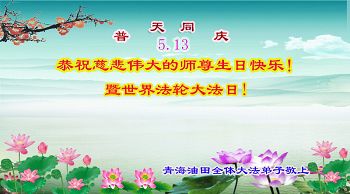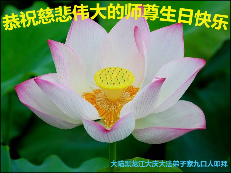 在这普天同庆的日子里,我代表法轮大法新学员及全体大法弟子及家属叩拜师尊华诞!我们将永远践行师尊的教导,按“真、善、忍”的标准做一个比好人更好的人,努力做好三件事,精進实修,救度更多众生!