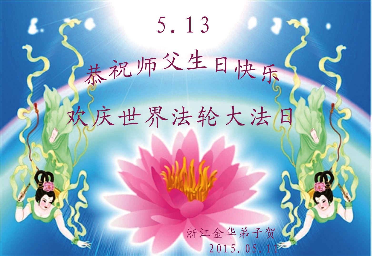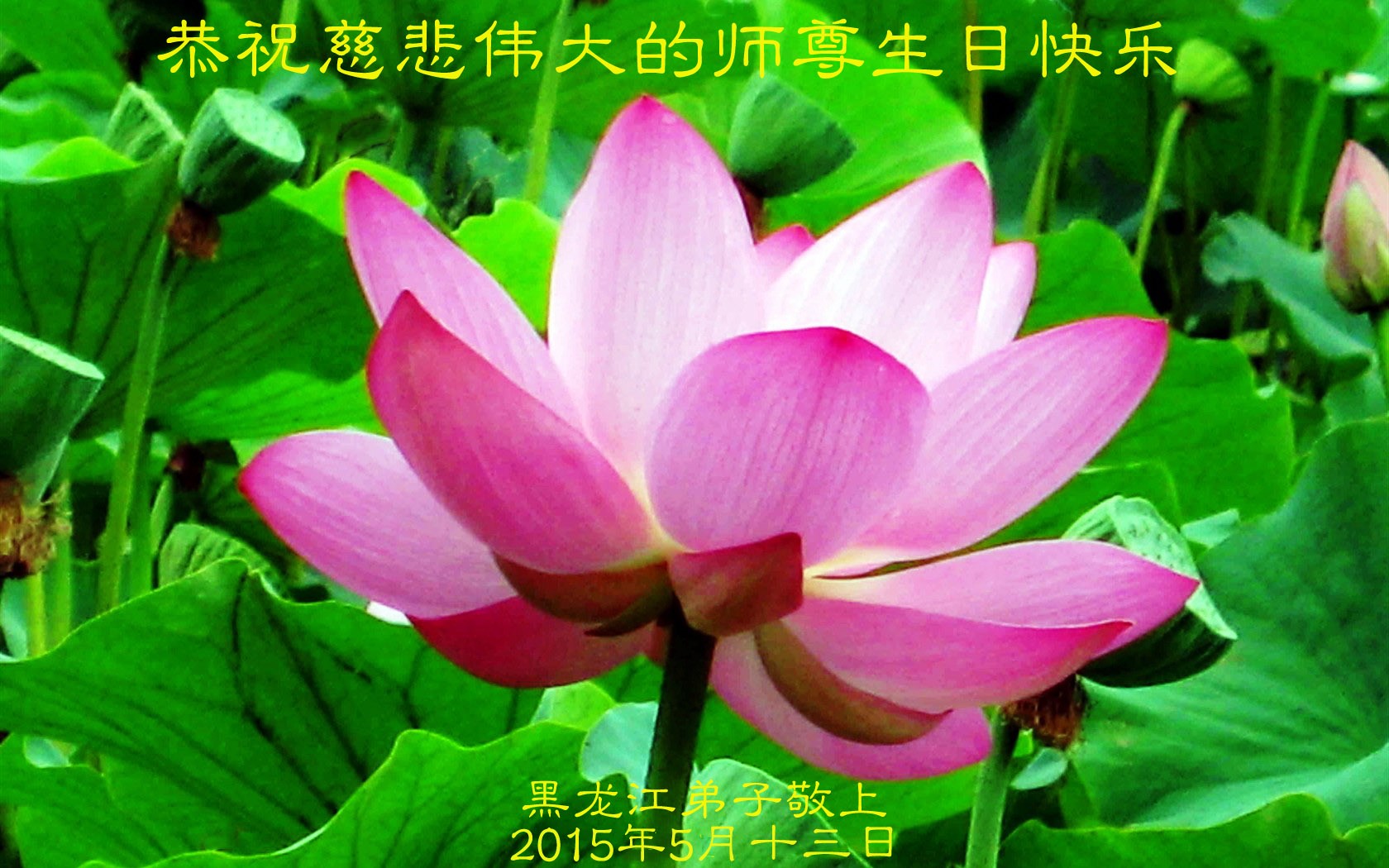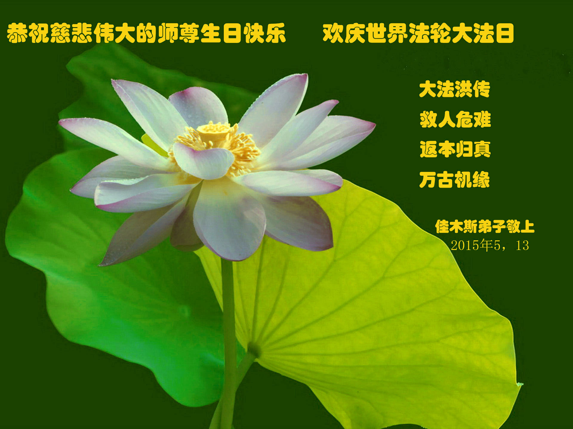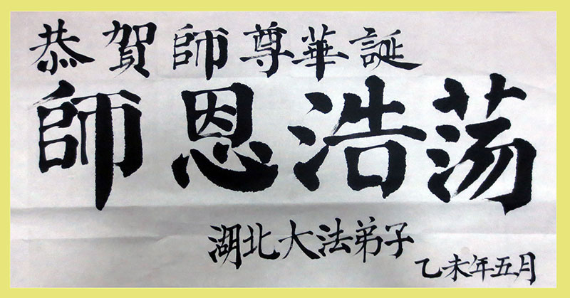 值此“五一三”普天同庆之日,我二人恭祝慈悲伟大的师尊生日快乐!叩谢师恩!