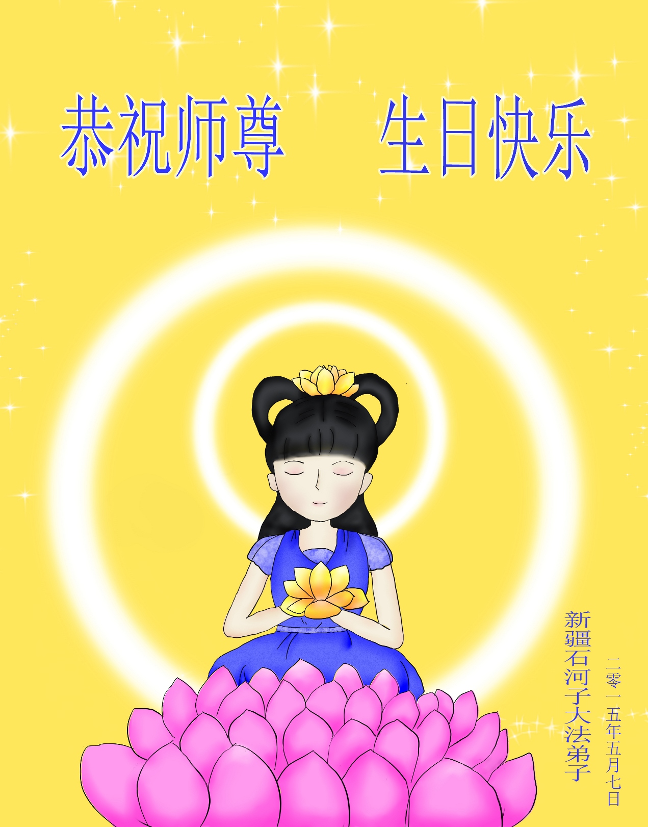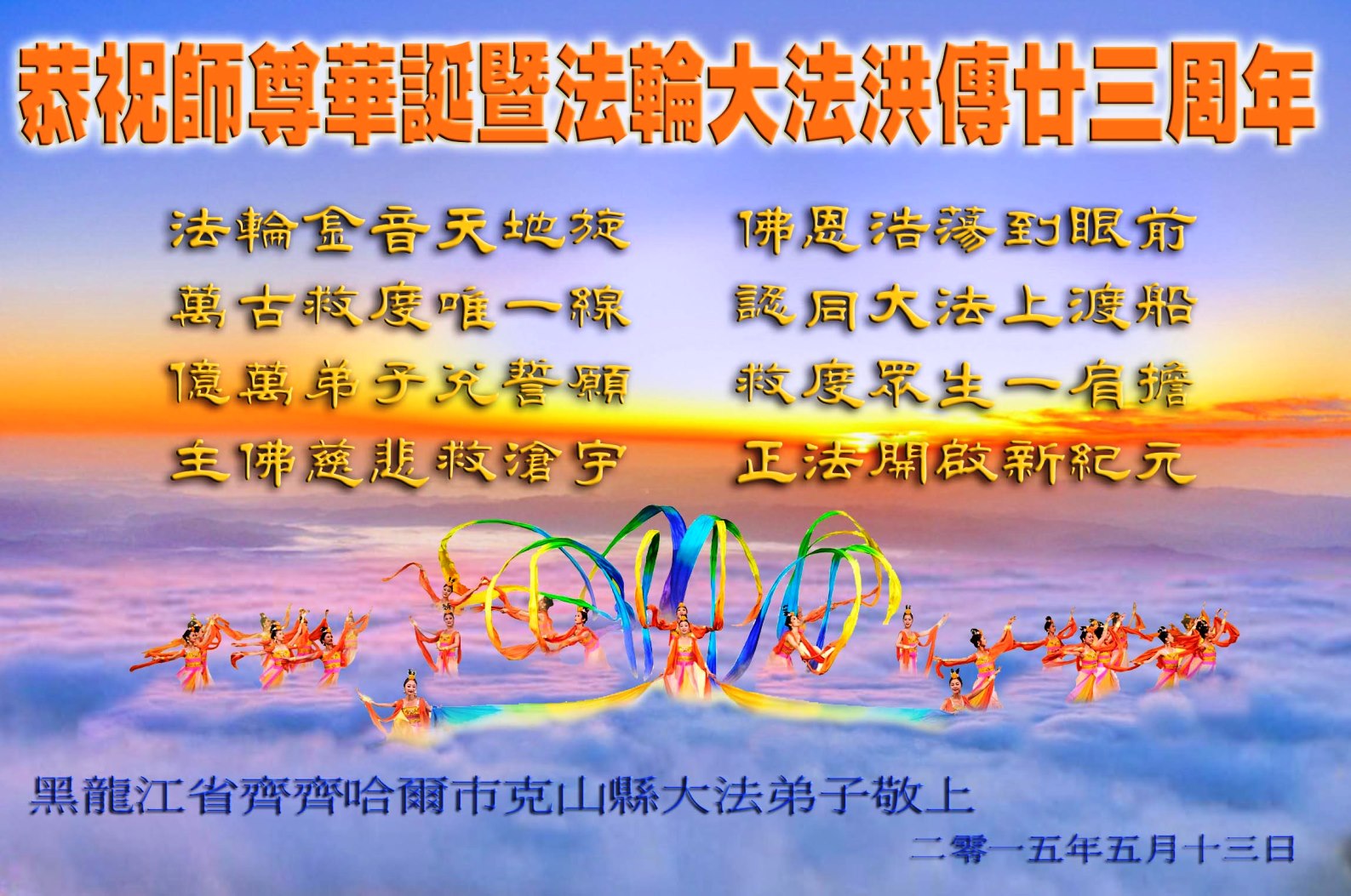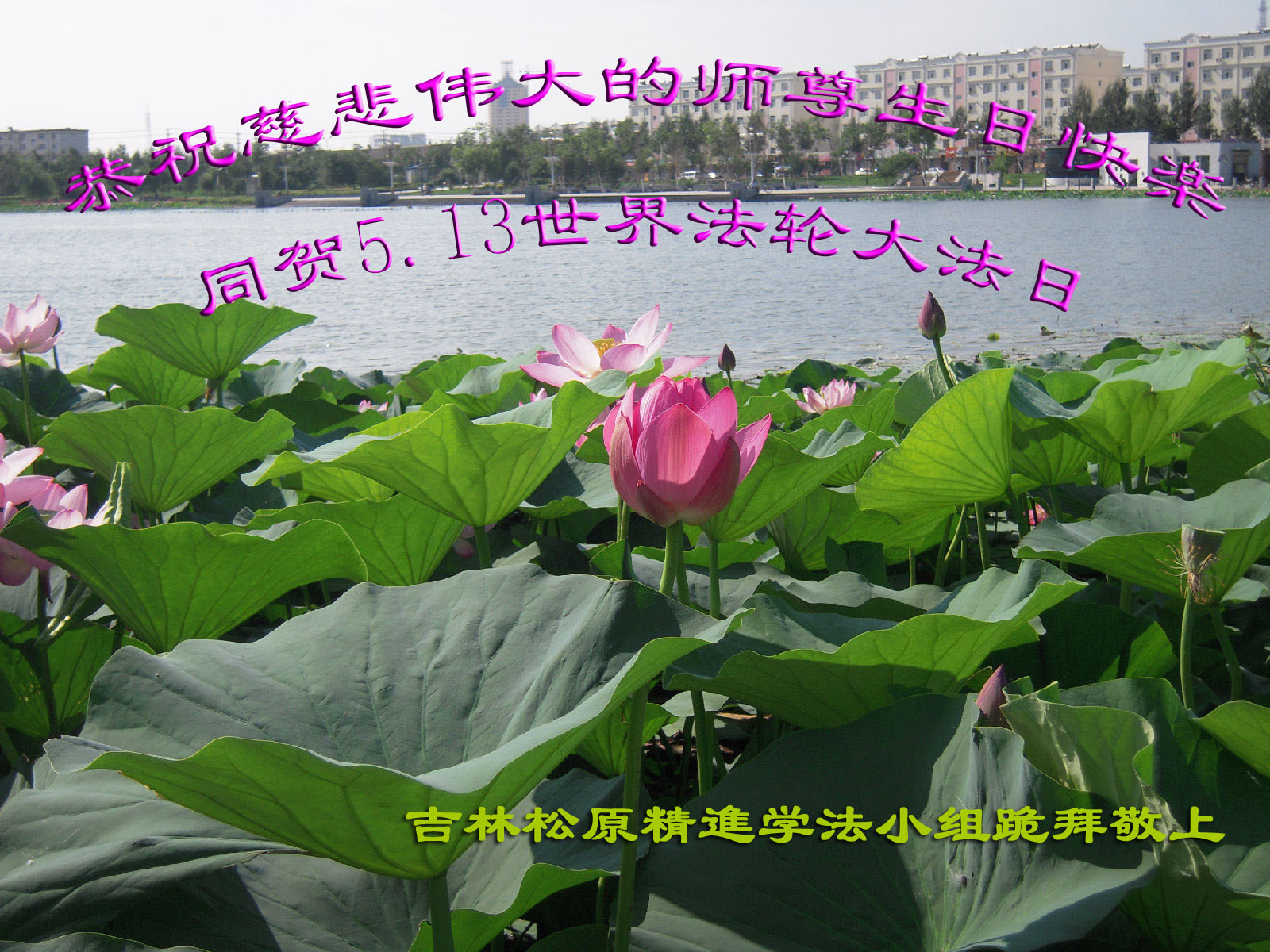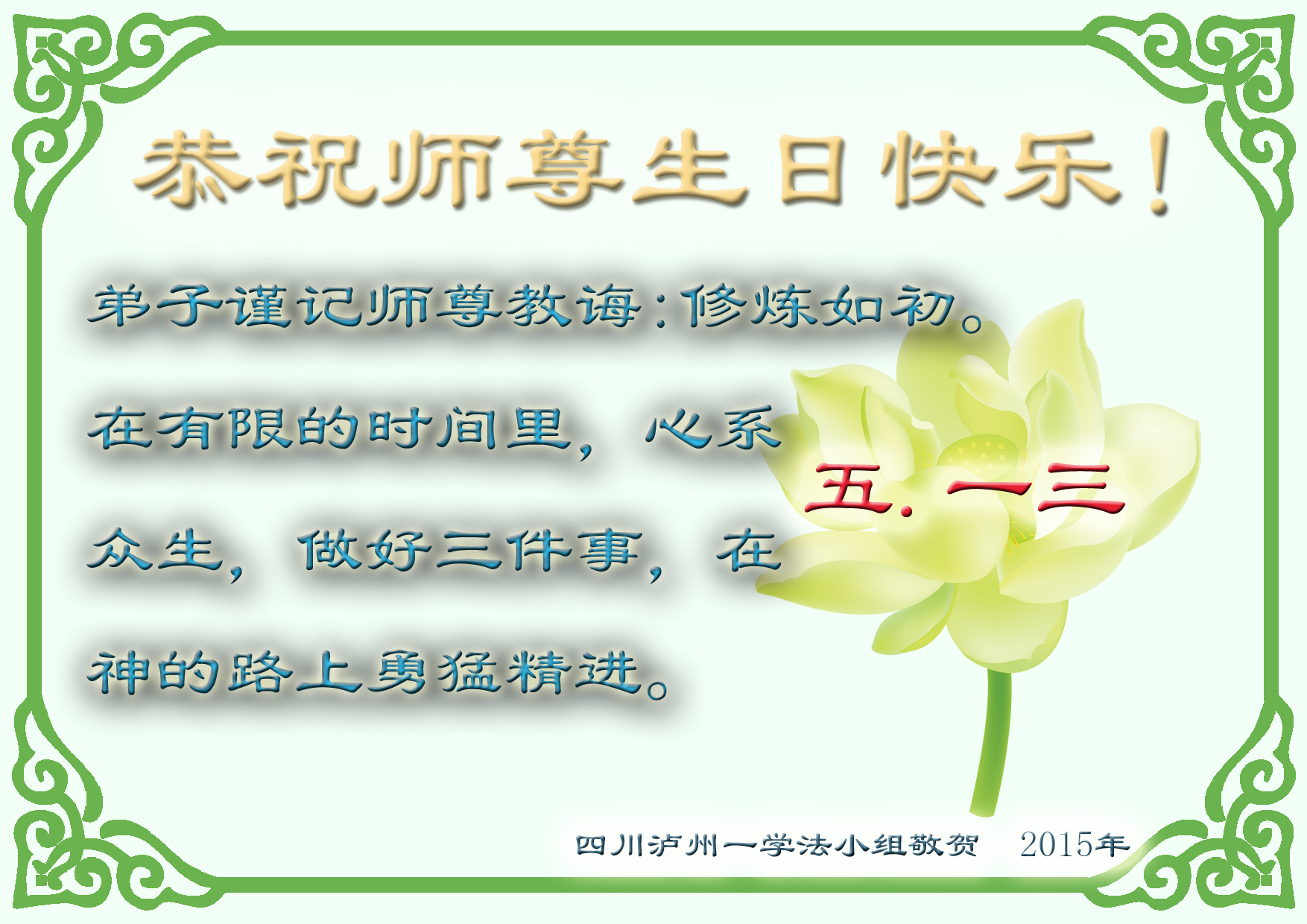值此“五一三”普天同庆之日,我二人恭祝慈悲伟大的师尊生日快乐!叩谢师恩!