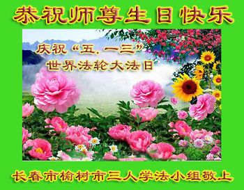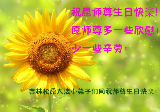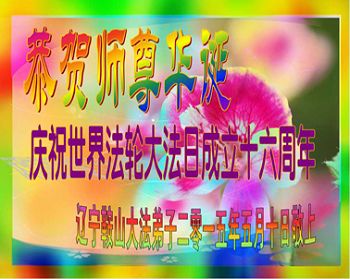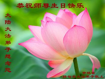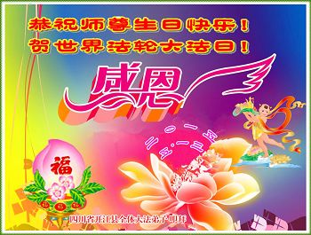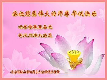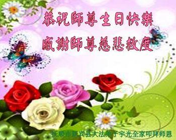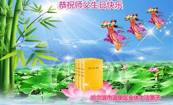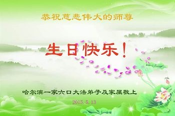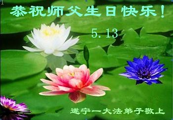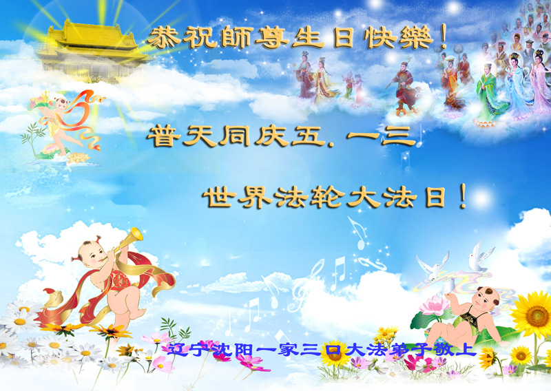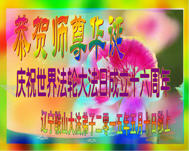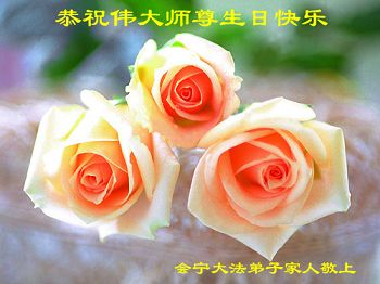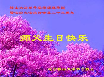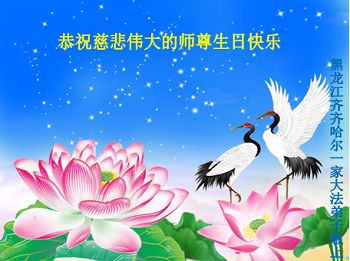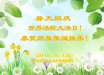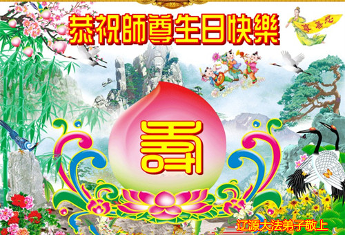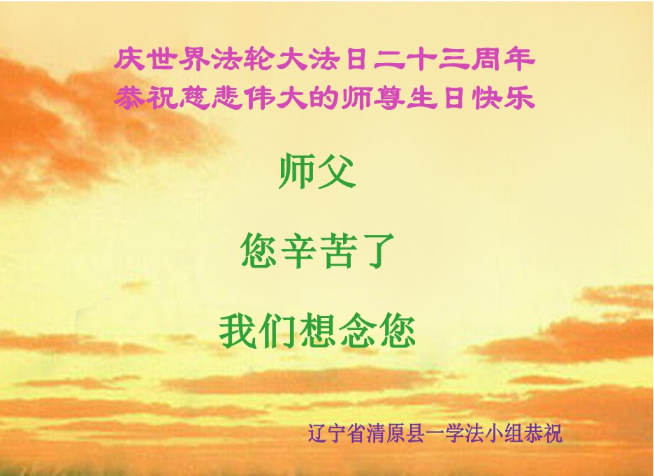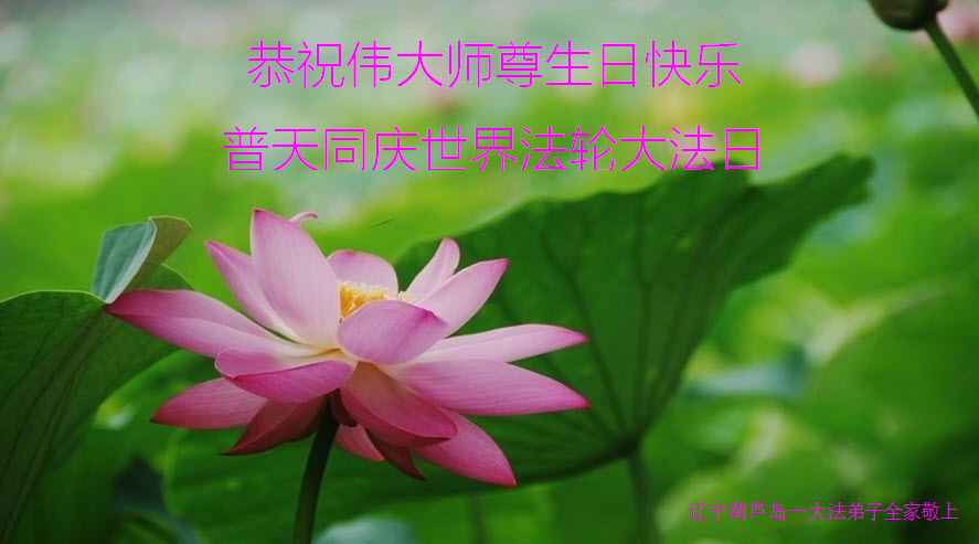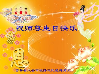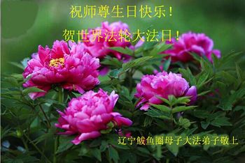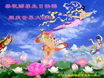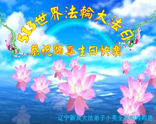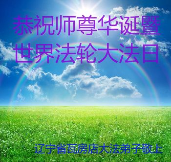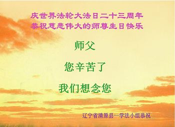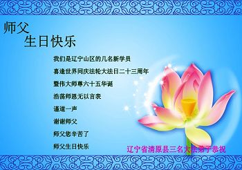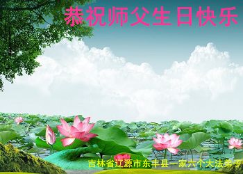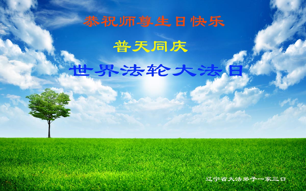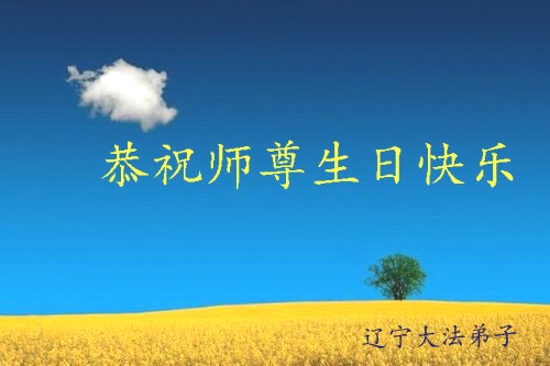 我是辽宁省大法修炼者家属,这几年师父对我不薄,让我身心受益,为表达对师父的感恩之情,特在法轮大法日祝贺师父,感激之情无法用语言表达。所以在此,只能祝大法师父生日快乐!谢谢师父!
