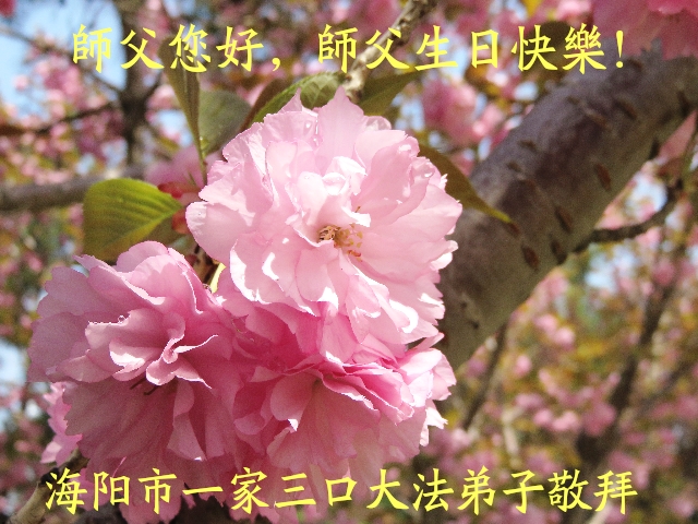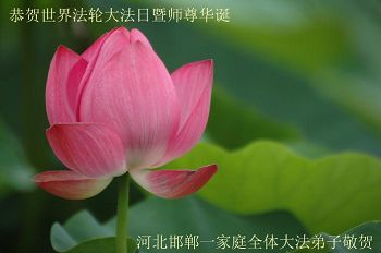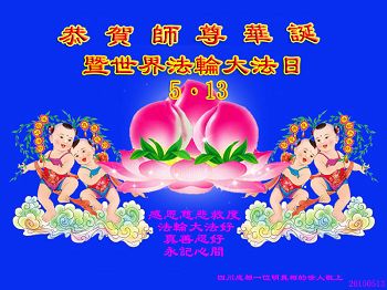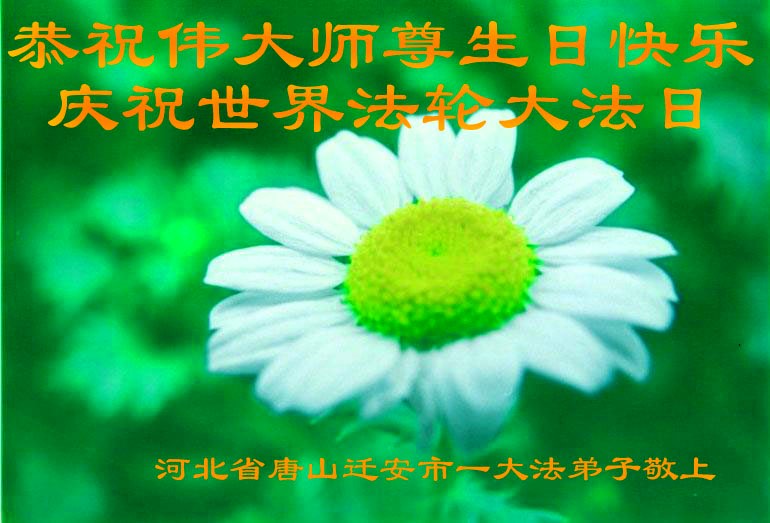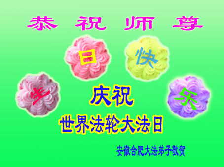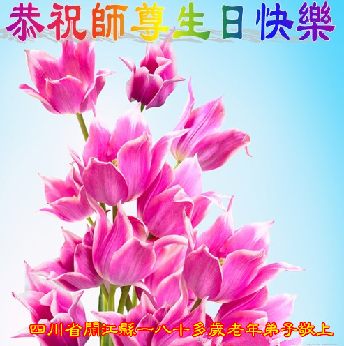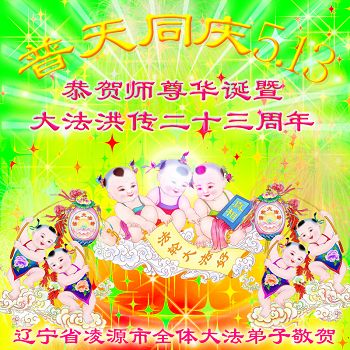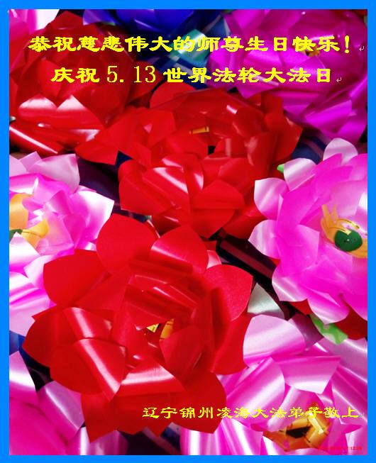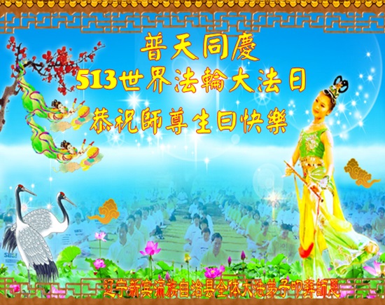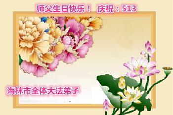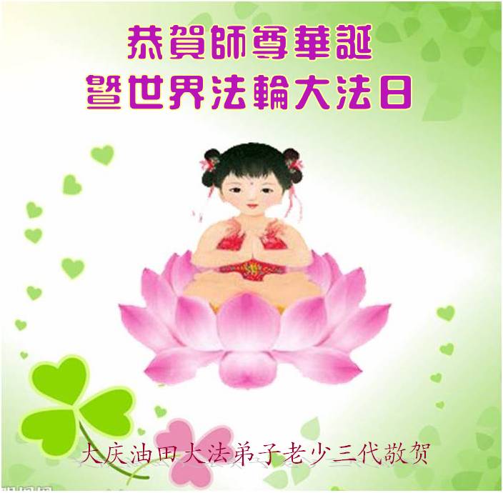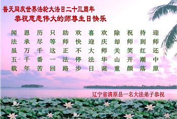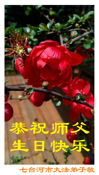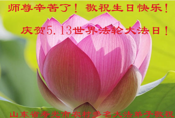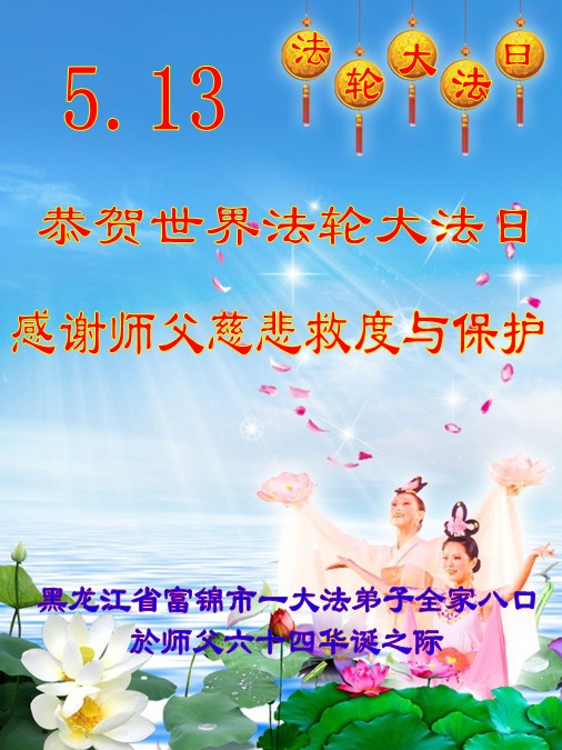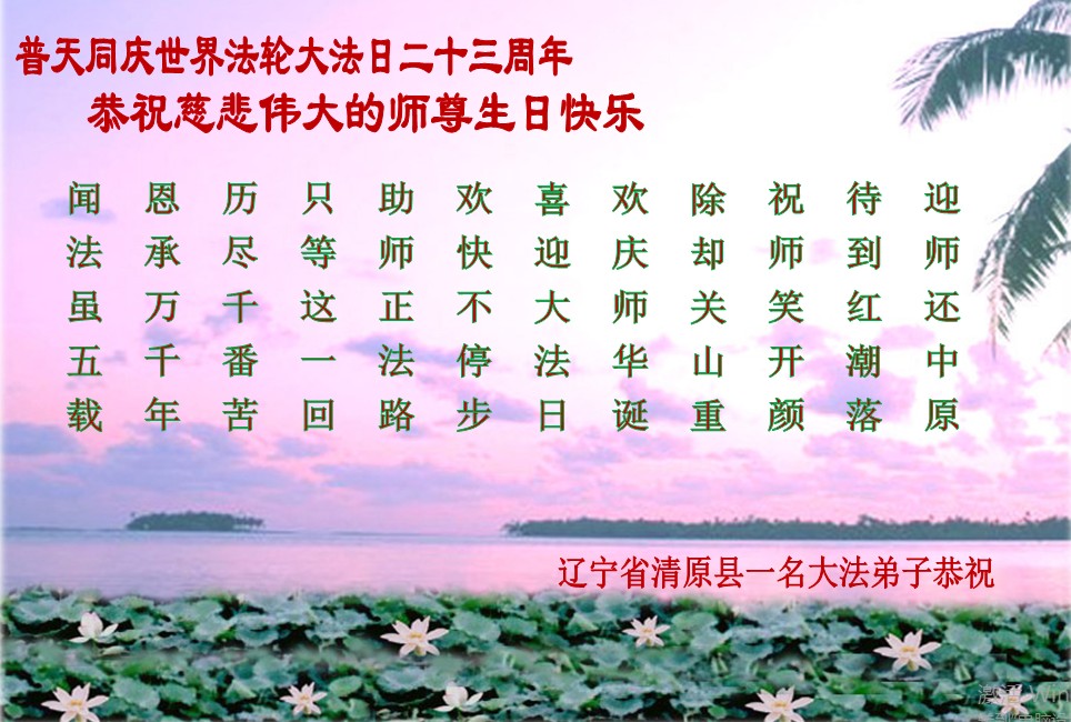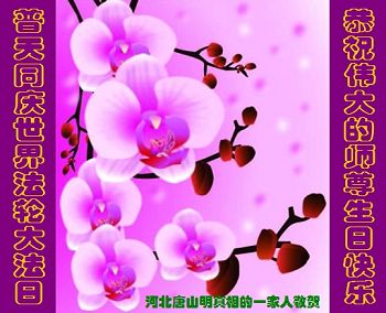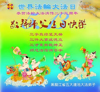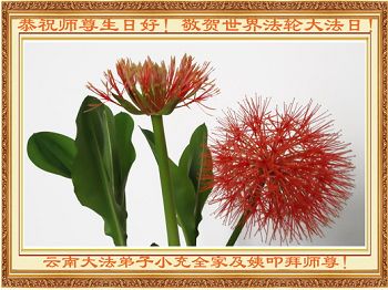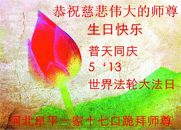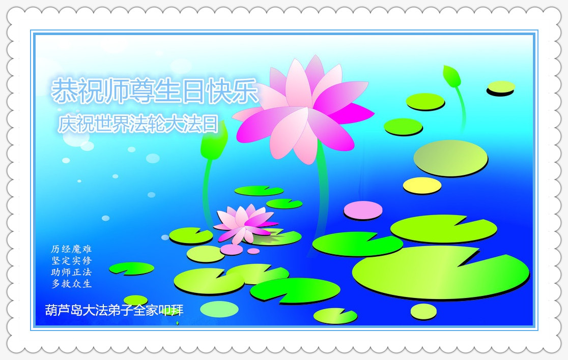 我是辽宁省大法修炼者家属,这几年师父对我不薄,让我身心受益,为表达对师父的感恩之情,特在法轮大法日祝贺师父,感激之情无法用语言表达。所以在此,只能祝大法师父生日快乐!谢谢师父!
