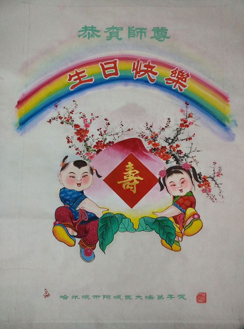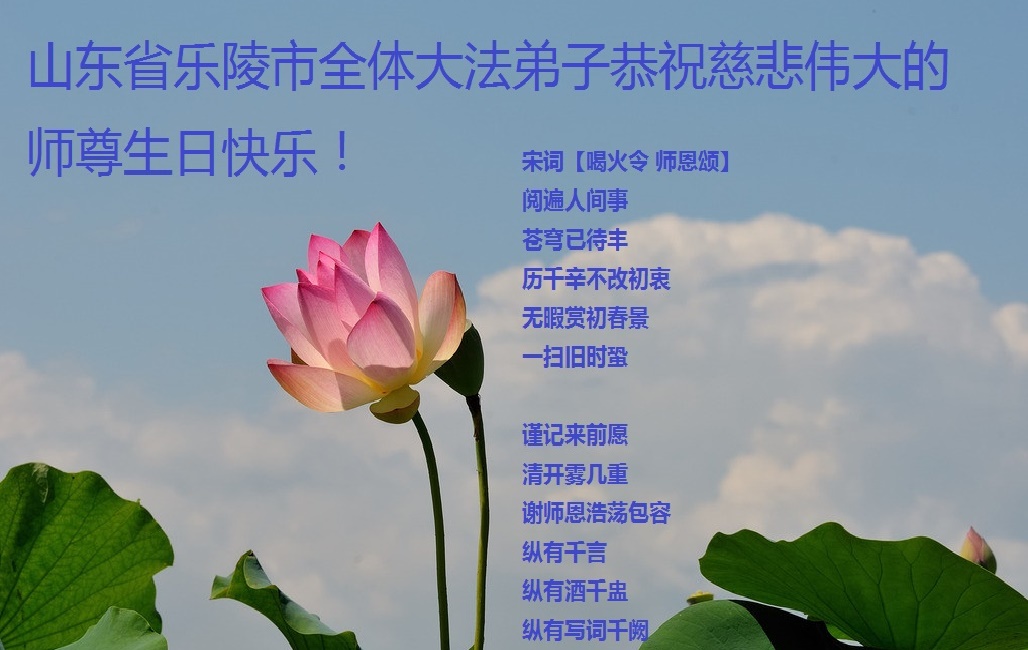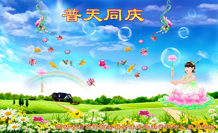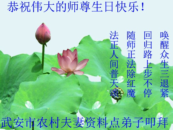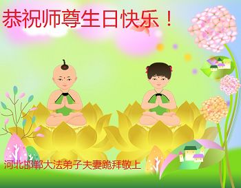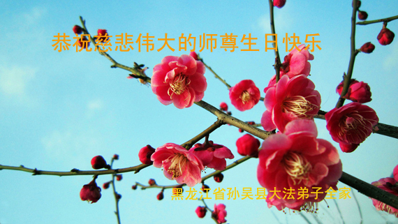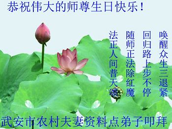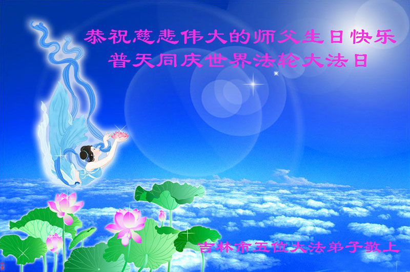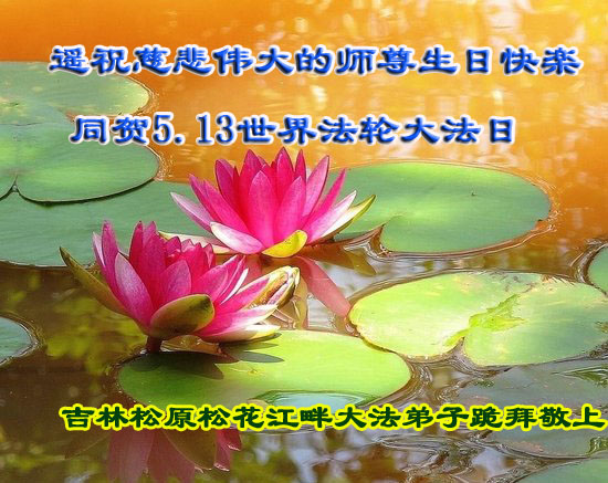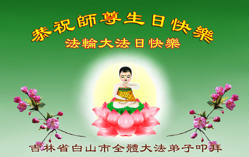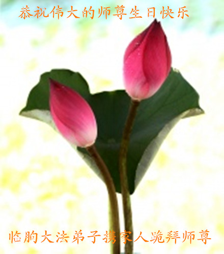 在这普天同庆的日子里,吉林省通化市一夫妻大法弟子及刚得法的家人,恭祝师尊生日快乐!谢谢师尊慈悲救度!叩谢师尊!谢谢师父!