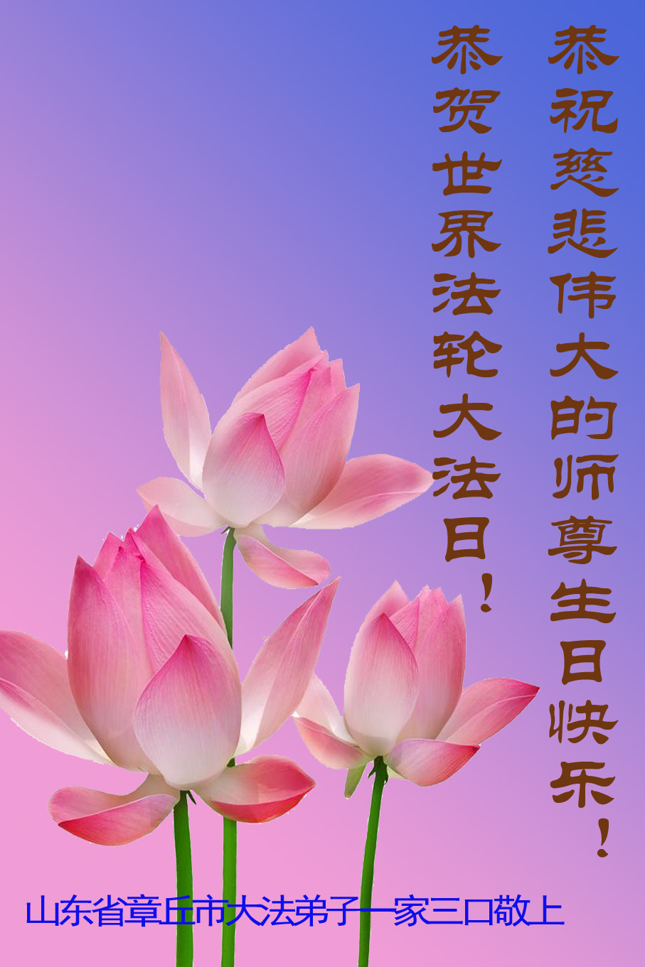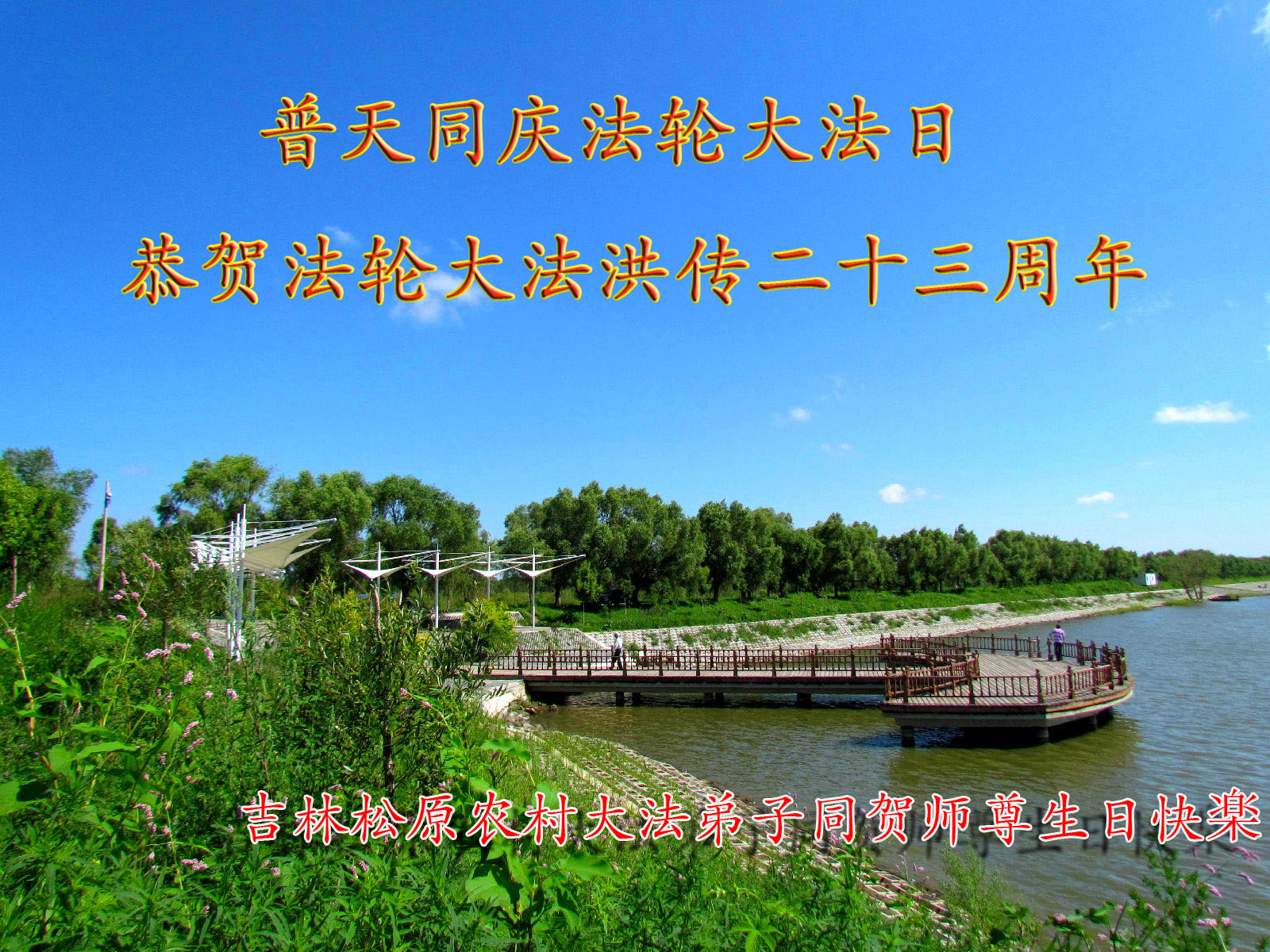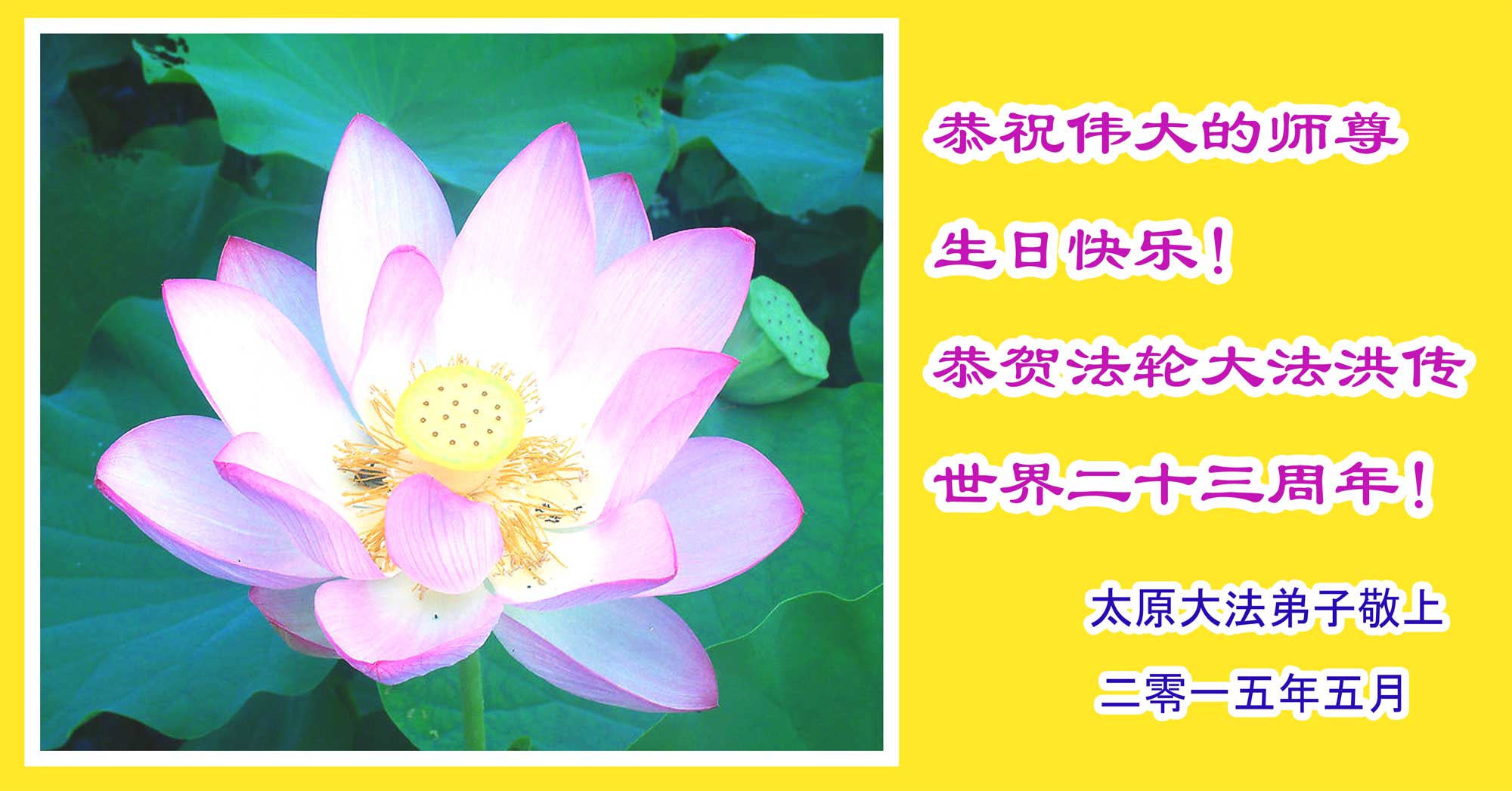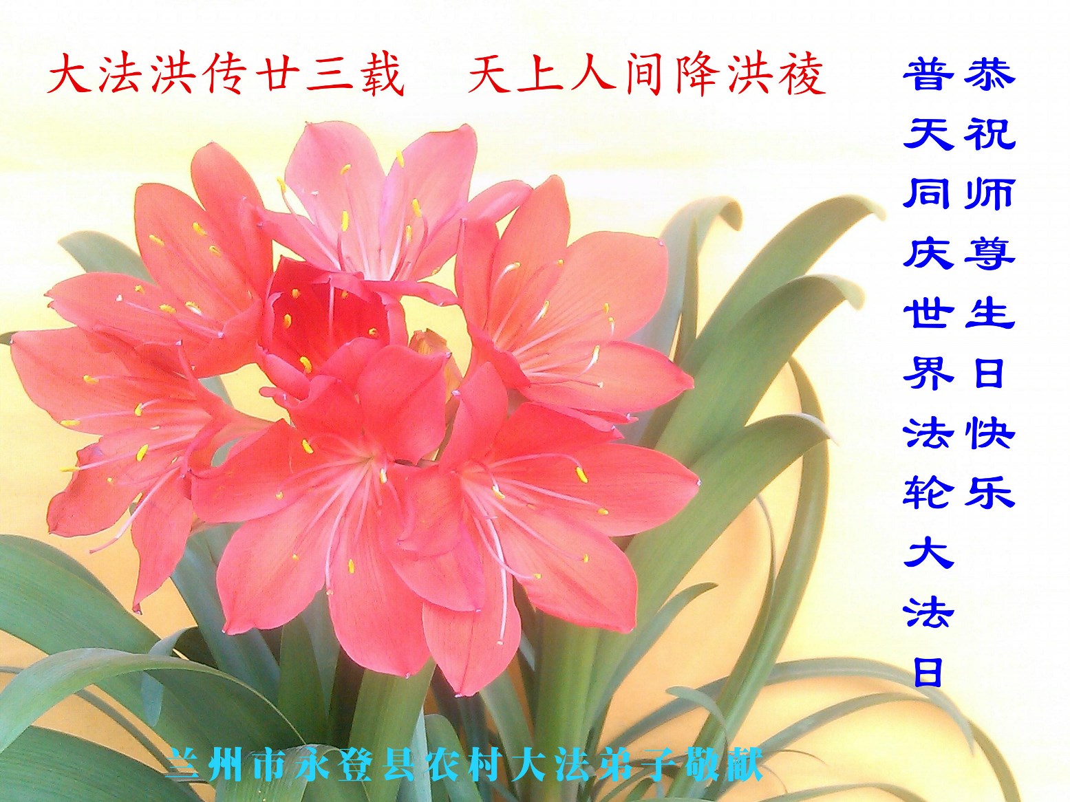 弟子代表学法小组同修及家中小弟子、新得法同修、还未修炼的家人、建筑体系众生恭祝法轮大法洪传二十三周年!恭祝世界法轮大法日十六周年!恭祝师尊华诞!