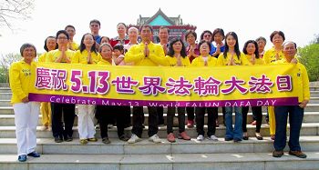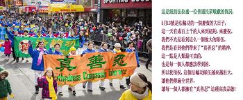 5月13号是法轮功的一个庆贺的大日子,这一天有成百上千的人来到纽约,来庆祝。我们不光是看到这么一个强大的队伍,我们是看到他们带来了“真善忍”的精神,这一点上人类最可贵的,也是每一个人都应该学到的。所以我预祝,这个法轮功队伍越来越壮大,让他们传遍全世界,让每一个人都拥有“真善忍”这种高贵品德。谢谢!