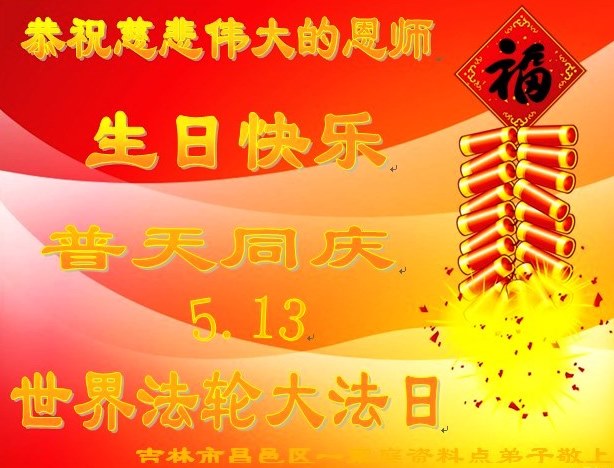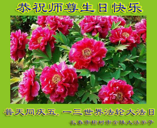 在喜迎世界法轮大法日之际,吉林省延边州一明真相的世人恭祝慈悲伟大的李老师生日快乐!法轮大法洪传23年,使世人明白了“真、善、忍”的宇宙真理,知道了人生的真正意义,善良的本性在复苏,社会道德在提升。大法弟子在16年的反的迫害中,坚持不懈地讲真相,慈悲救度被邪*党-欺骗毒害的众生,使世人认清了中共的邪灵、邪教本质,从而退出中共邪*党-,心灵和生命得到救赎,走向新生。衷心感谢慈悲伟大的李老师救度之恩!
