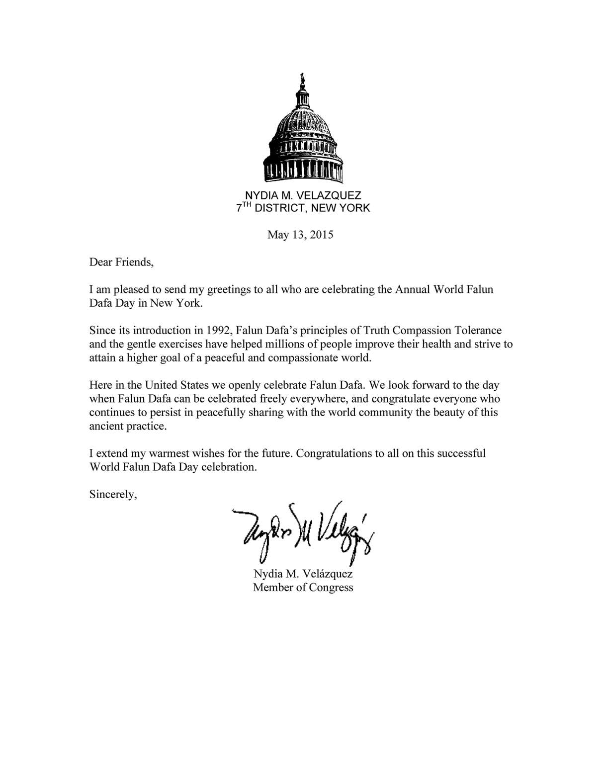 纽约第七选区国会议员娜迪娅•维拉兹奎兹(Nydia M. Velazquez)在贺信中,赞扬法轮大法“真、善、忍”的原则和修炼功法,帮助上亿的人改善了身体健康,并为实现和平与祥和的世界而努力。她希望有一天,人们在任何地方都可以自由的庆祝法轮大法。