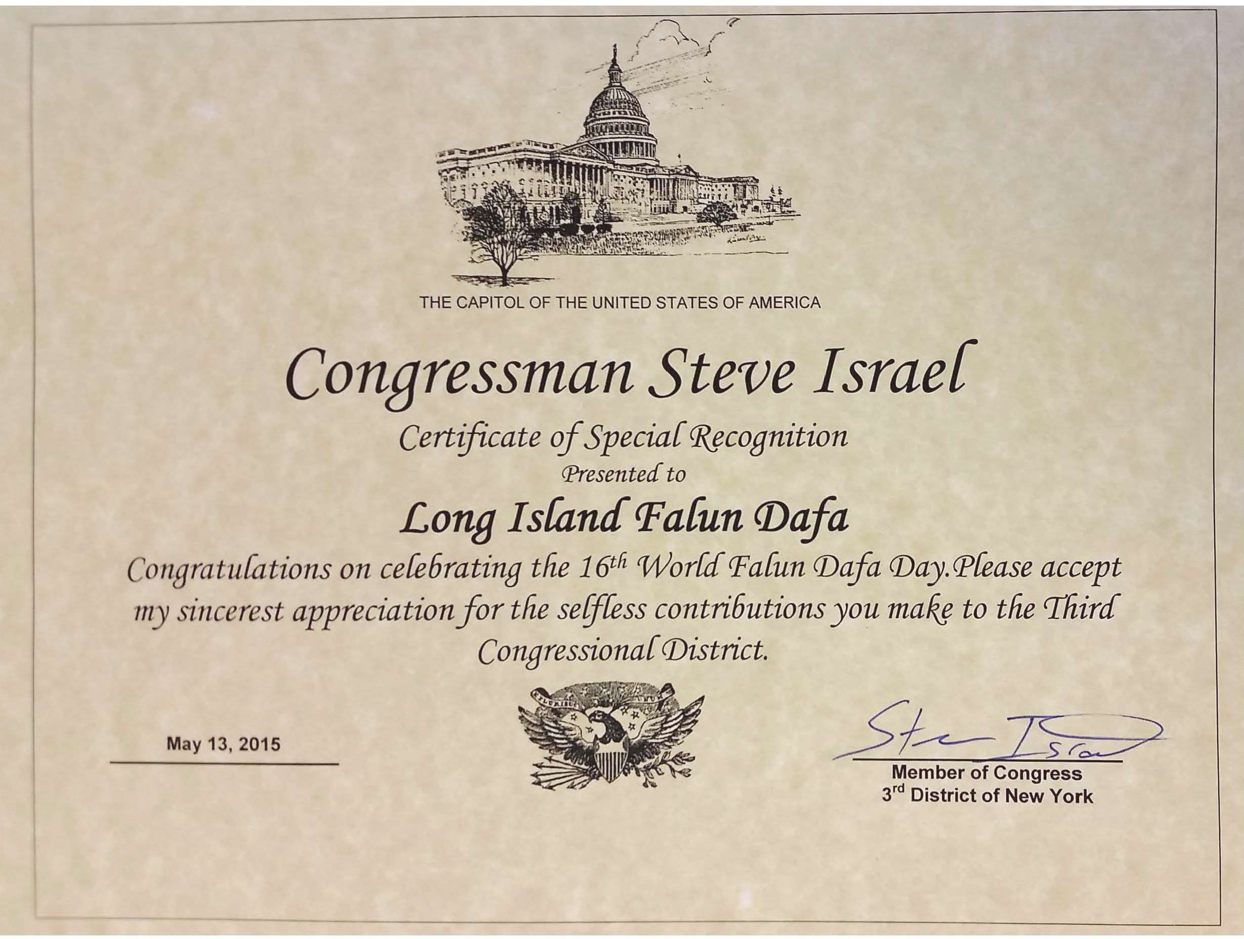 纽约第三选区国会议员史蒂夫•以色列(Steve Israel)在褒奖状中,祝贺第十六届世界法轮大法日。他感谢法轮功学员做出的无私奉献。