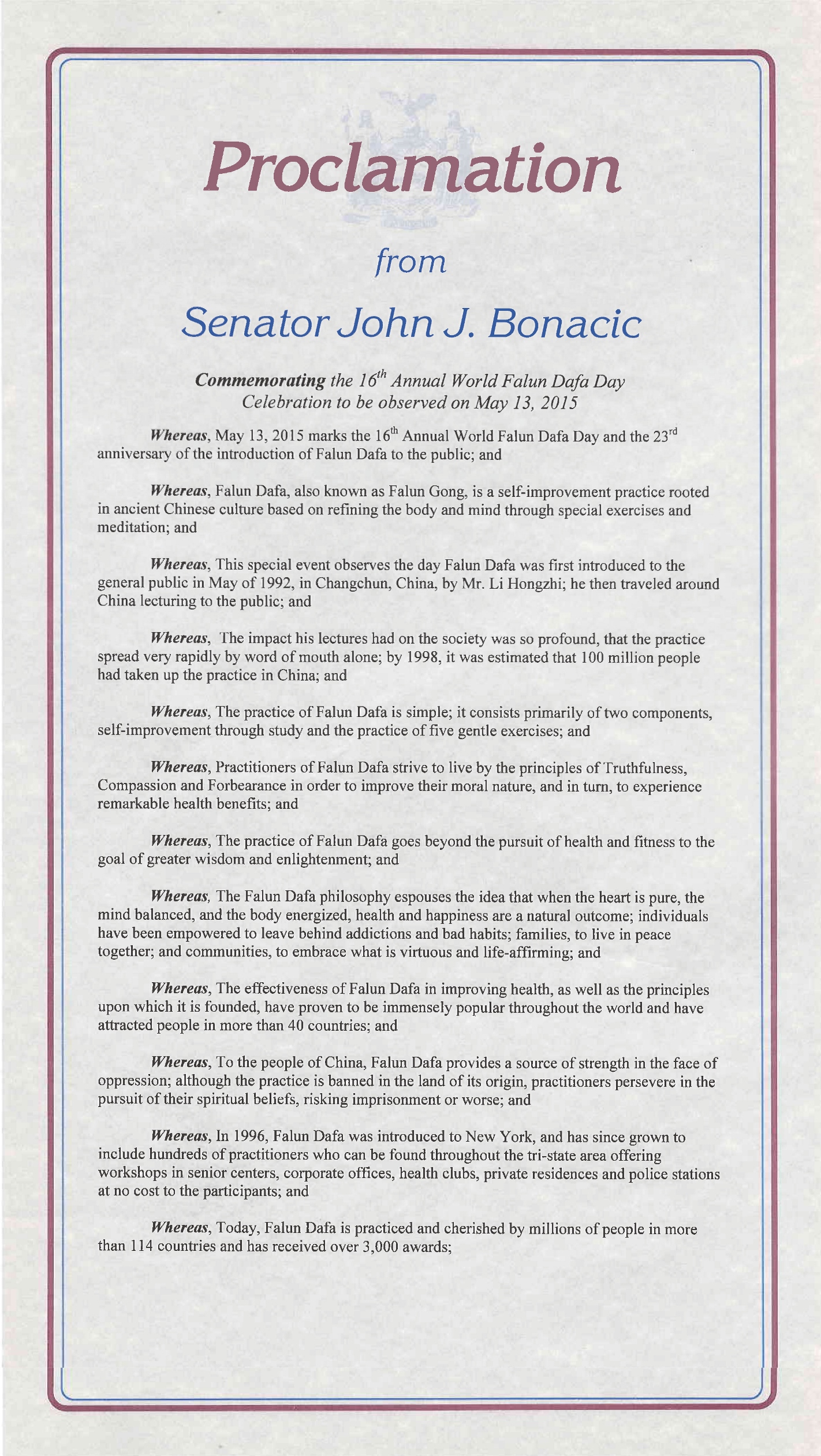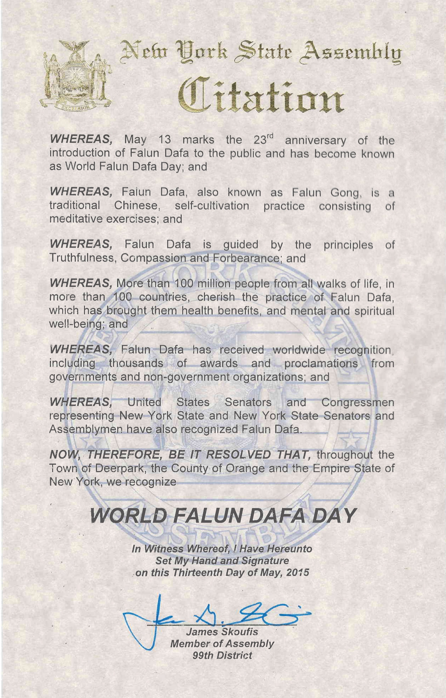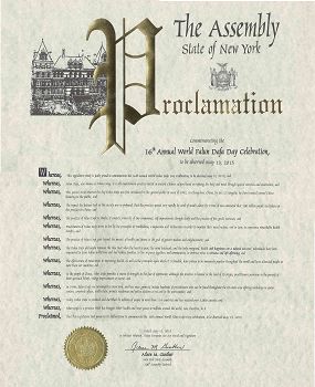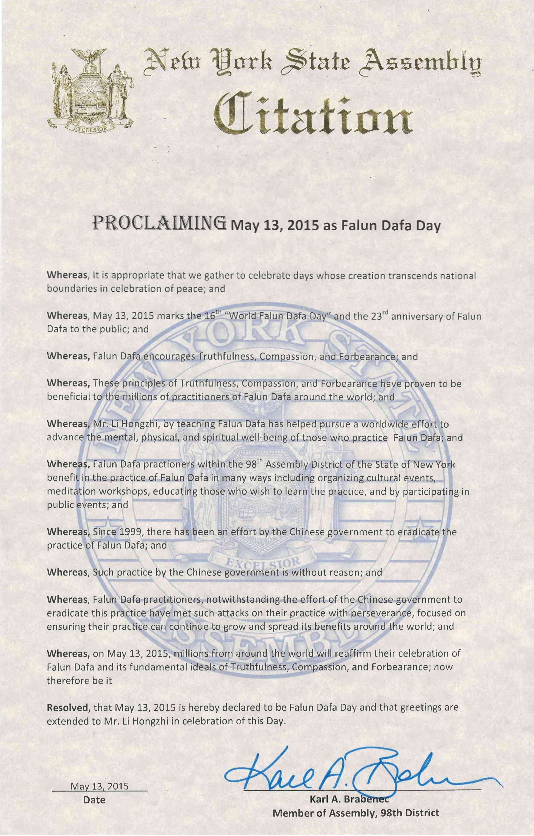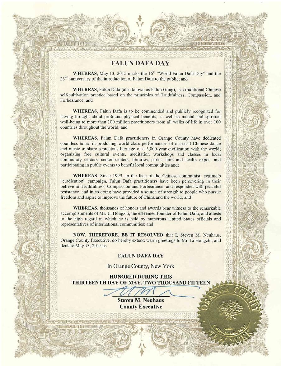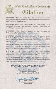 【明慧网二零一五年五月十三日】二零一五年五月十三日是第十六届世界法轮大法日,也是法轮大法传世二十三周年,美国纽约州多位国会议员颁发褒奖和贺信,祝贺法轮大法日,赞扬法轮大法“真、善、忍”的原则和修炼功法,帮助上亿的人改善了身体健康。