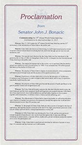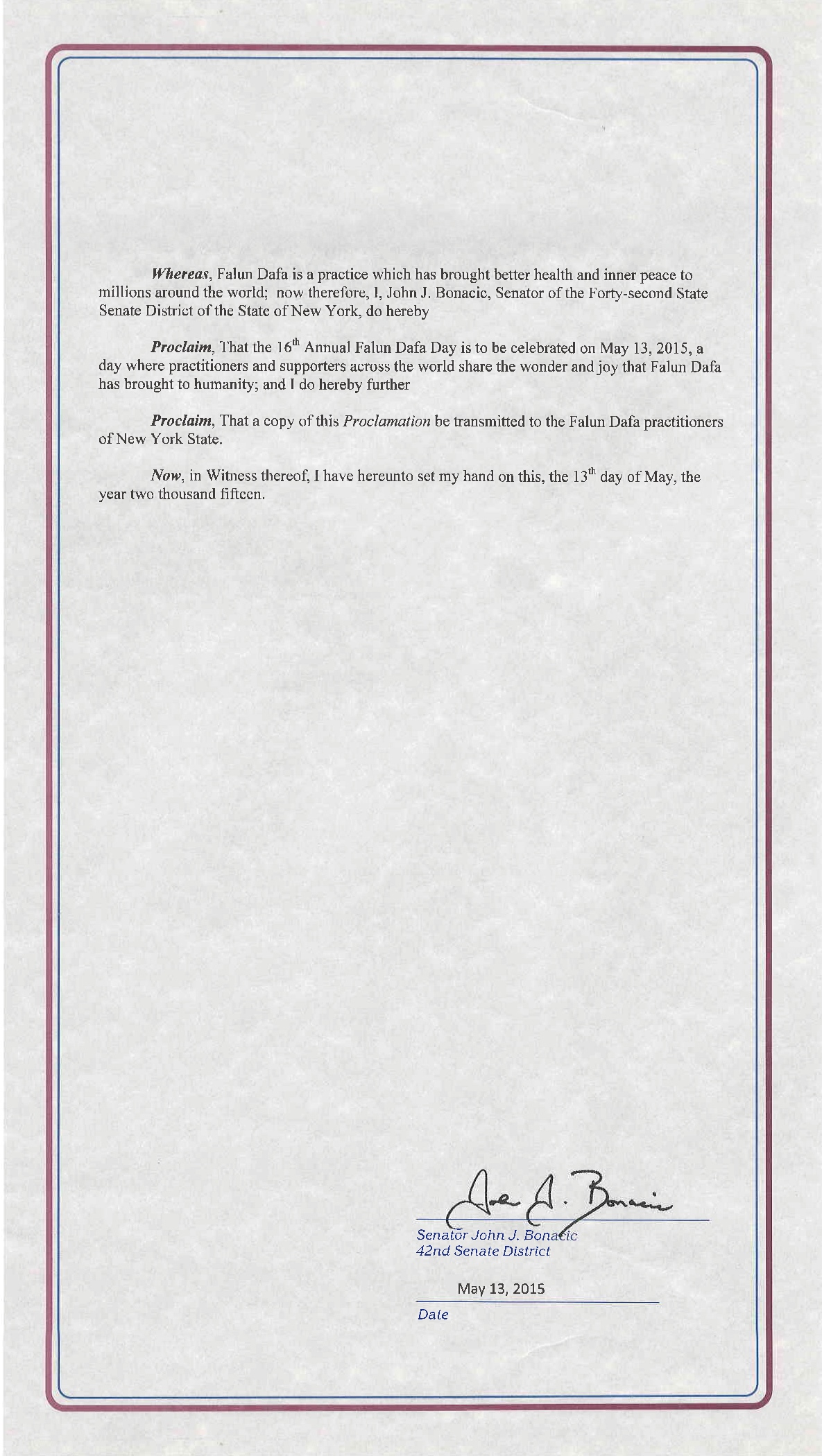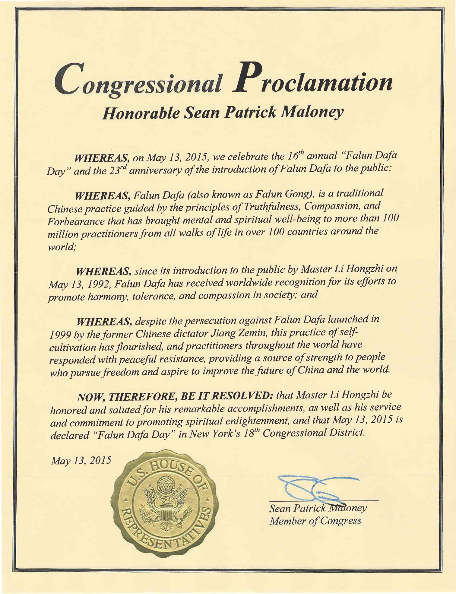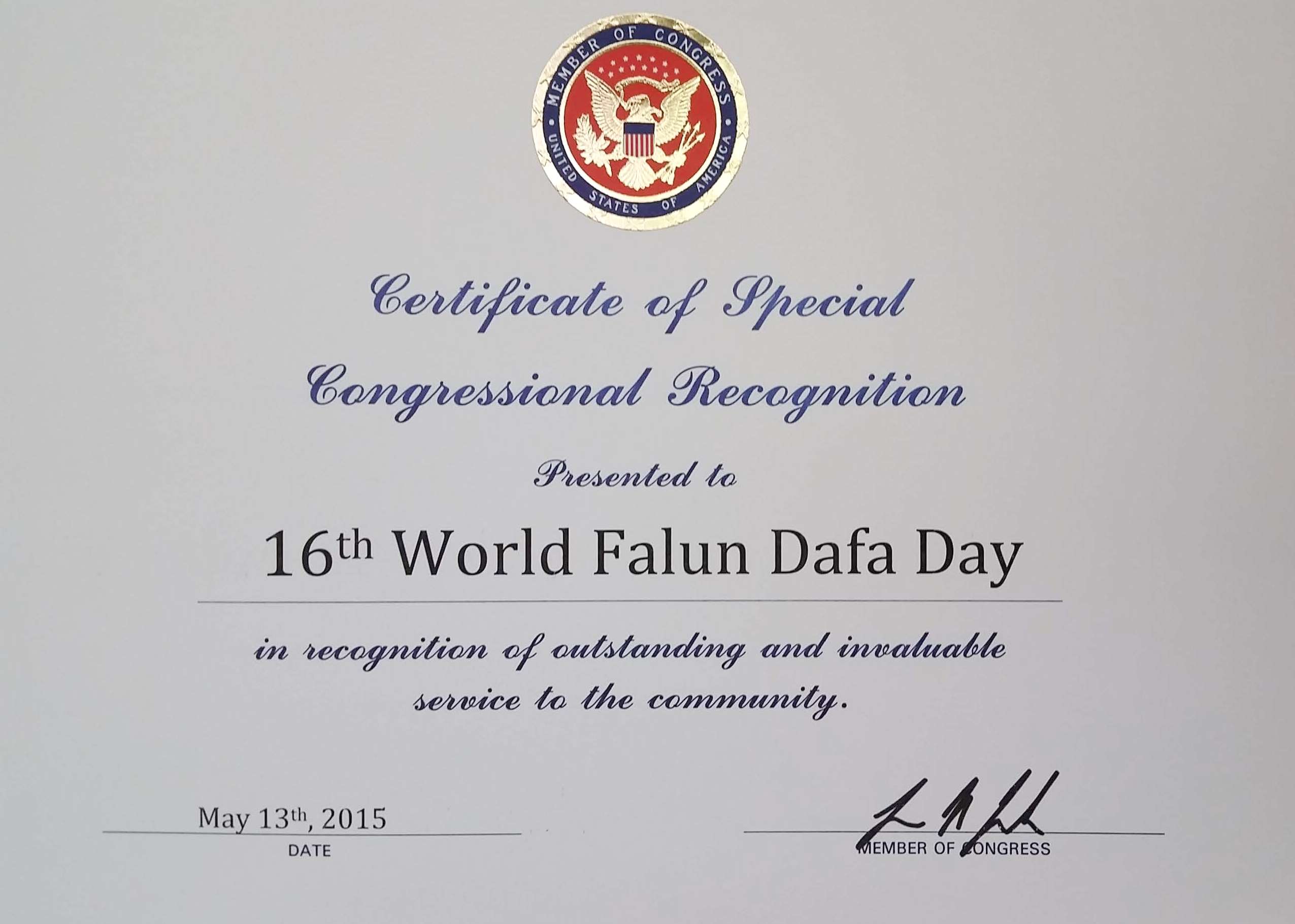 【明慧网二零一五年五月十三日】二零一五年五月十三日是第十六届世界法轮大法日,也是法轮大法传世二十三周年,美国纽约州多位国会议员颁发褒奖和贺信,祝贺法轮大法日,赞扬法轮大法“真、善、忍”的原则和修炼功法,帮助上亿的人改善了身体健康。