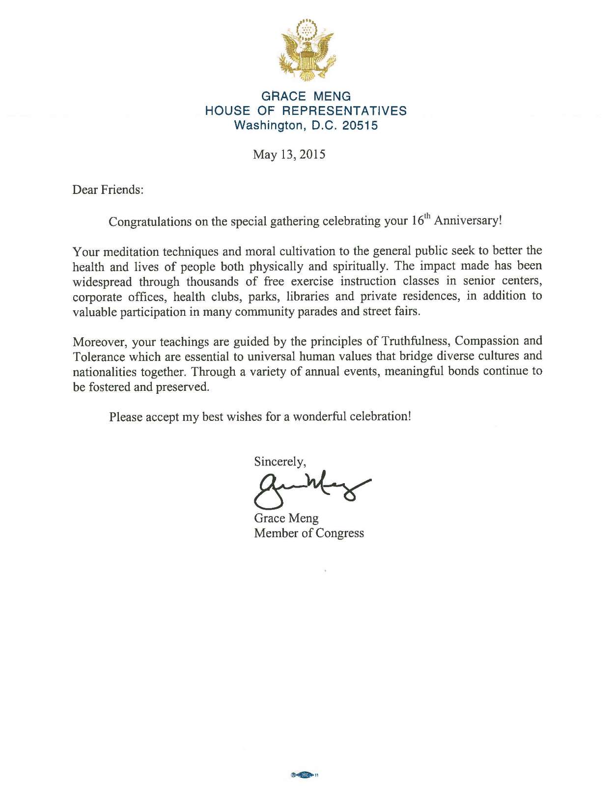纽约州第六选区国会议员孟昭文(Grace Meng)在贺信中说,法轮功以“真、善、忍”为原则,这是让不同文化和不同族裔团聚在一起的普世价值。值此第十六届法轮大法日之际,我向你们表示祝贺。祝你们有一个美好的庆祝活动。