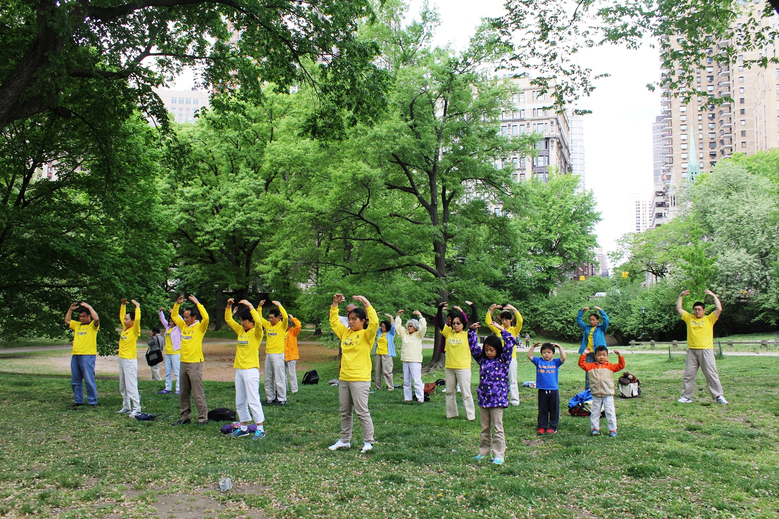 坐落于纽约市曼哈顿区的中央公园,是世界上最著名的城市公园之一,人称都市中的大绿洲,除了各种各样供民众休闲娱乐的设施,就是无数或大或小的草坪、绿地、山坡、绿荫地,在这一天,从东到西、从南到北,占地八百四十三英亩(3.41平方公里)的中央公园,随处可见法轮功学员在草地上宁静的炼功场面,或三五人一组,或数十人一圈,展示法轮功简单易学的五套功法——法轮大法大圆满法,鲜亮的黄色、祥和的能量场,让过往的民众过目难忘。