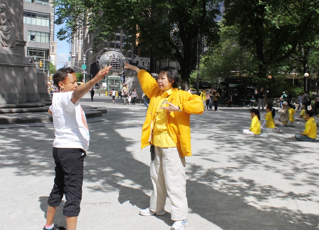 纽约居民黛安娜·帕帕(Diana Papa)女士静静地在一旁观看法轮功学员教功,一直等到教完功后,她才上前询问,希望得到一张如何学习法轮功的材料,也希望自己能够回去立即开始学炼。她说:“我看到这些学员在这里教功和炼功,感觉太好了,非常好。我妈妈住在长岛,我住在附近的一百三十九街,我们都很需要修炼法轮功。”
