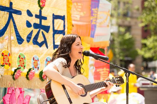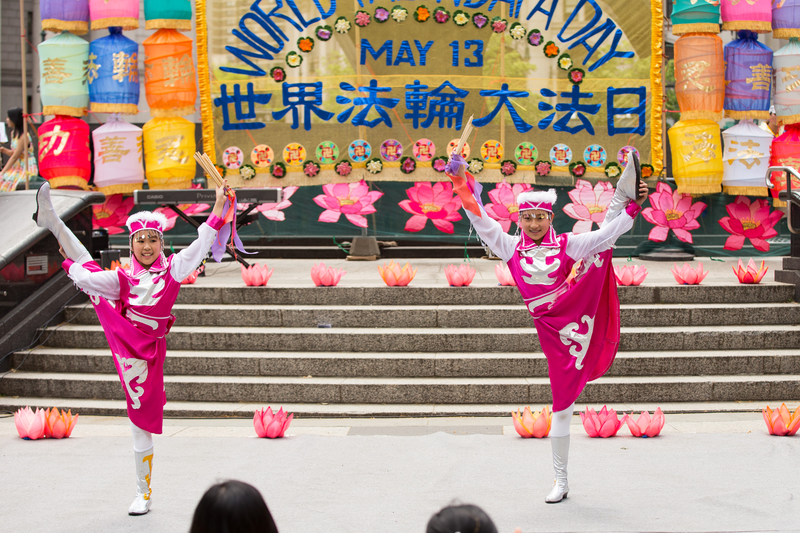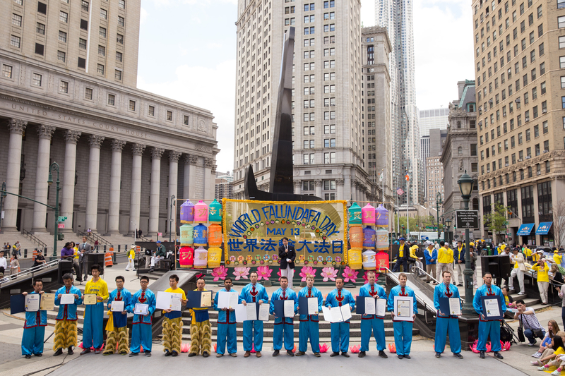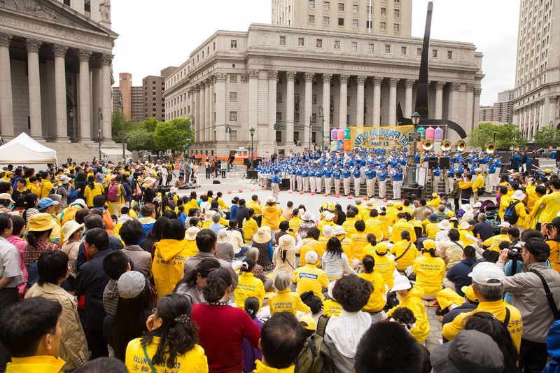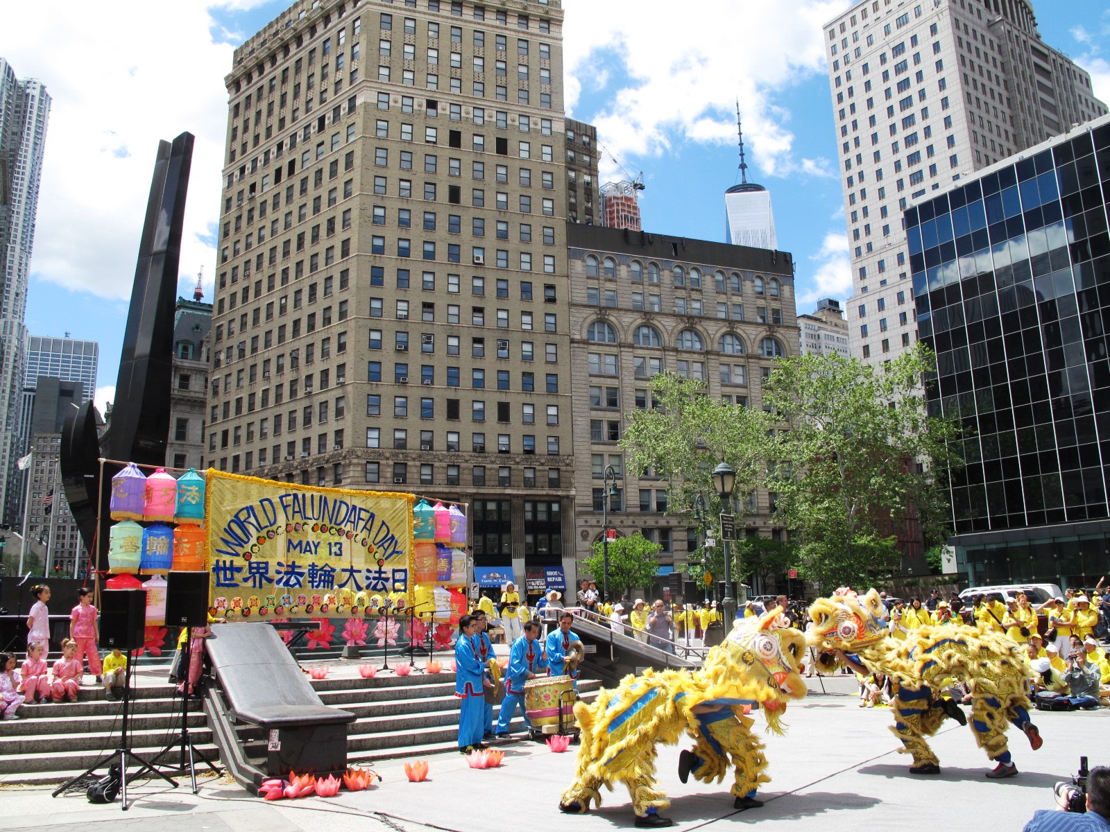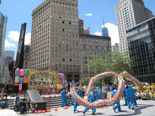 富丽广场位于纽约市政厅附近,是著名广场之一。法轮功学员隆重庆祝“世界法轮大法日”,把这里变成了一个众人瞩目的大舞台。舞台上,法轮功学员带着喜悦和感恩而来,带着精心准备的歌声、乐声、舞蹈而来。艳阳高照,天公作美,整个广场洋溢着节日的喜庆,普天同庆法轮大法好。