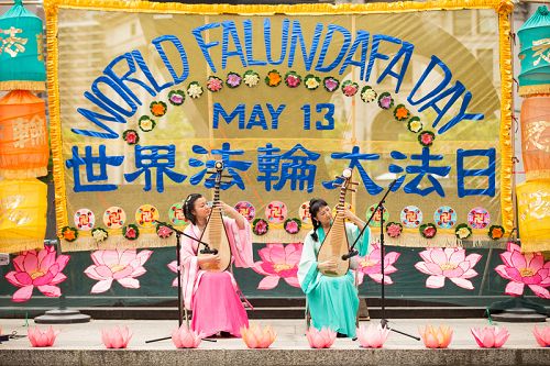 表演琵琶二重奏«万古天门开»的,有一位是一年前开始修炼法轮功的新学员,她表示能在“世界法轮大法日”上参加演出,是自己的荣幸。