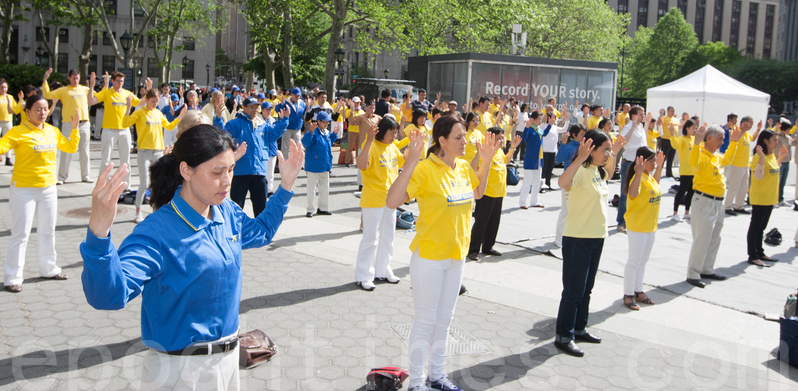 ![]() 图7-8:二零一五年五月十三日,法轮功学员在纽约曼哈顿的富丽广场集体炼功,有人现场学功 |
