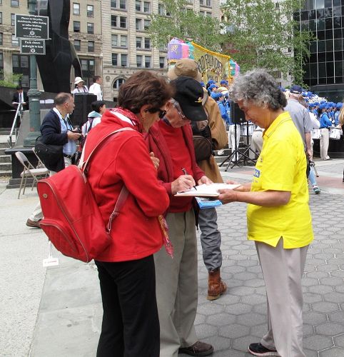![]() 图16:住在纽约的音乐人斯蒂文(Steven)被法轮功学员在富丽广场的集体炼功所吸引,了解真相后签名反迫害 |