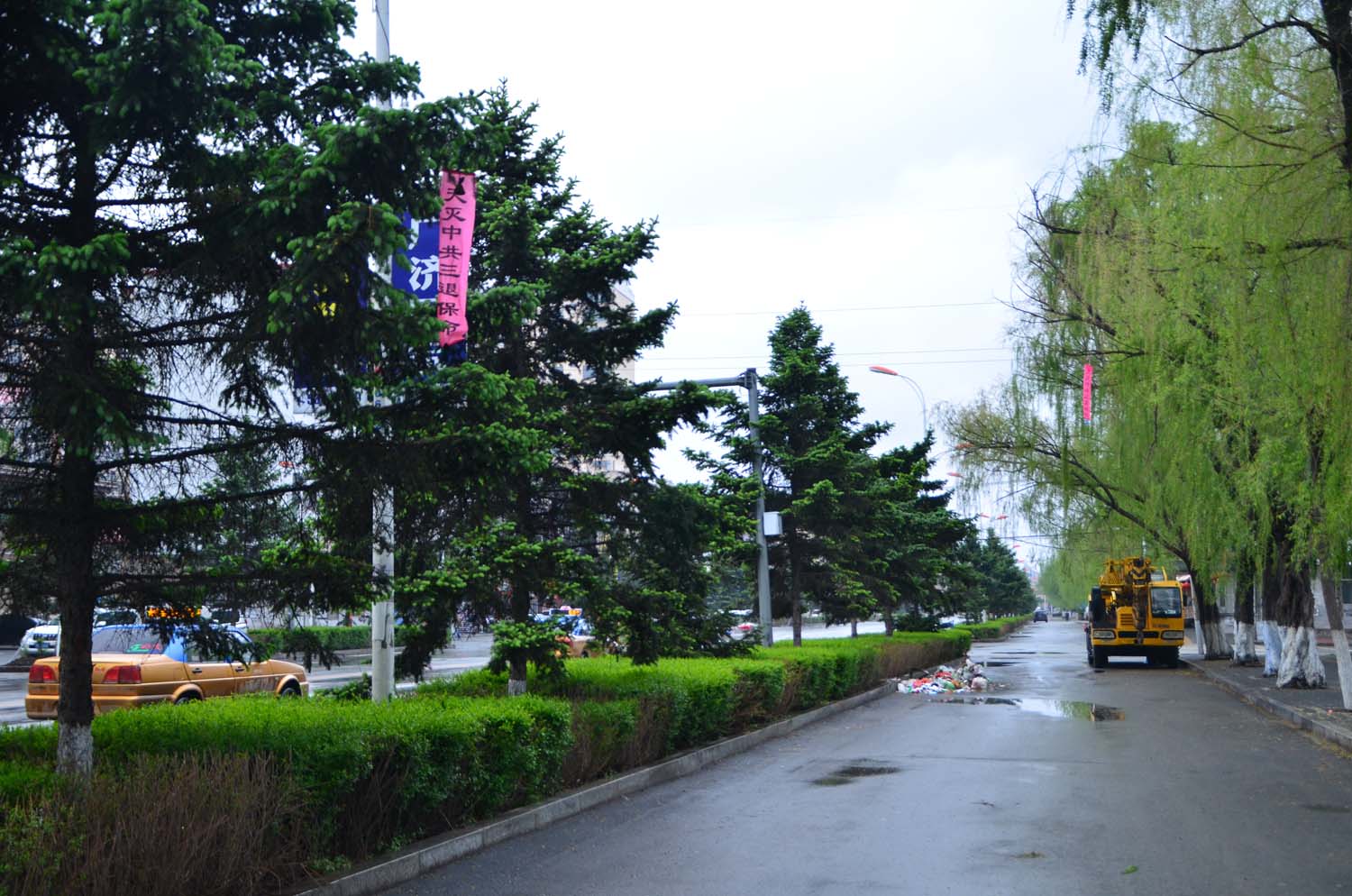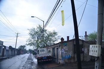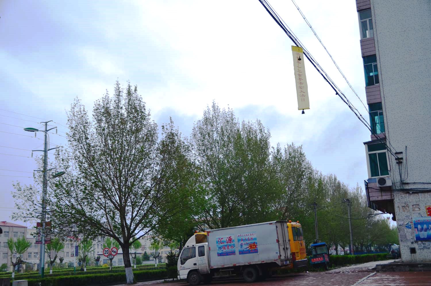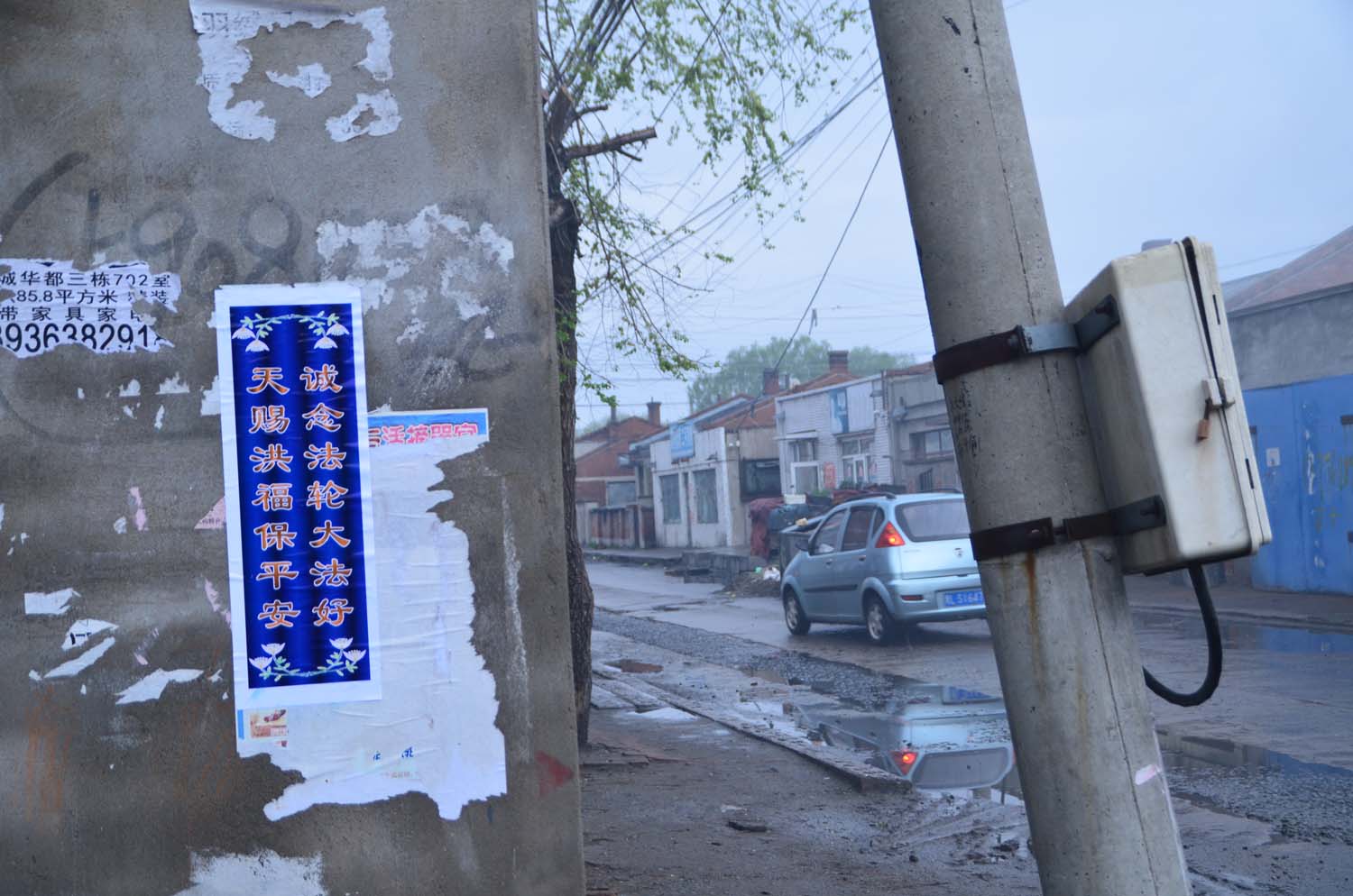 【明慧网二零一五年五月十六日】春雨洗礼过的大陆东北某地,树木刚刚披上新绿,城镇乡村多处可见“法轮大法好”的条幅、标语、海报和黏贴,庆祝五一三世界法轮大法日。