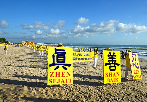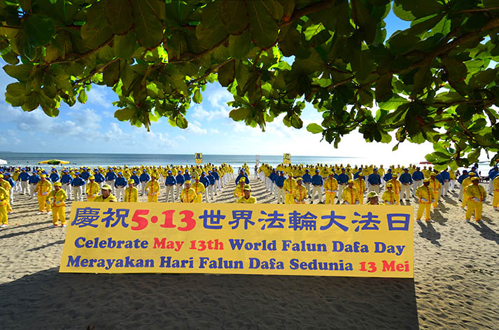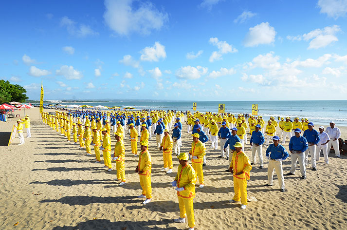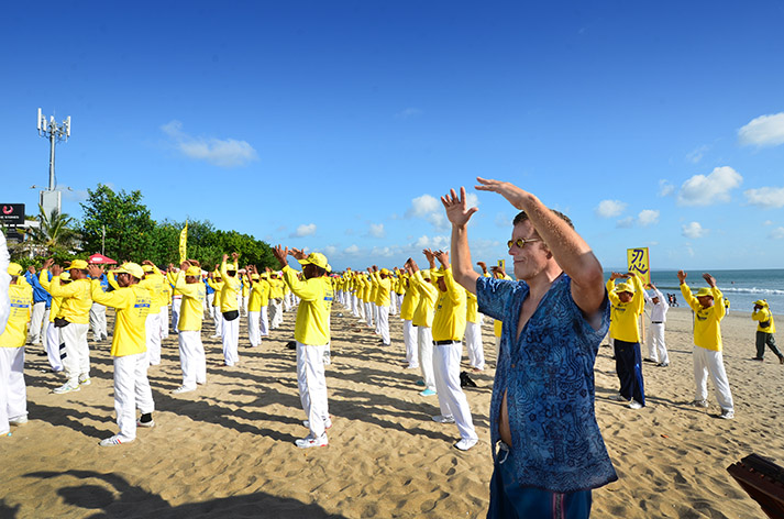 ![]() 学员们来到库塔-来吉安海滩,这是巴厘岛的旅游胜地之一,很多当地和外国的游客都加入到学员们的集体炼功中 |