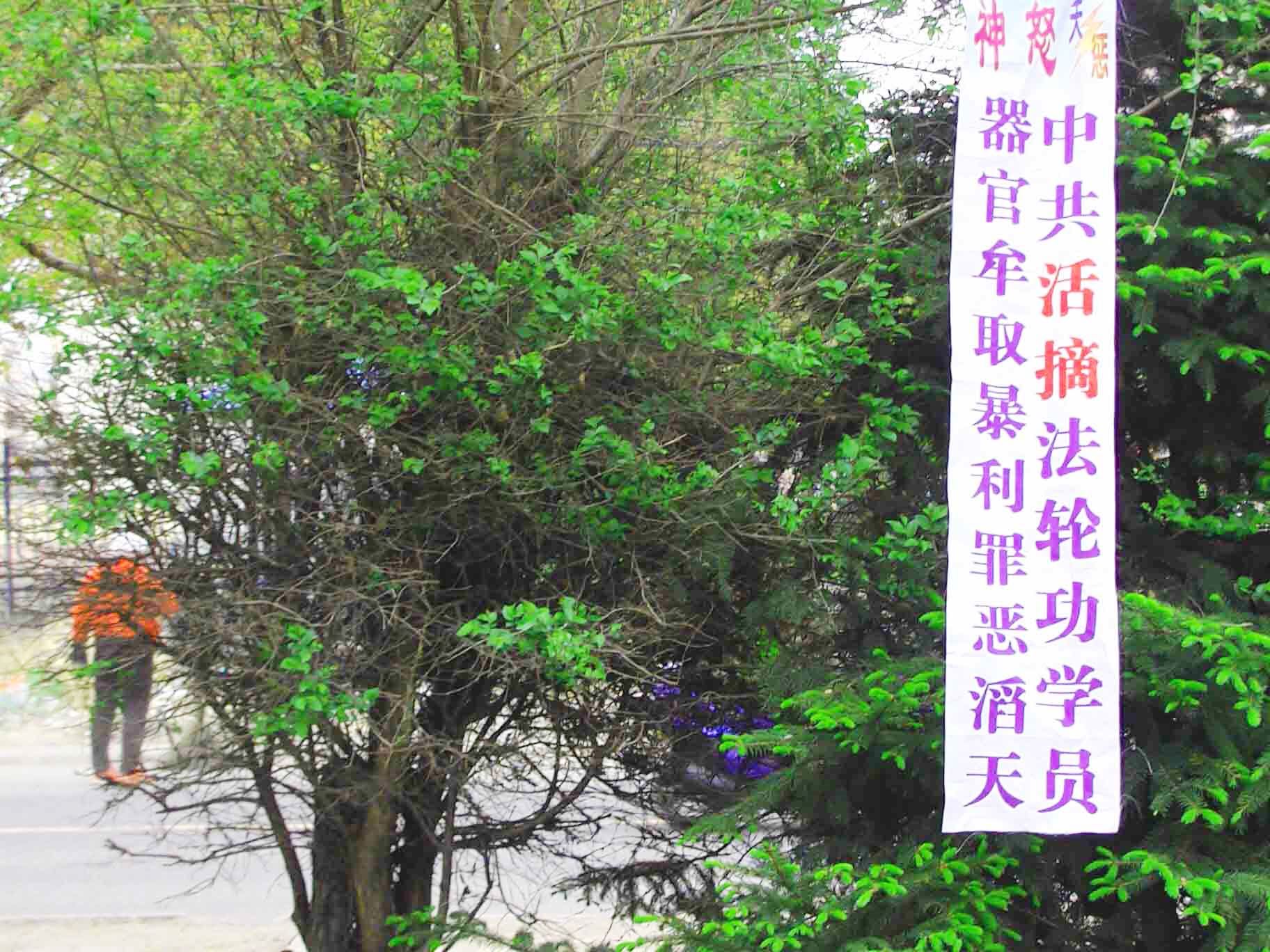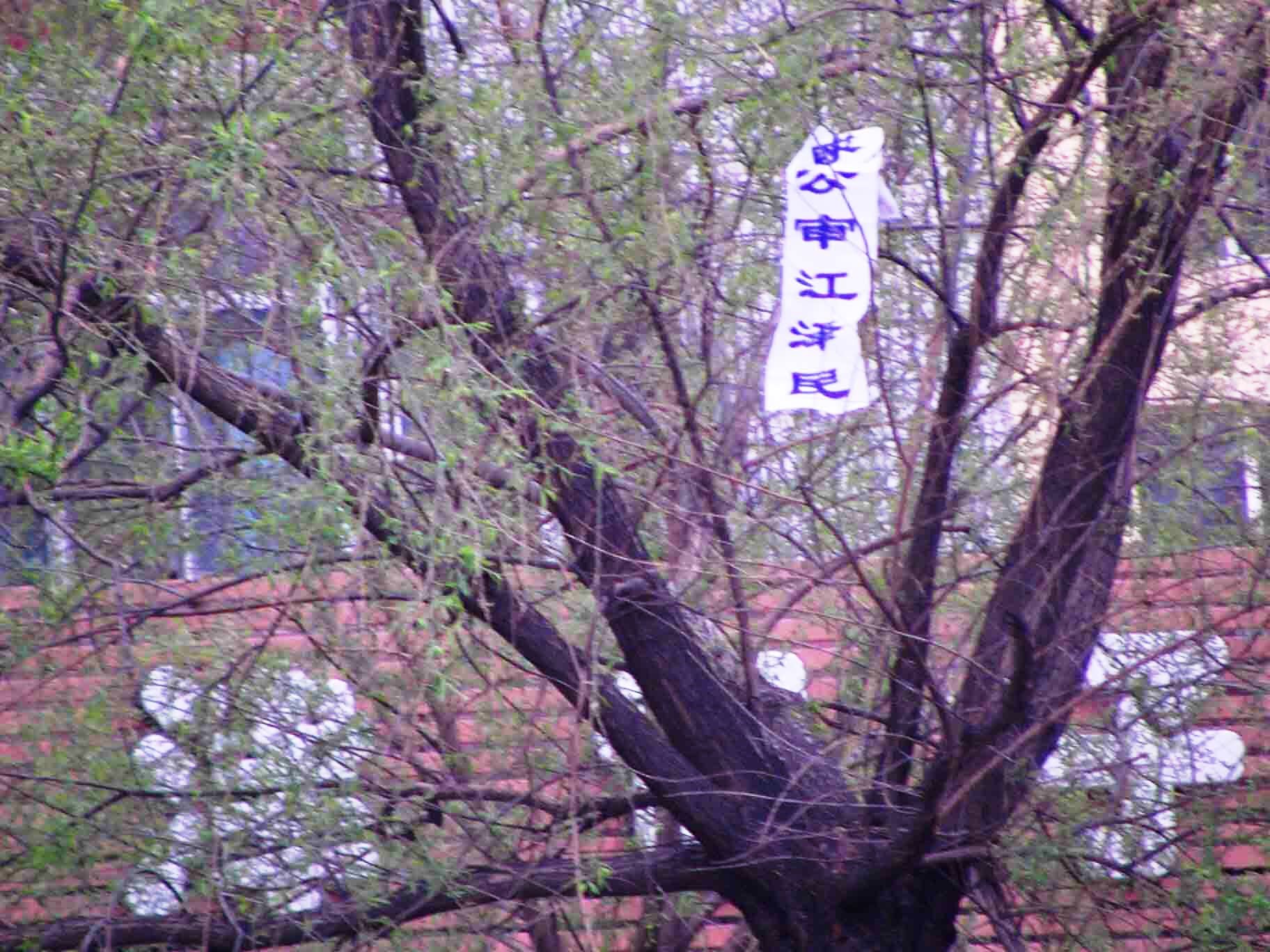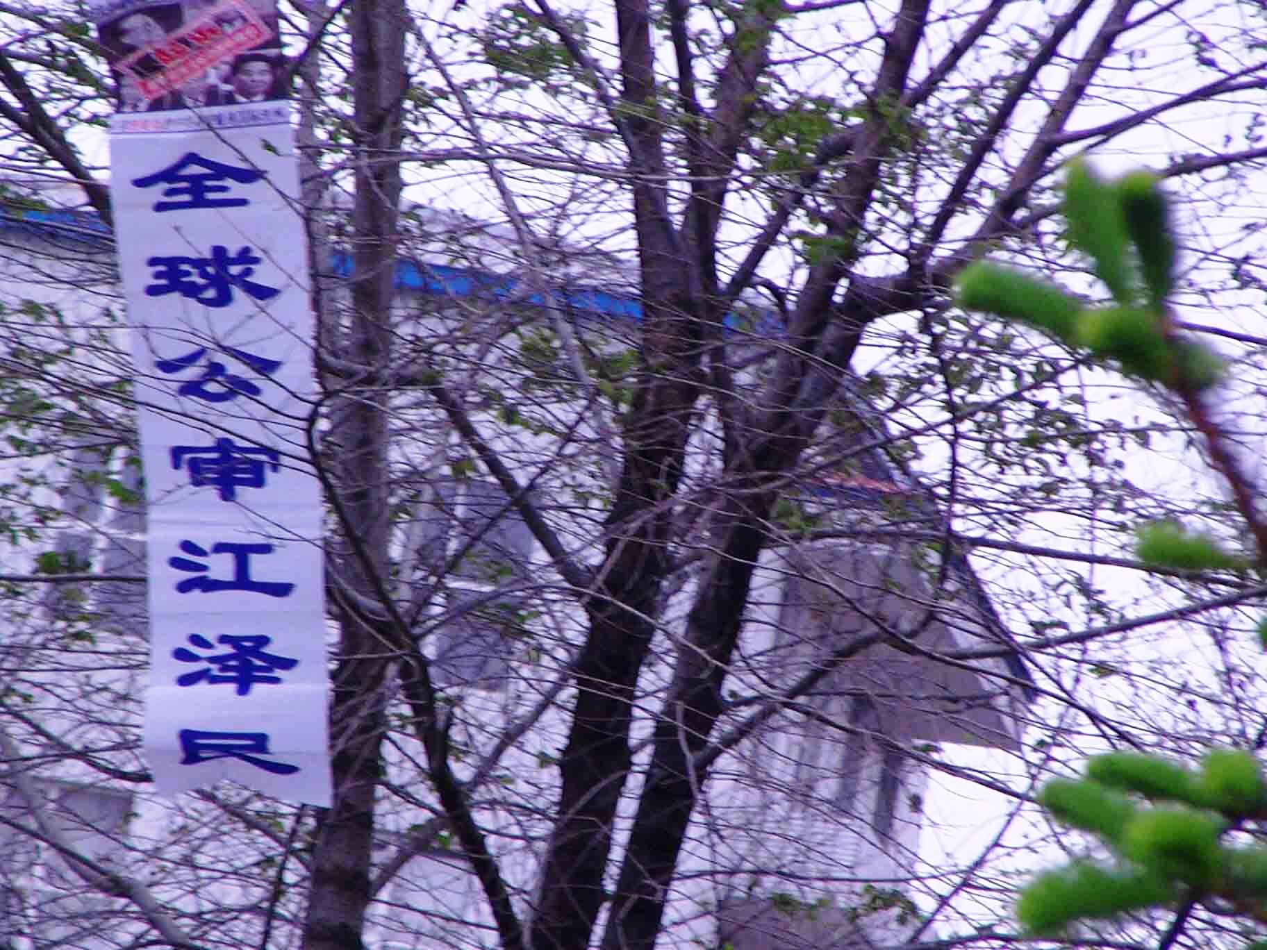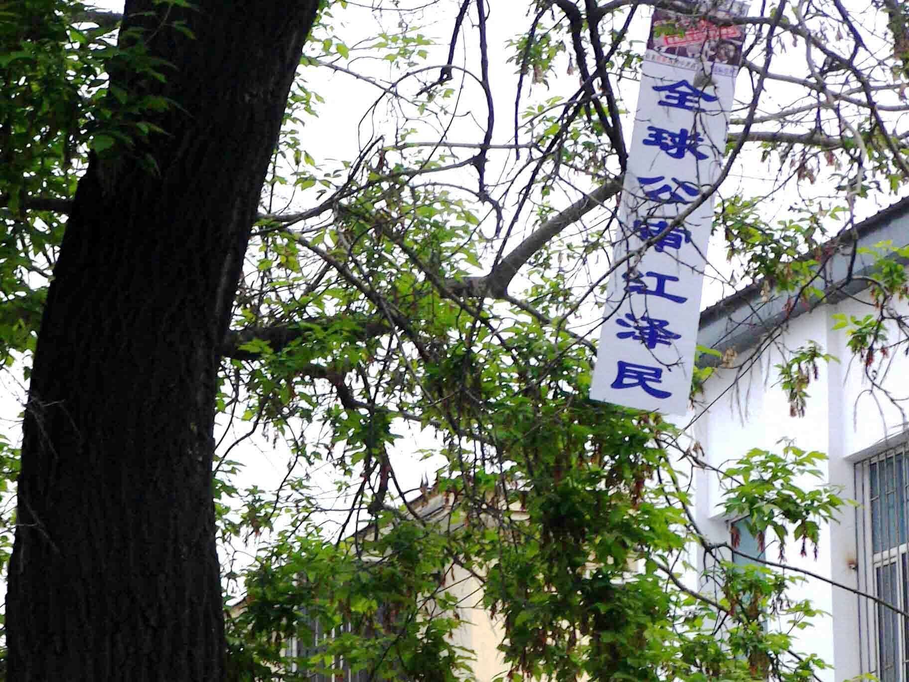 保命”以及“全球公审江泽民”等真相条幅或胶贴。