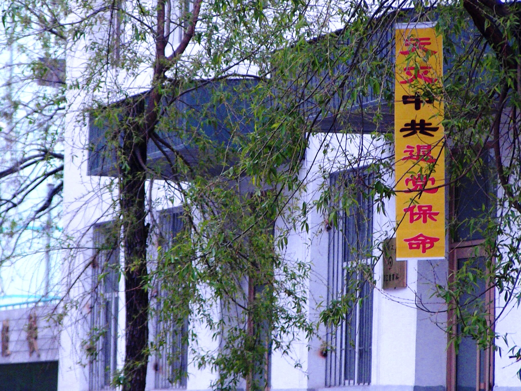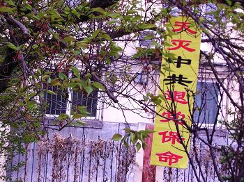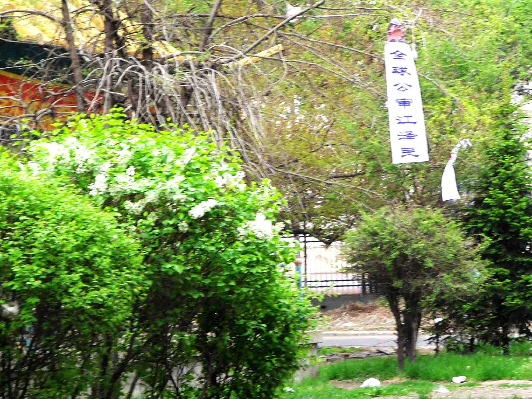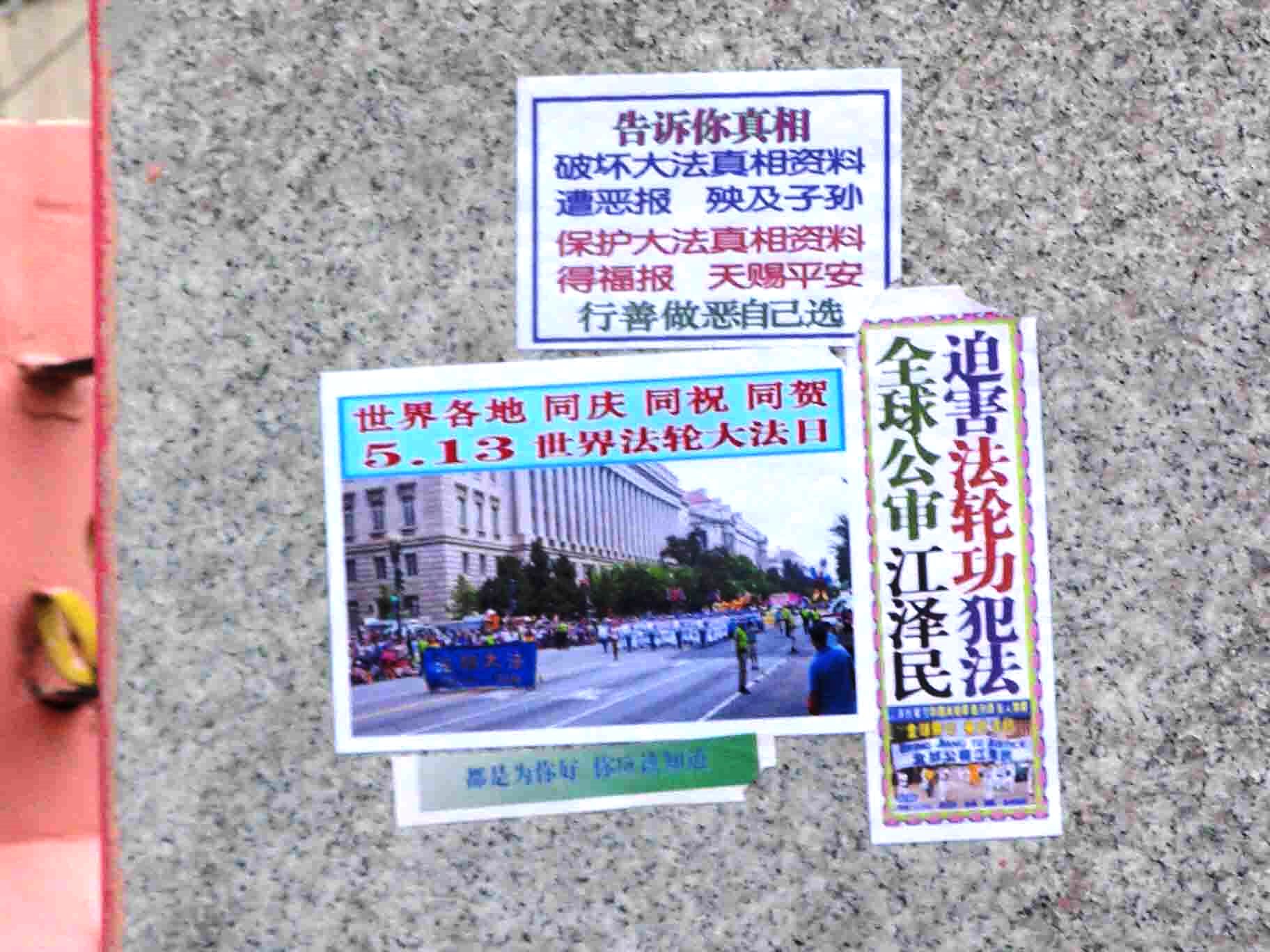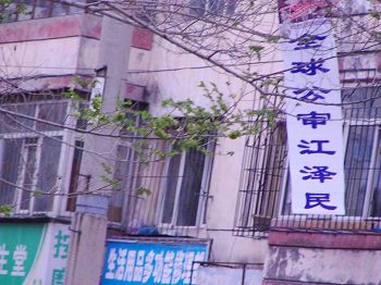 保命”以及“全球公审江泽民”等真相条幅或胶贴。